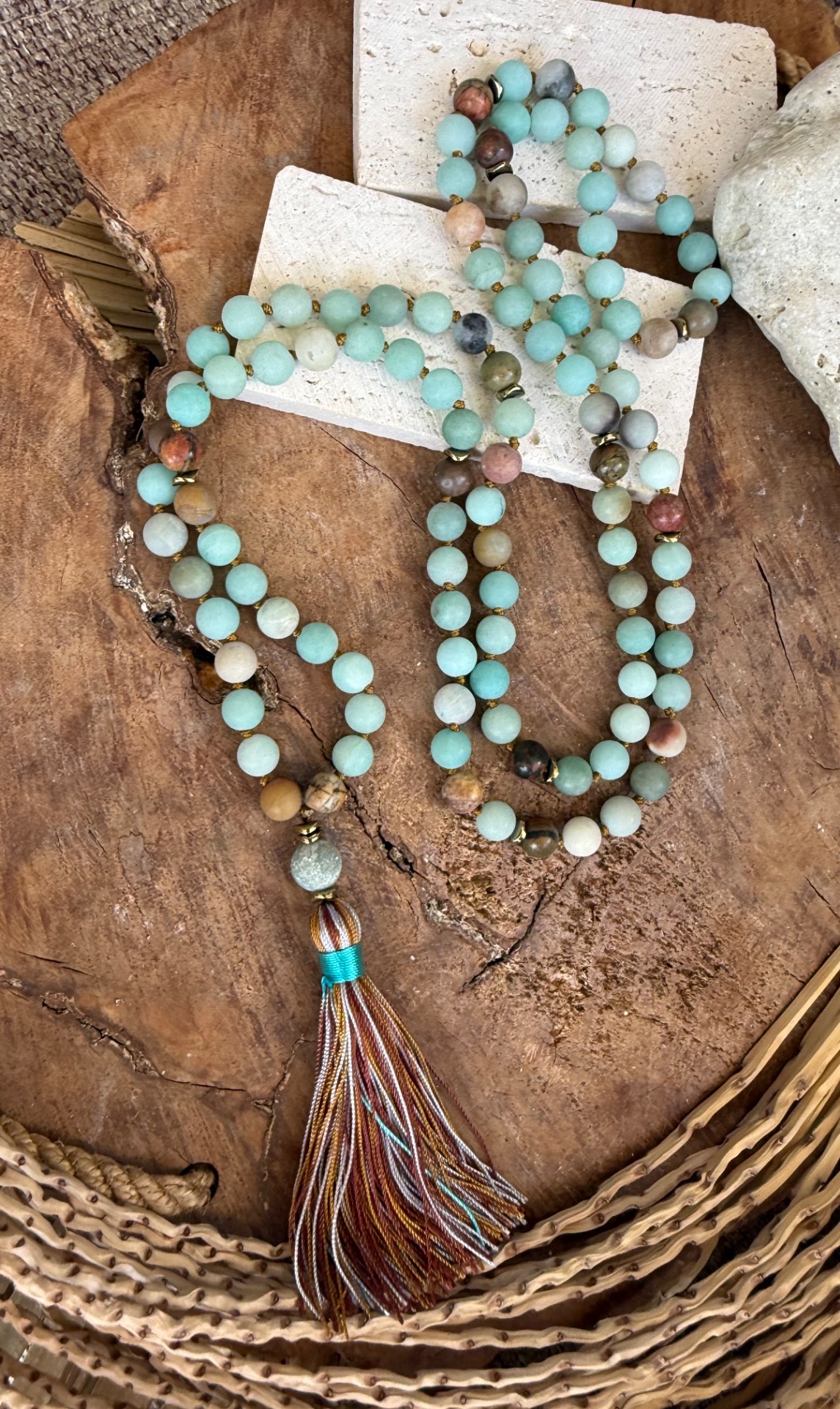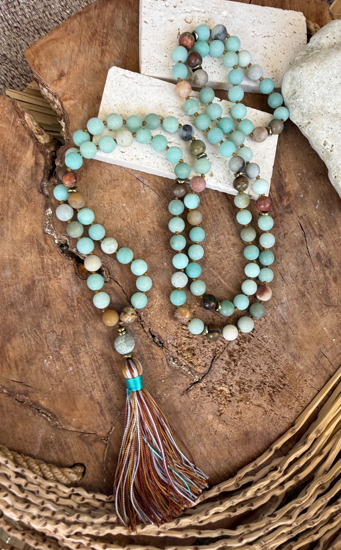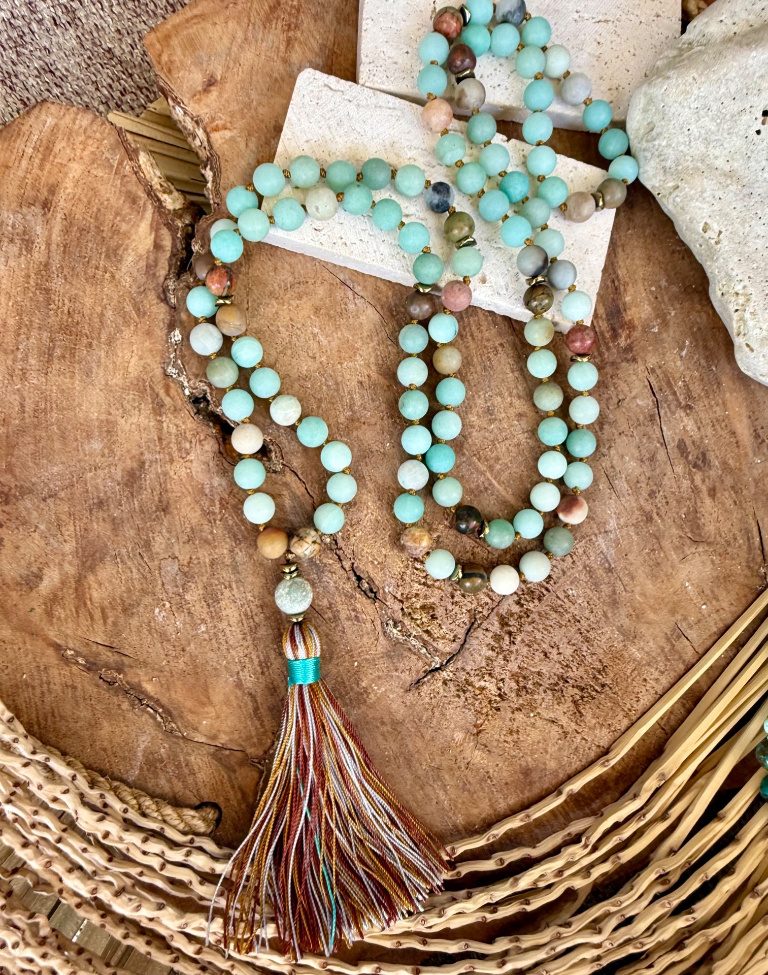 Prírodný matný amazonit (8 mm) – Tento nádherný minerál so zamatovým povrchom vyžaruje jemnú, upokojujúcu energiu. Jeho odtiene pripomínajú pokojnú vodnú hladinu, prinášajú vnútorný mier a harmóniu. Ručne viazané uzlíky medzi korálkami – Každá korálka je precízne oddelená uzlíkom, čo zabezpečuje plynulé prechádzanie prstami pri recitovaní mantier a zároveň predlžuje životnosť náhrdelníka. Guru bead 109ta korálka nad strapčekom umocňuje zámer. Ukončený zemitým strapčekom.
