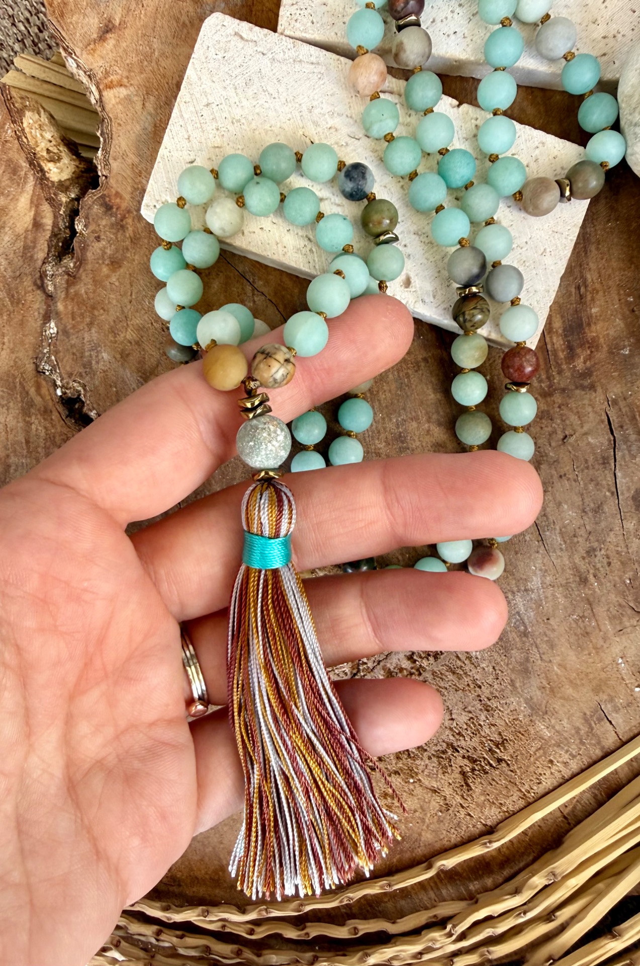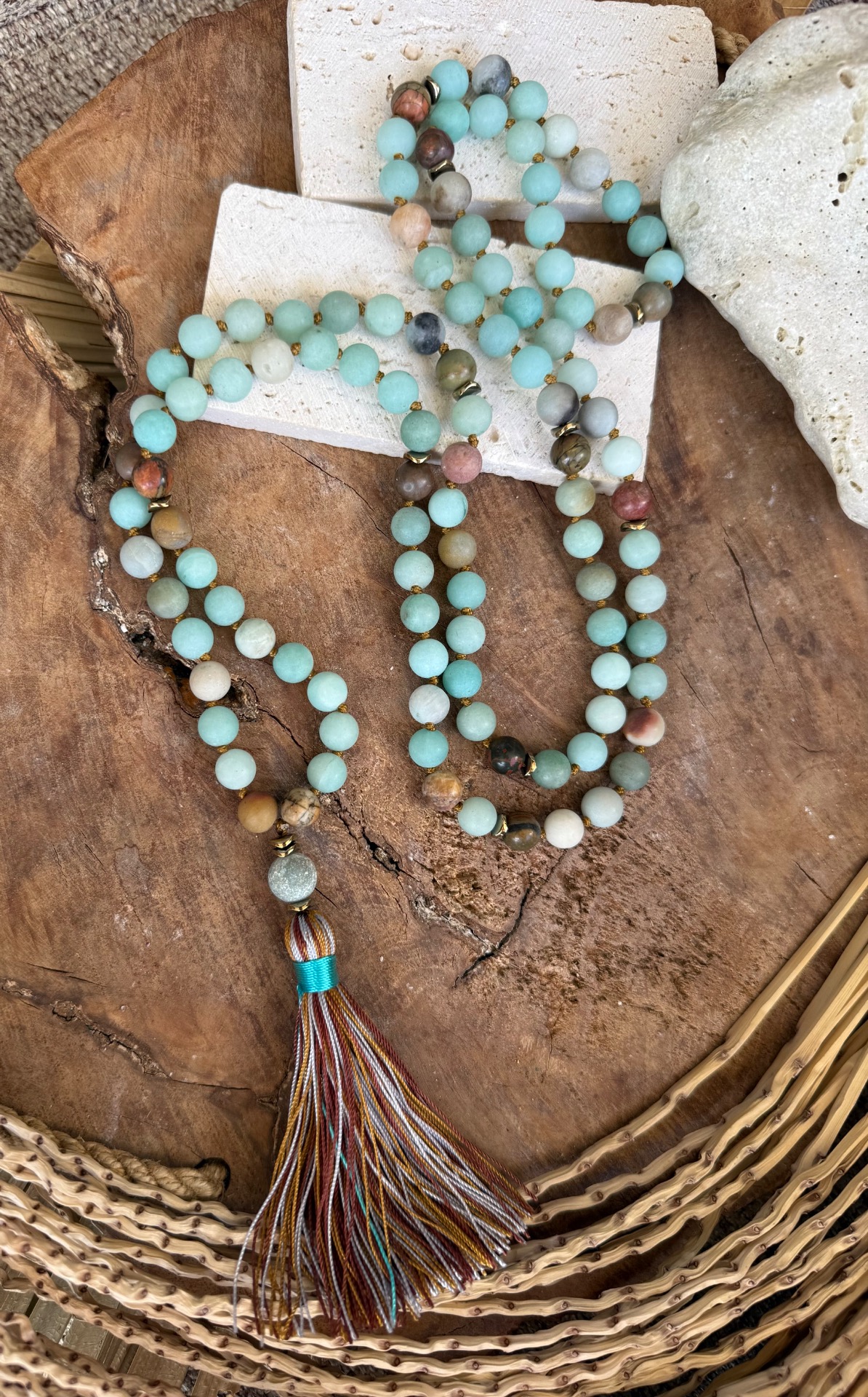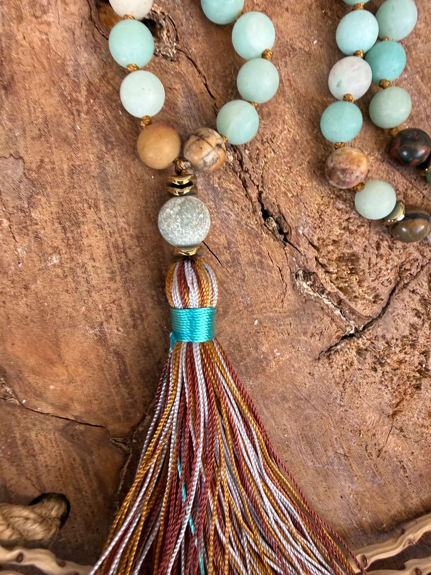 Prírodný matný amazonit (8 mm) – Tento nádherný minerál so zamatovým povrchom vyžaruje jemnú, upokojujúcu energiu. Jeho odtiene pripomínajú pokojnú vodnú hladinu, prinášajú vnútorný mier a harmóniu. Ručne viazané uzlíky medzi korálkami – Každá korálka je precízne oddelená uzlíkom, čo zabezpečuje plynulé prechádzanie prstami pri recitovaní mantier a zároveň predlžuje životnosť náhrdelníka. Guru bead 109ta korálka nad strapčekom umocňuje zámer. Ukončený zemitým strapčekom.