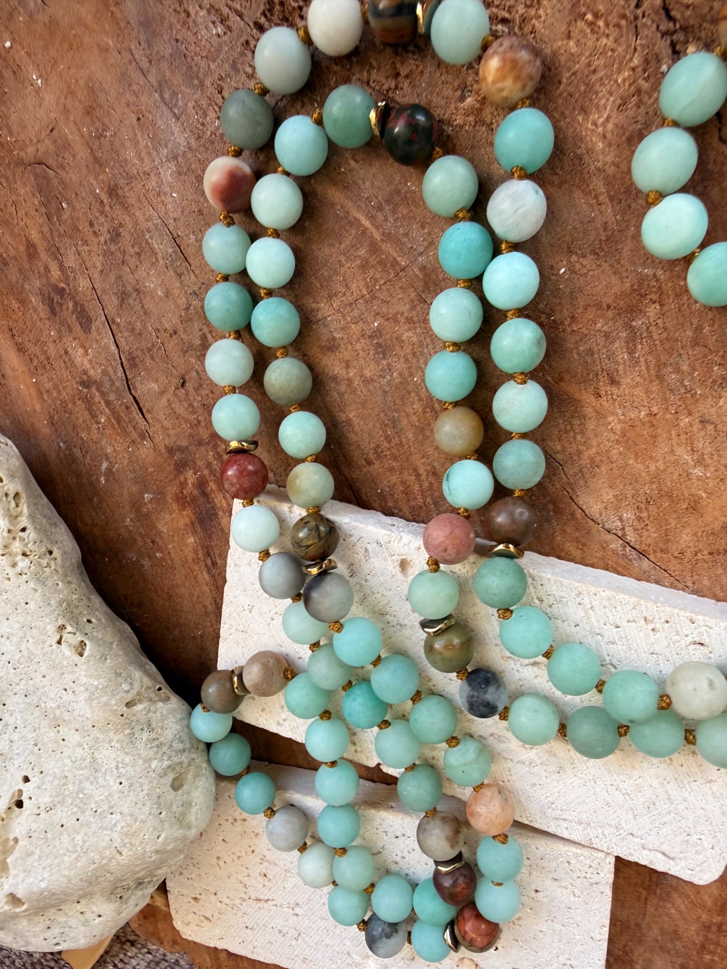 108-korálkový japa mala náhrdelník z matného amazonitu – pokoj a harmónia v každej korálke Objavte silu meditácie s týmto ručne viazaným 108-korálkovým japa mala náhrdelníkom, ktorý je nielen krásnym doplnkom, ale aj mocným duchovným nástrojom.