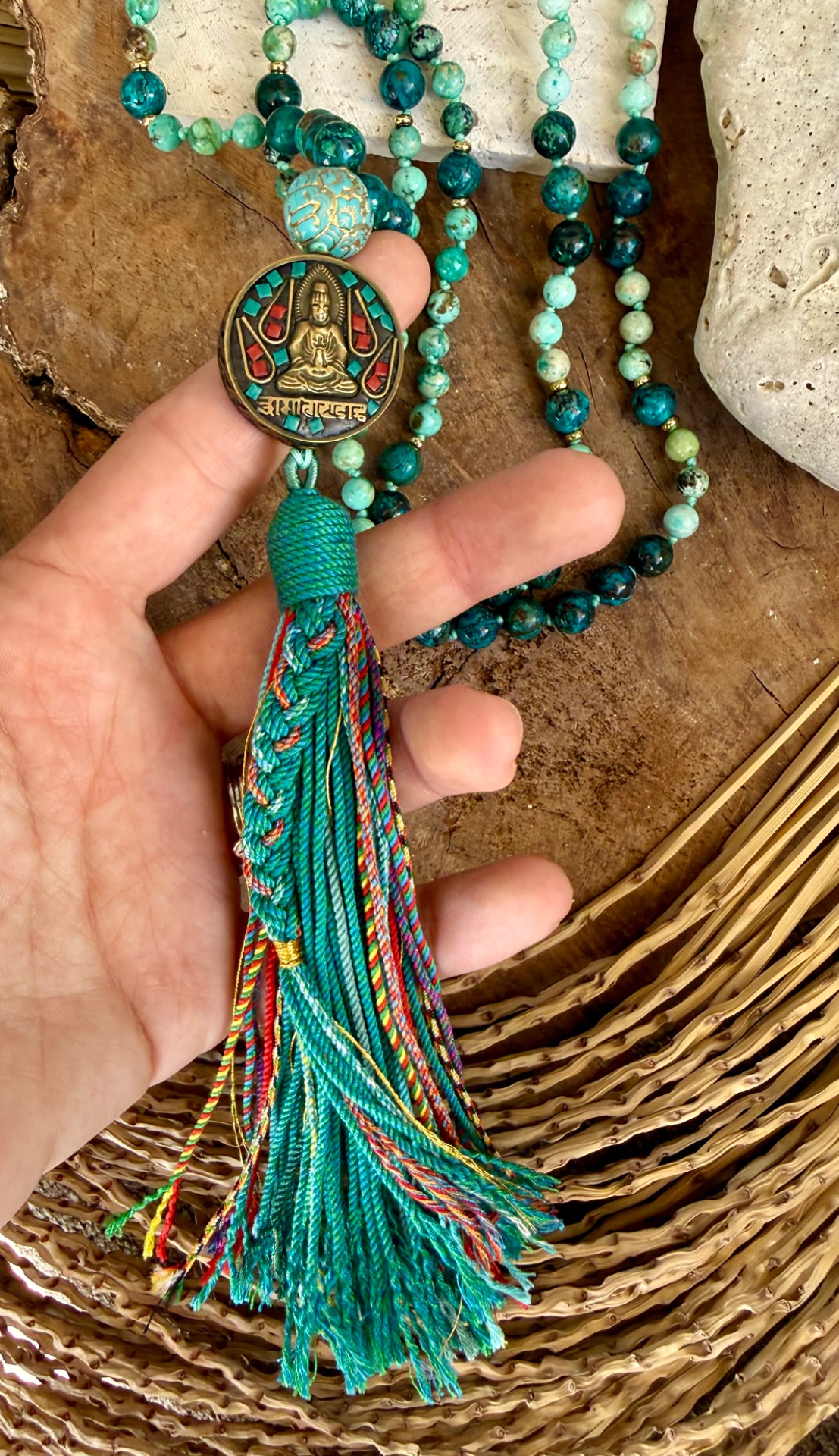 Dominantným prvkom je guru bead v podobe nepálskej korálky s motívom Buddhu, ktorý symbolizuje mier, vedomie a návrat k podstate. Výrazný tyrkysový strapec dodáva náhrdelníku jedinečný boho charakter a zároveň predstavuje uvoľnenie a plynutie energie.
