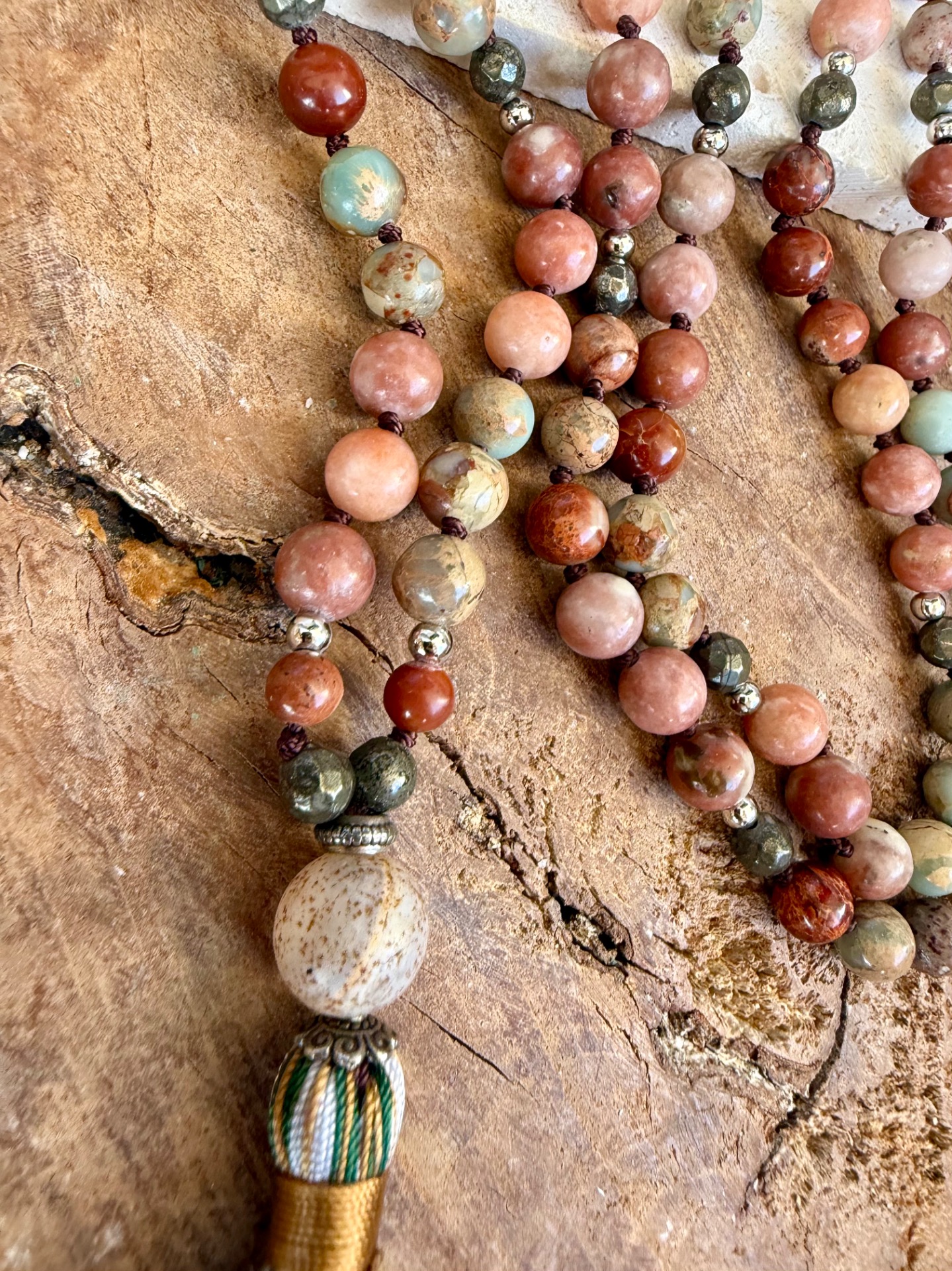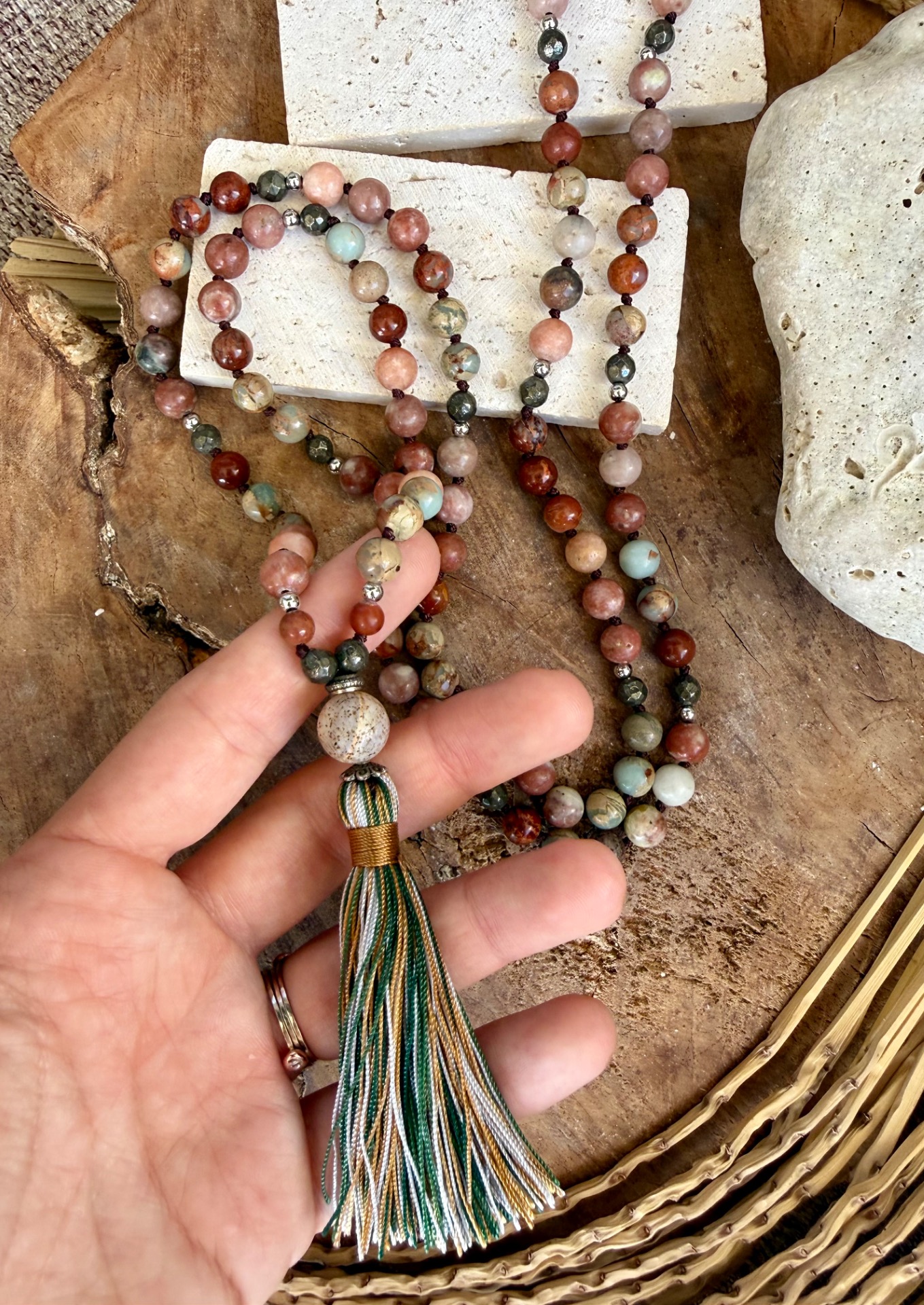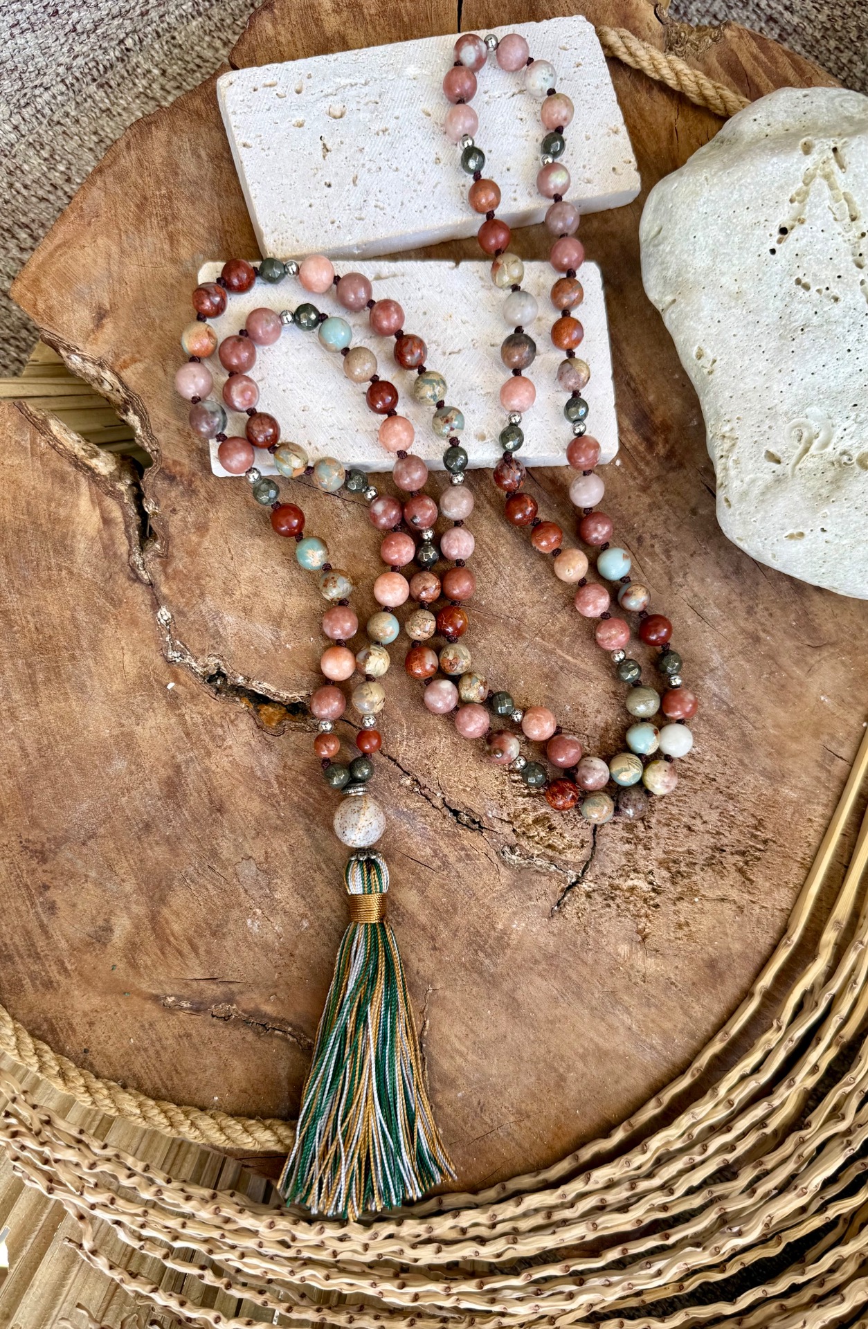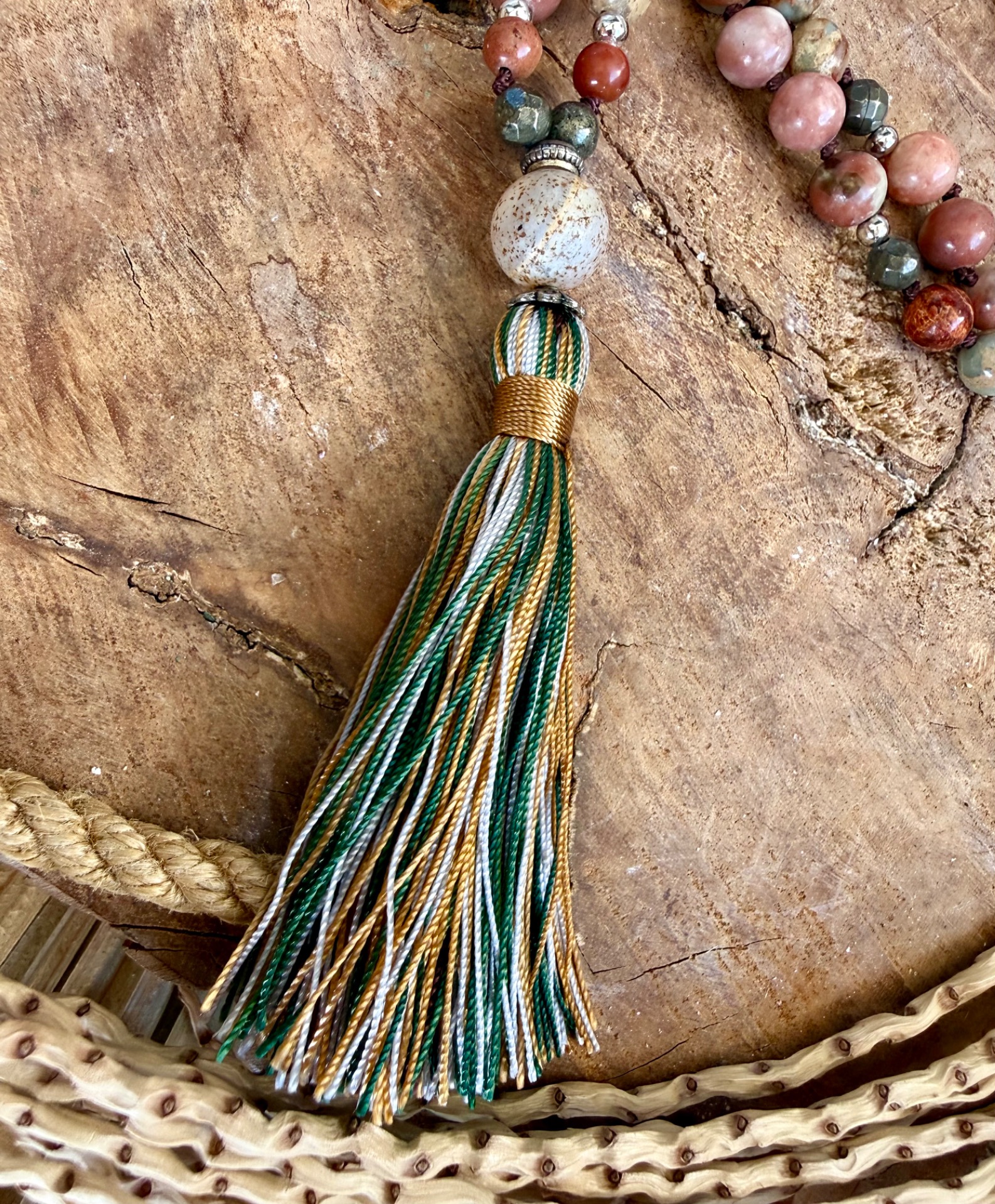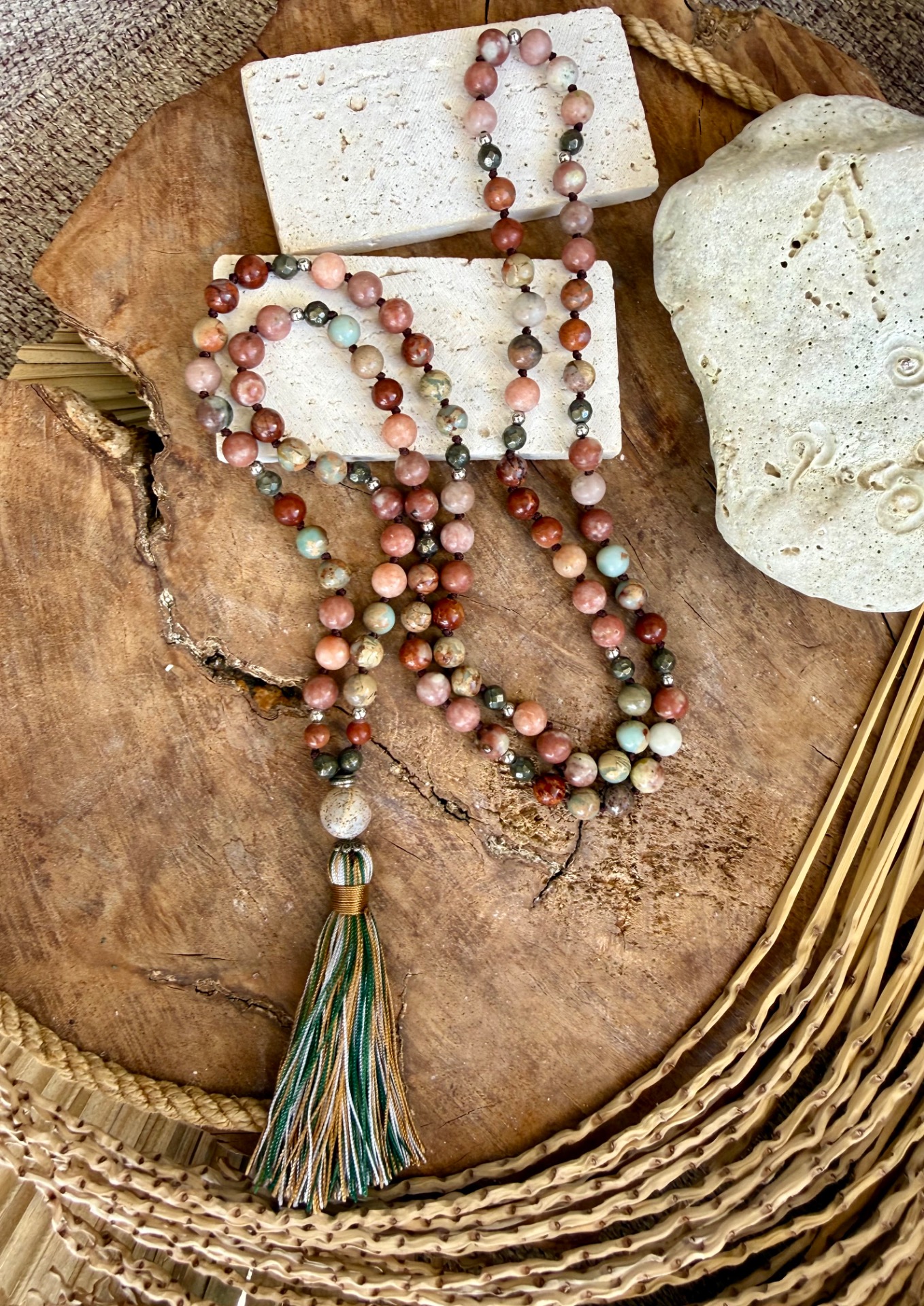 108 japa mala náhrdelník z minerálov rodonitu a jaspisu – Láska, sebaláska a ženská energia