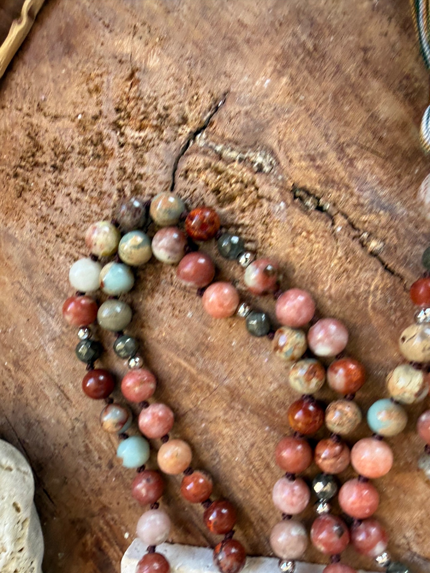 Tento ručne vyrobený japa mala náhrdelník z rodonitu a jaspisu je energetickým nástrojom pre ženy, ktoré hľadajú rovnováhu, sebalásku a silu svojej vnútorné ženskosti. Každá z 108 korálok je oddelená jemným uzlíkom, čo zvyšuje jeho silu pri meditáciách a duchovných praktikách. Tento náhrdelník je skvelým pomocníkom pri práci so srdcovou čakrou a pri zameraní na lásku a sebalásku.