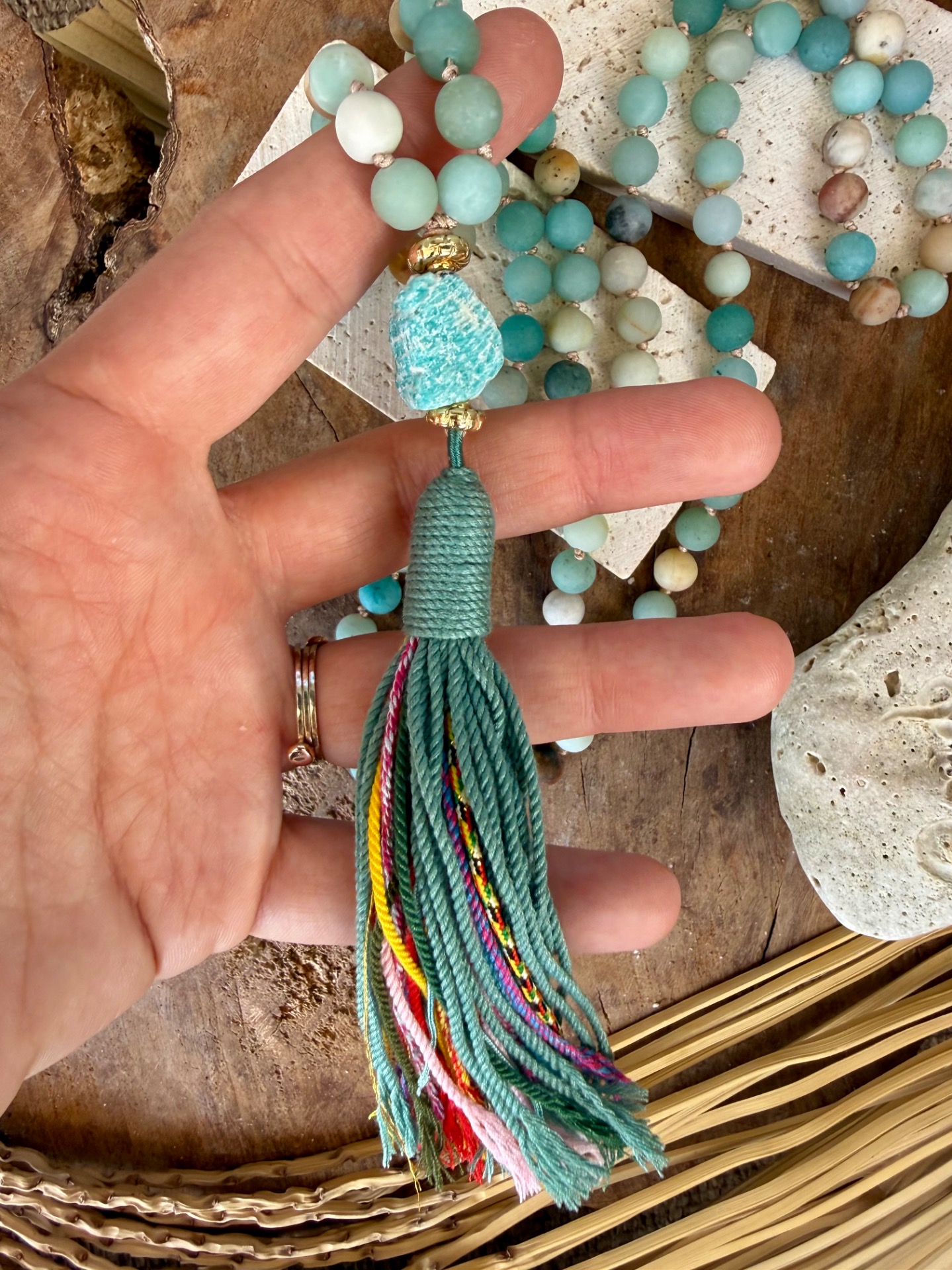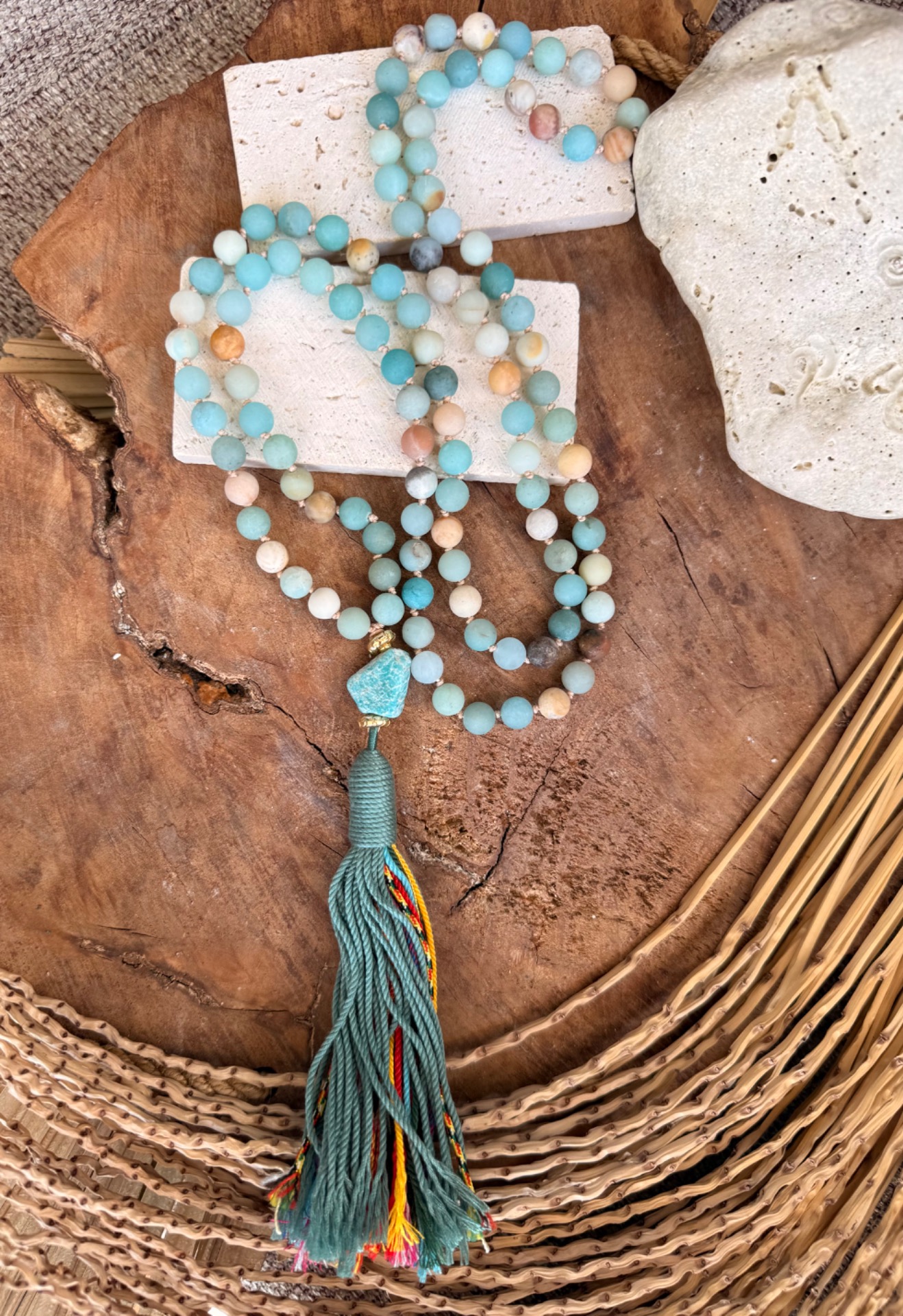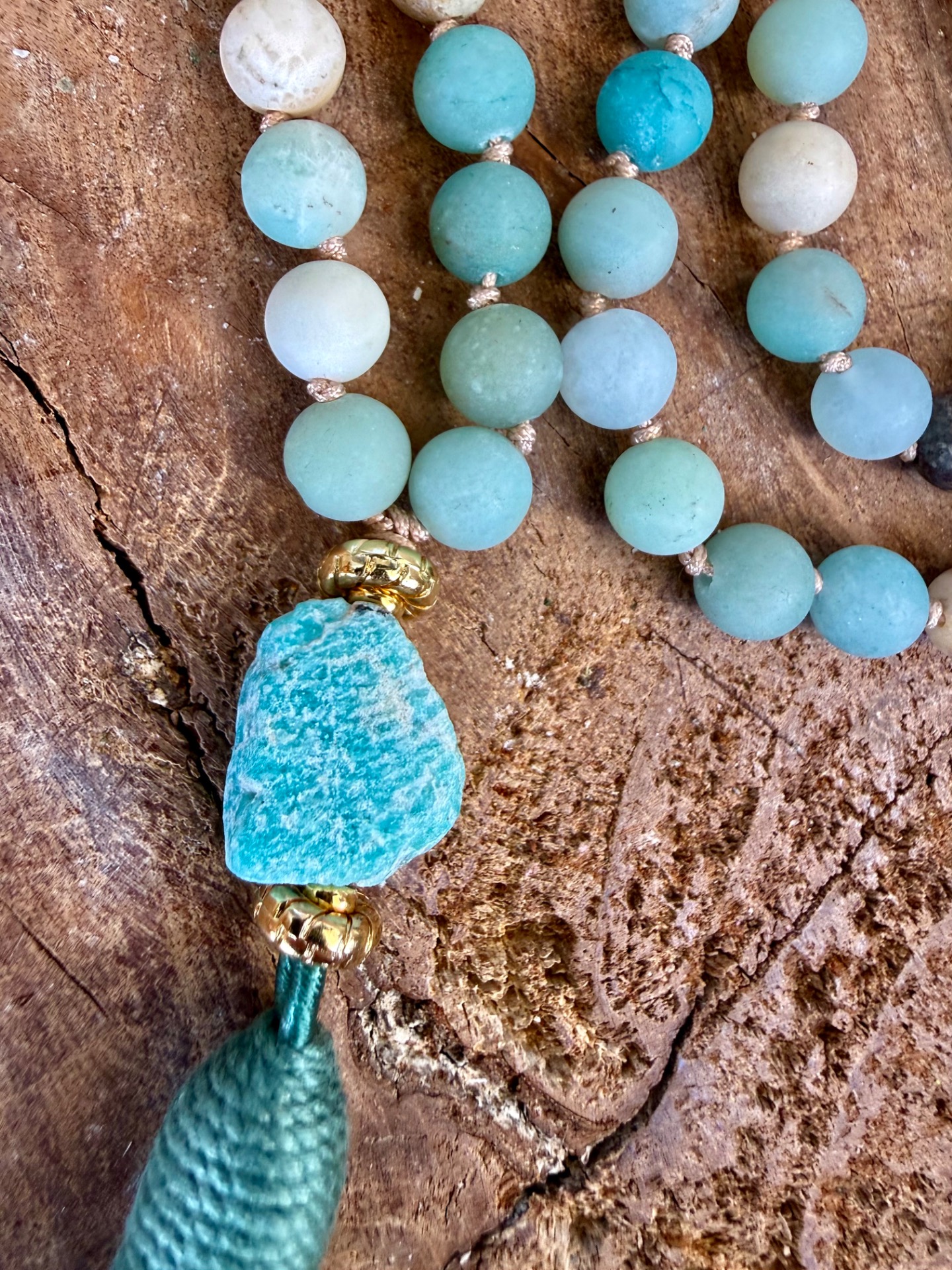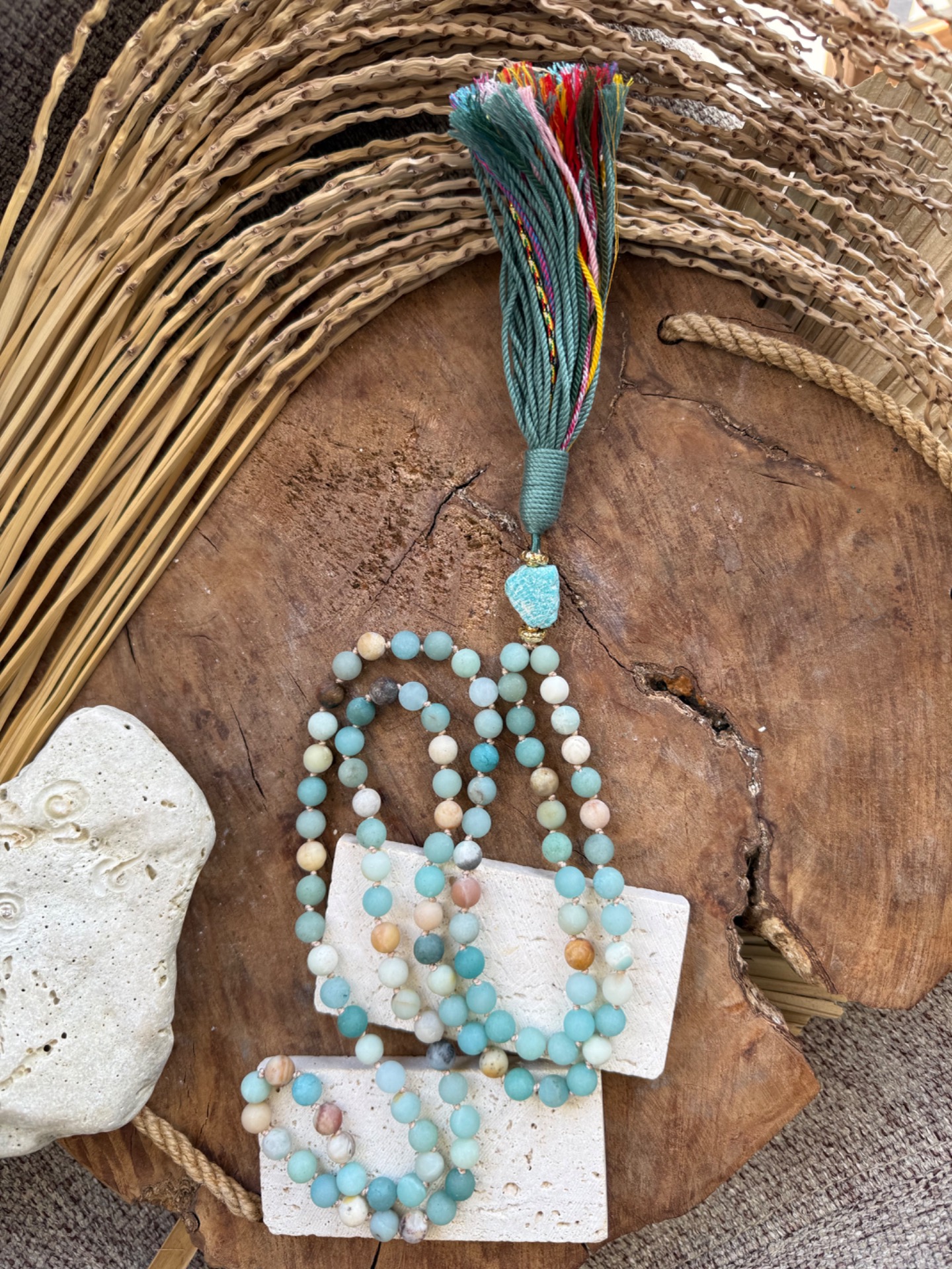 Prírodný matný amazonit (8 mm) – Tento nádherný minerál so zamatovým povrchom vyžaruje jemnú, upokojujúcu energiu. Jeho odtiene pripomínajú pokojnú vodnú hladinu, prinášajú vnútorný mier a harmóniu. Ručne viazané uzlíky medzi korálkami – Každá korálka je precízne oddelená uzlíkom, čo zabezpečuje plynulé prechádzanie prstami pri recitovaní mantier a zároveň predlžuje životnosť náhrdelníka. Guru bead 109ta korálka nad strapčekom umocňuje zámer surový amazonit. Ukončený modrým strapčekom.