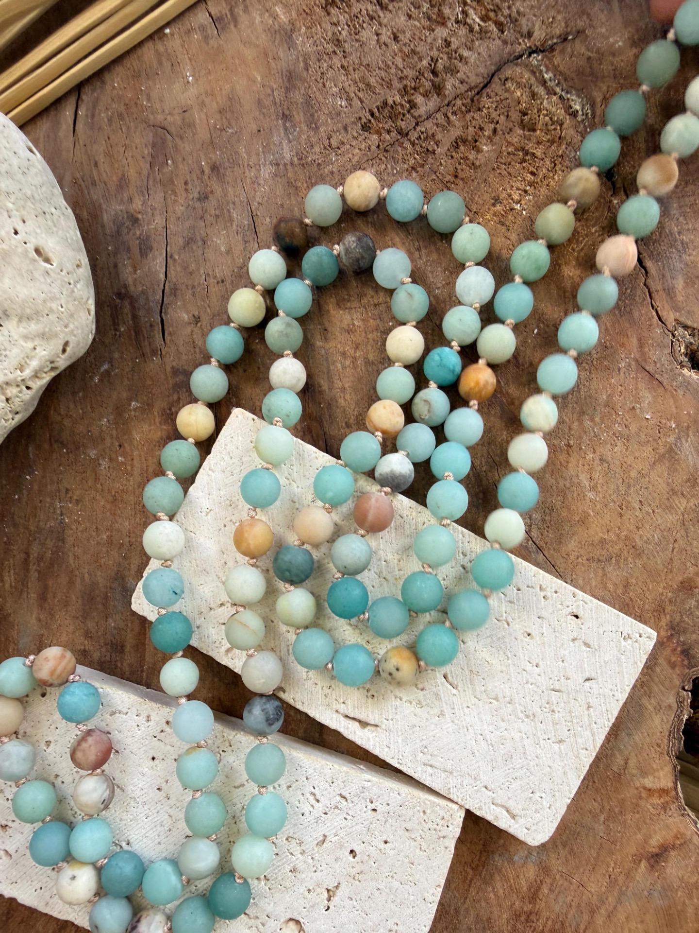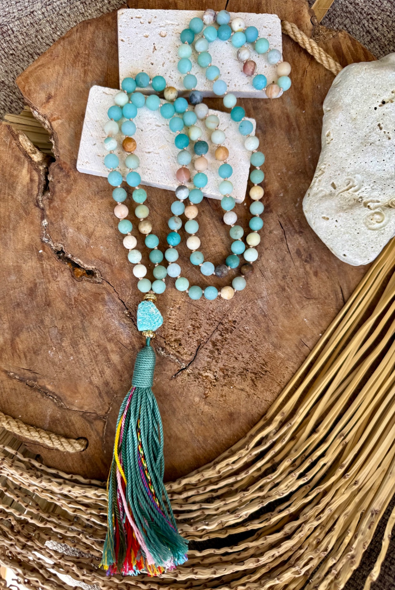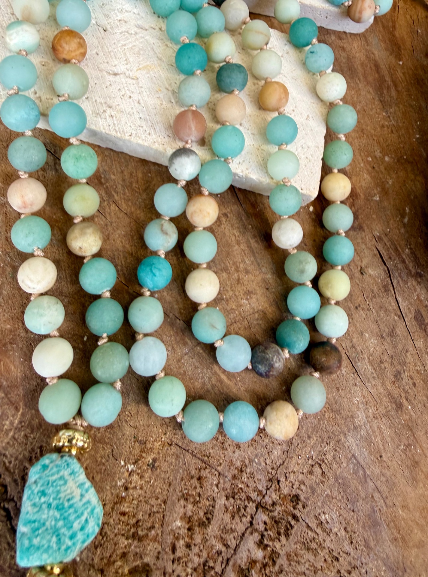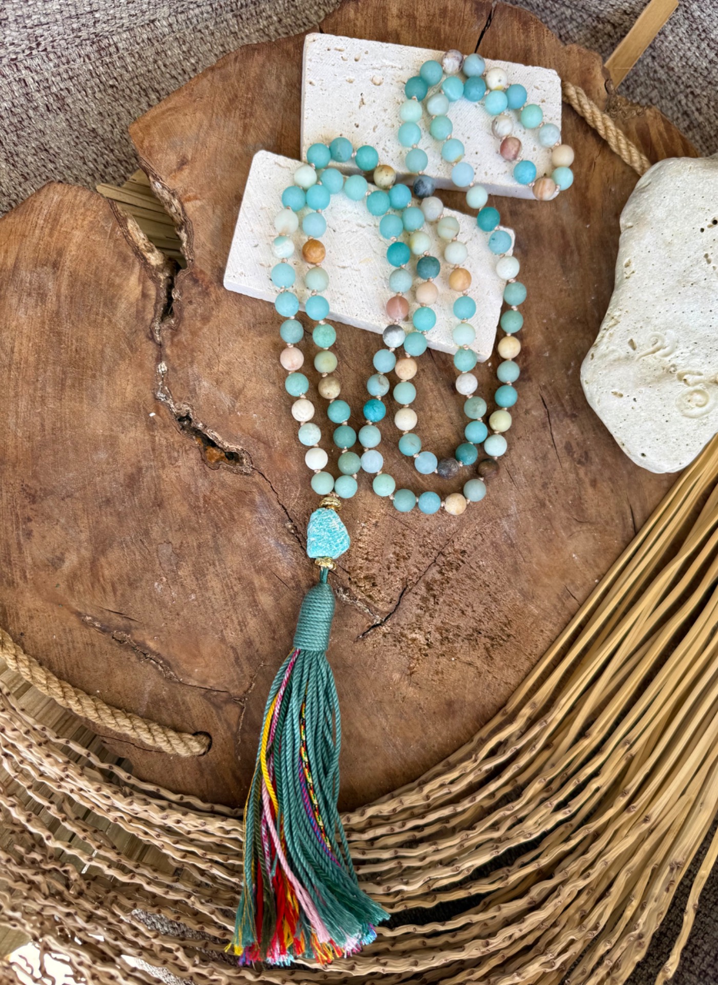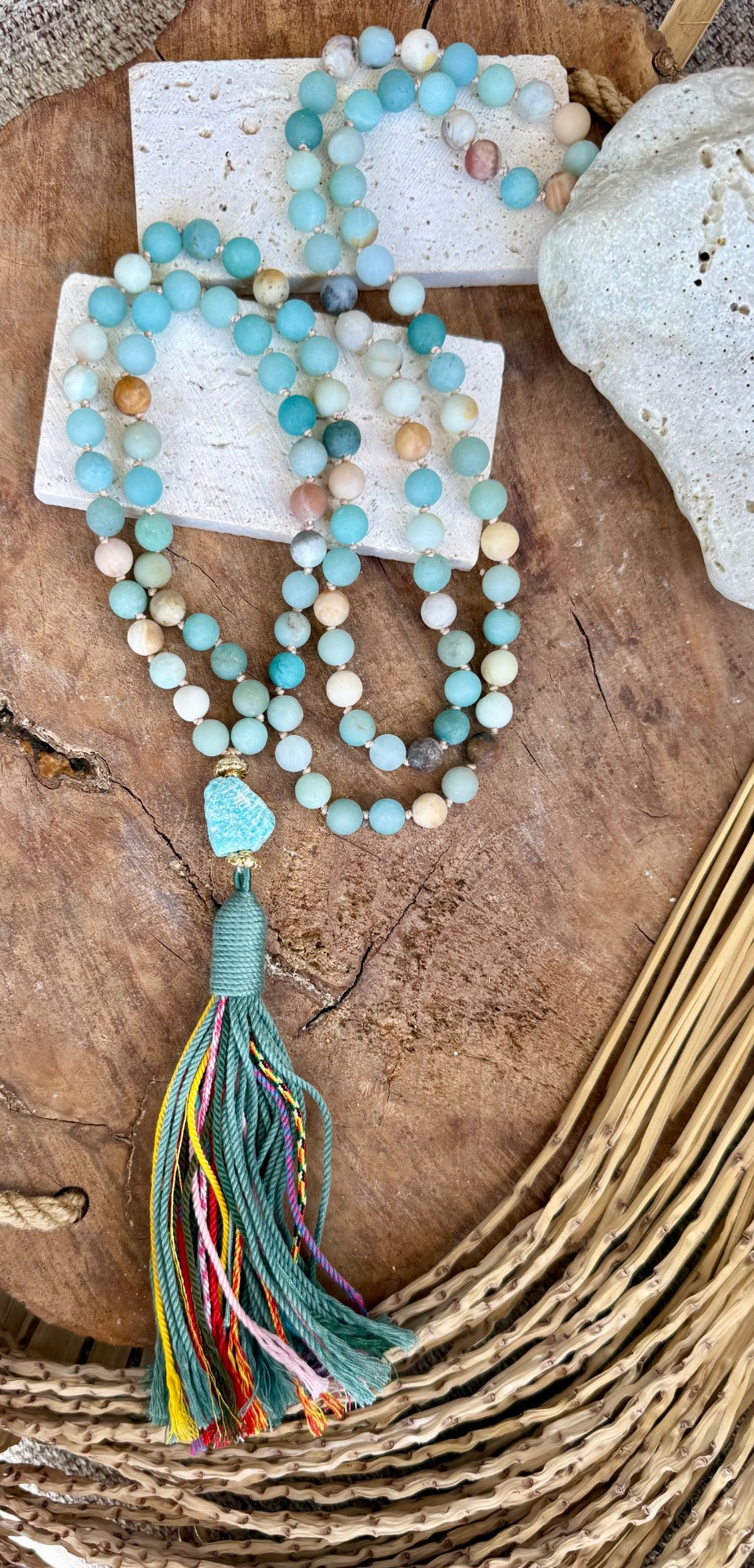 108-korálkový japa mala náhrdelník z matného amazonitu – pokoj a harmónia v každej korálke Objavte silu meditácie s týmto ručne viazaným 108-korálkovým japa mala náhrdelníkom, ktorý je nielen krásnym doplnkom, ale aj mocným duchovným nástrojom.