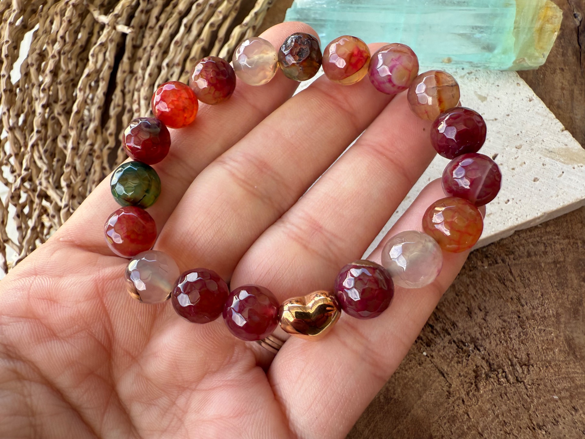 Náramok z achátu krajkového dofarbovaný ,fazet výbrus 10mm. Nerezové srdiečko.