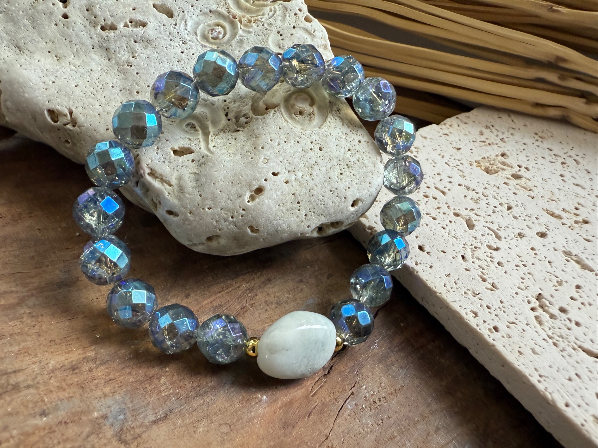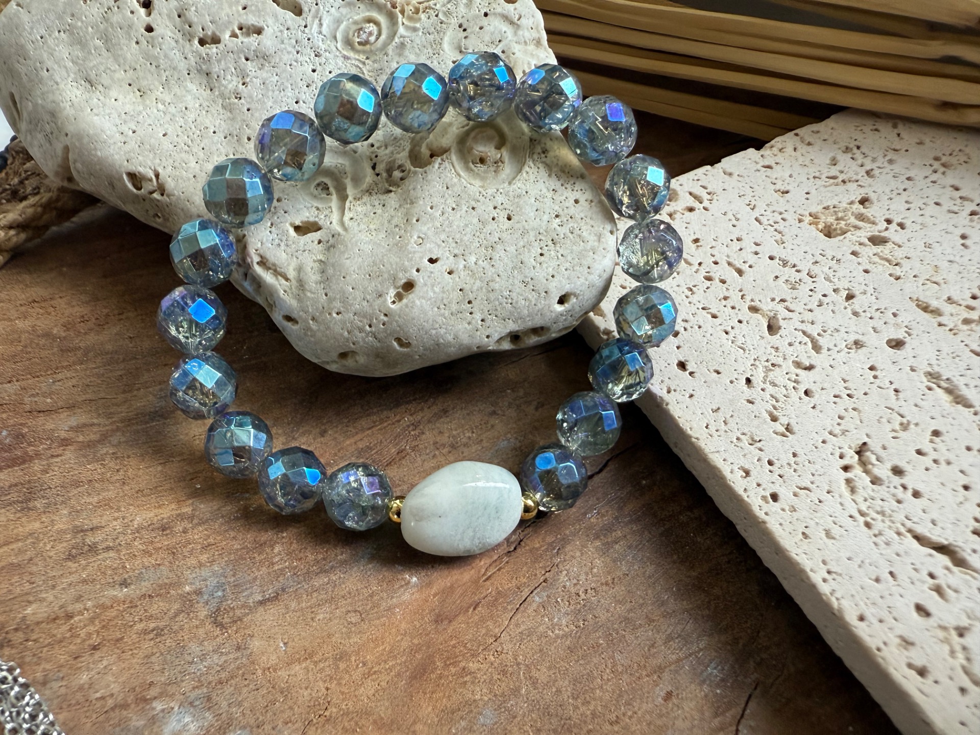 Náramok z minerálu aqua aura krištáľ praskaný 10mm fazet výbrus + akvamarín - delfín
