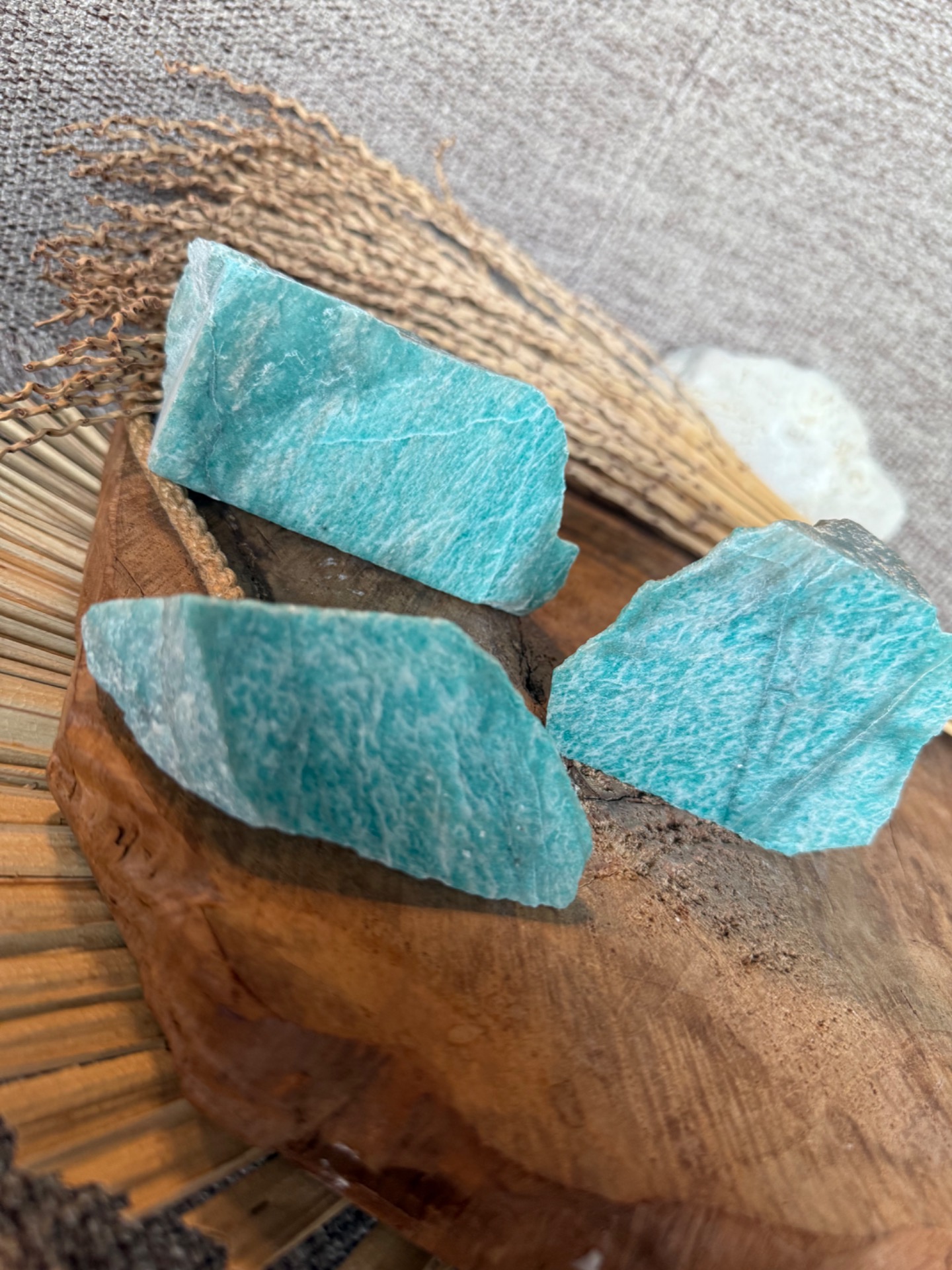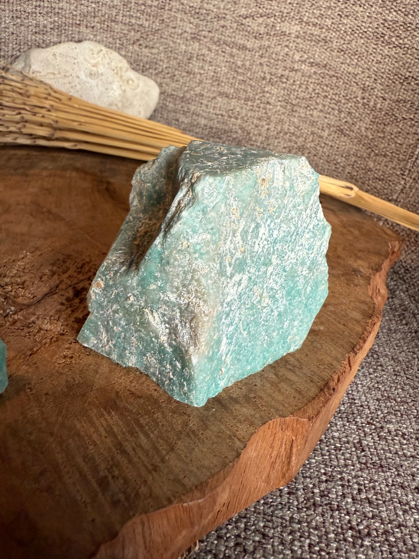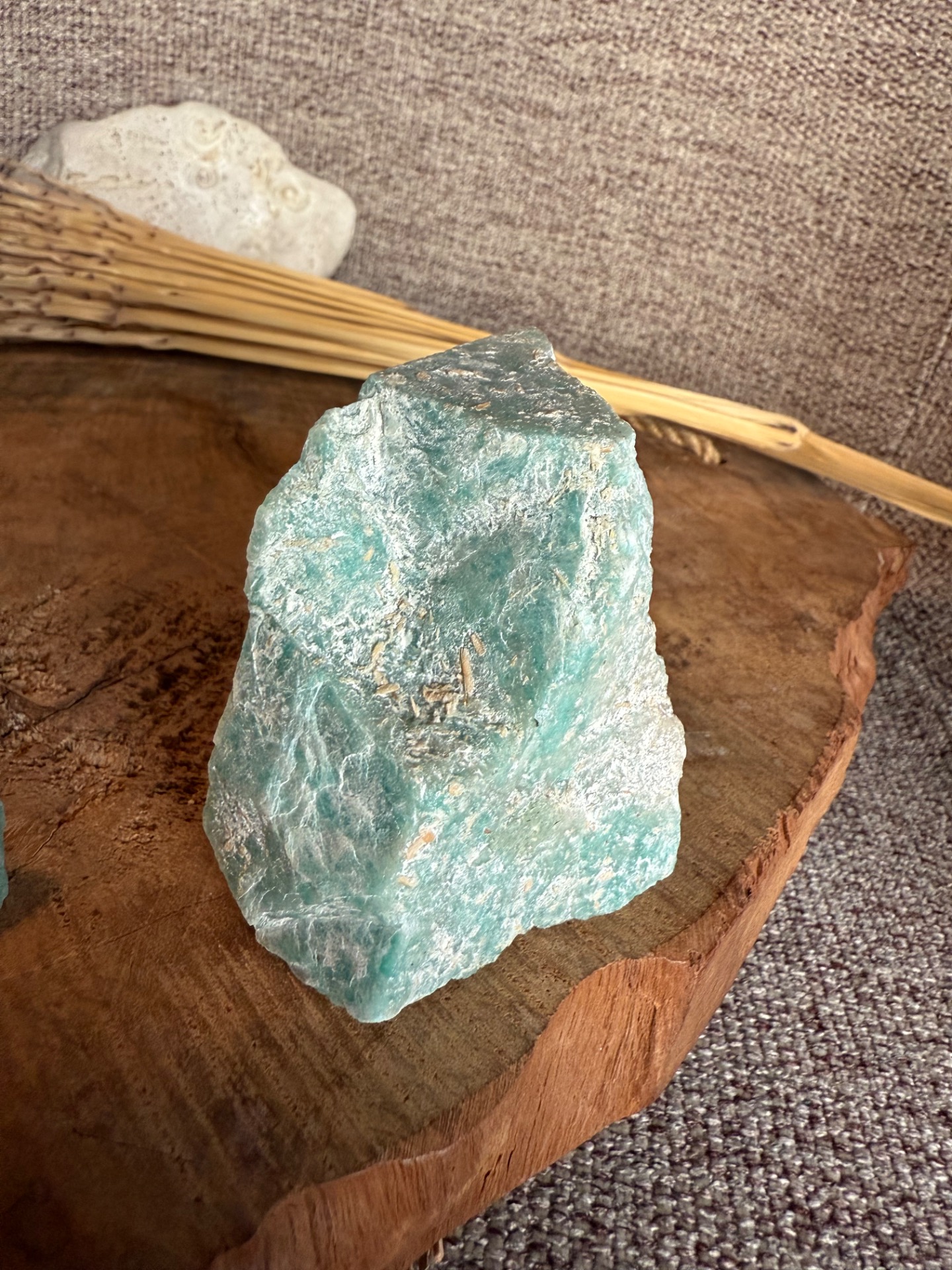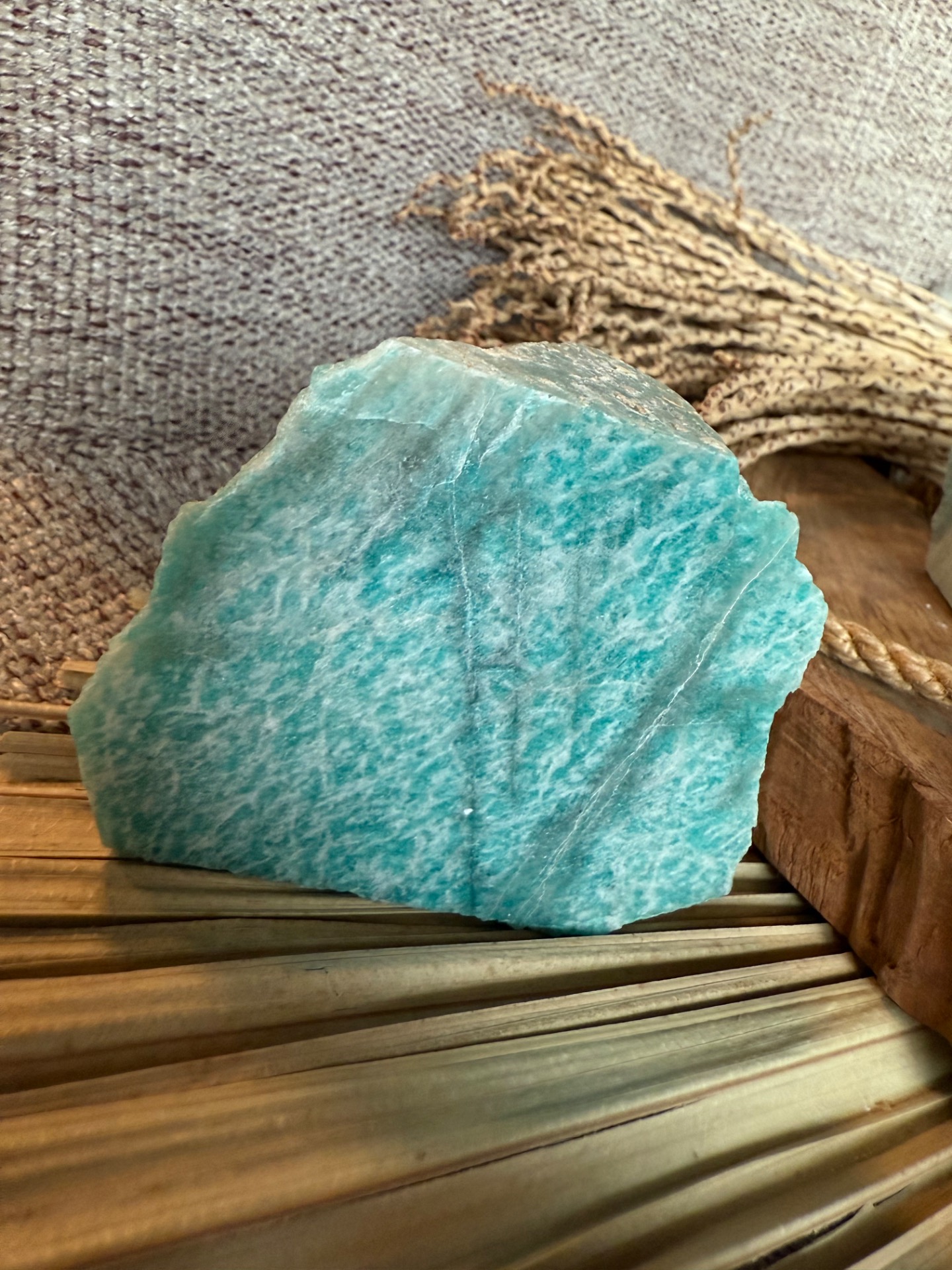 Objavte krásu a energiu amazonitu v jeho prirodzenom tvare. Tento kameň kombinuje autentickú surovú textúru s jemne leštenou stranou, ktorá zvýrazňuje jeho charakteristický tyrkysovo-zelený odtieň a prirodzený lesk. Každý kus je jedinečný a zachováva krásu prírody vo svojej autentickej forme.