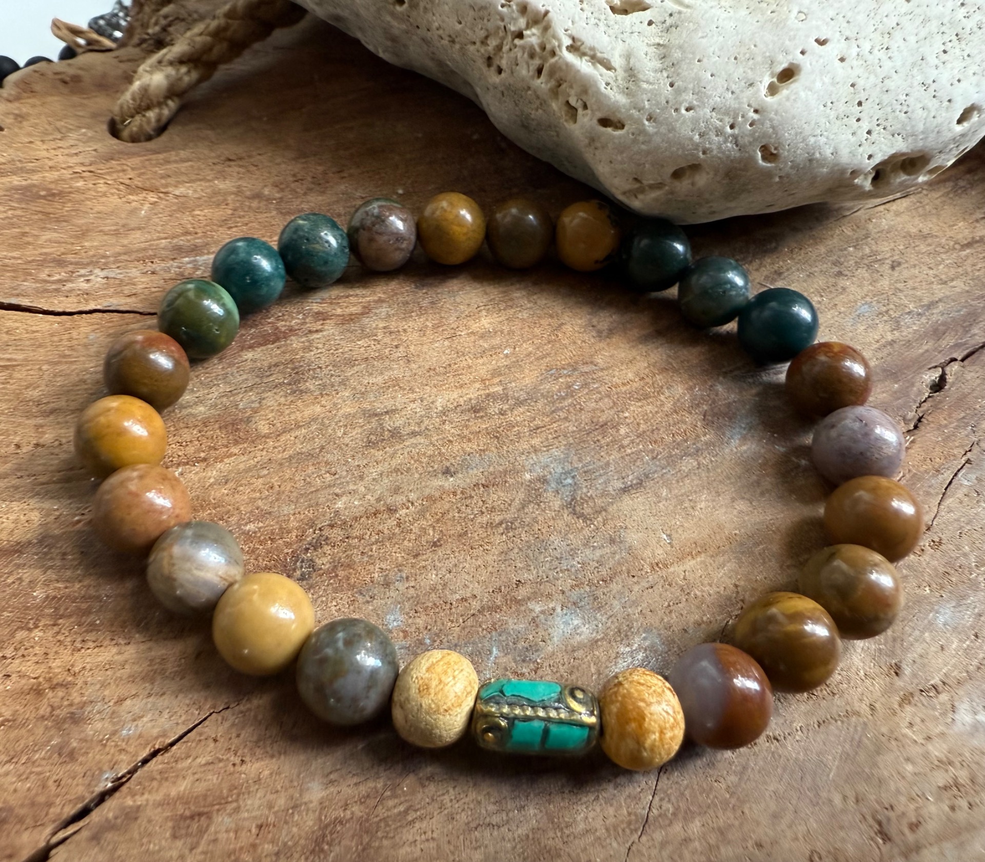"Dych zeme" – pánsky náramok z pestrého achátu, Palo Santa a nepálskej korálky