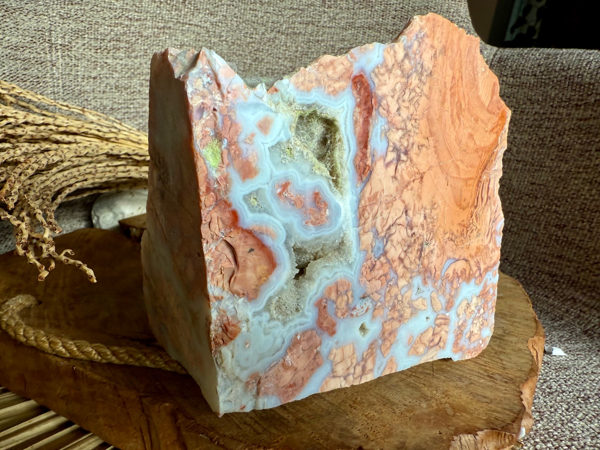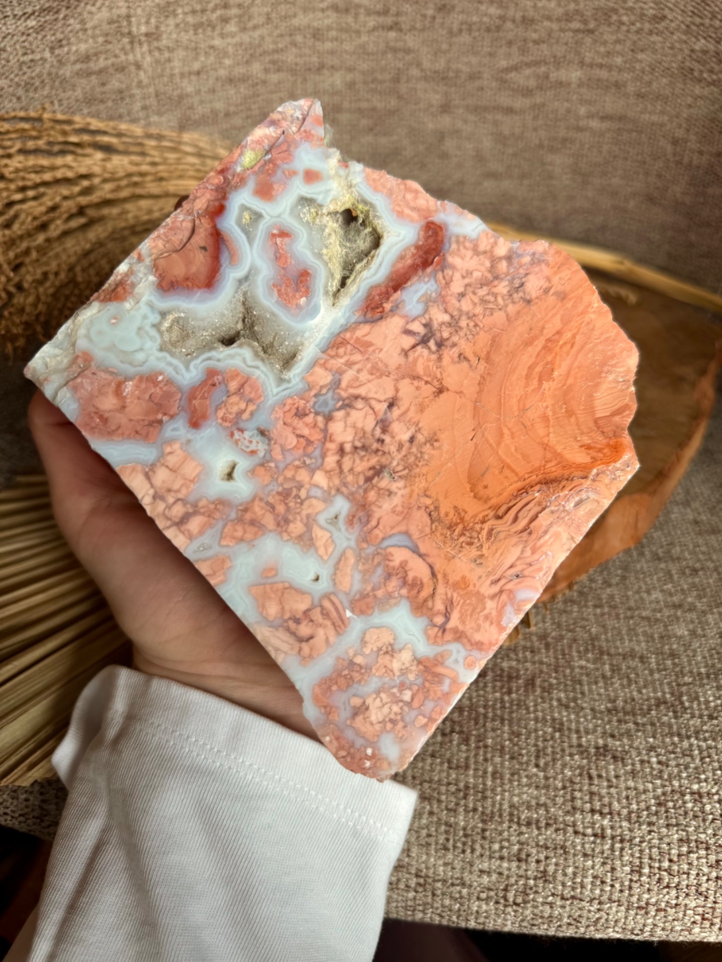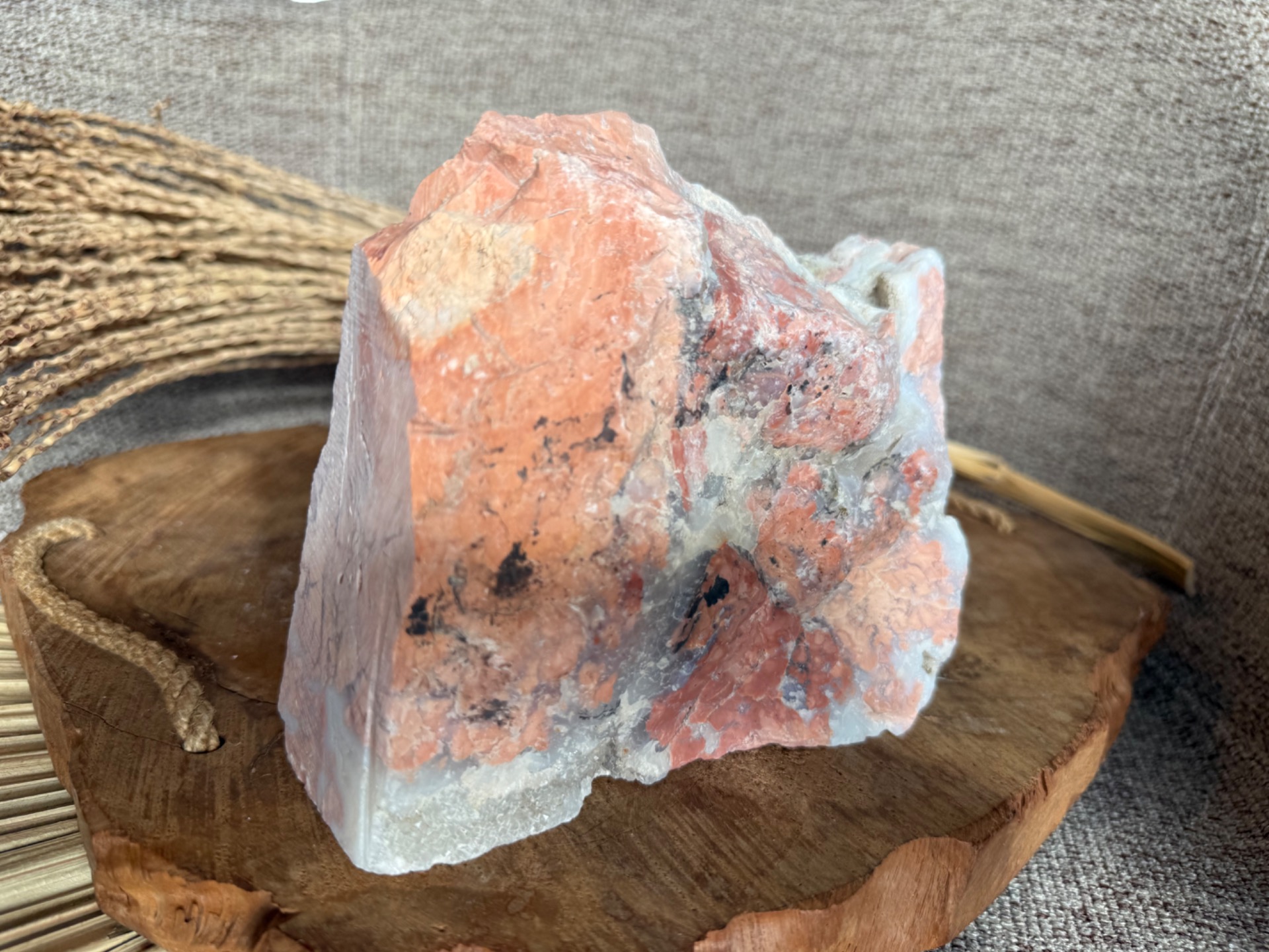 Tento Minerál achát broskyňový – Plodnosť života je ideálny pre osobný rozvoj, podporu ženských energií, meditácie a harmonizáciu priestoru, pričom slúži aj ako jedinečný a vizuálne pôsobivý solitér.