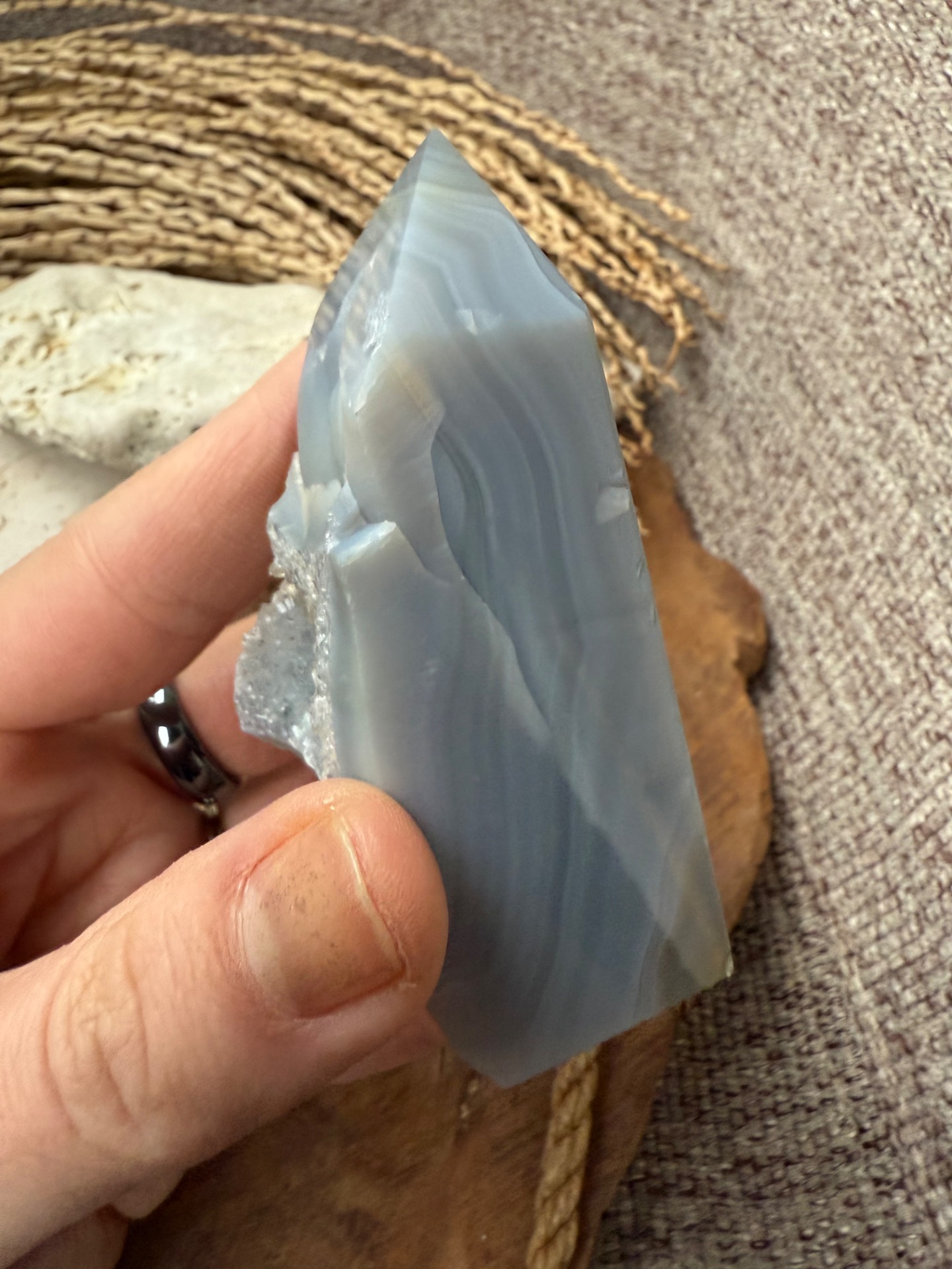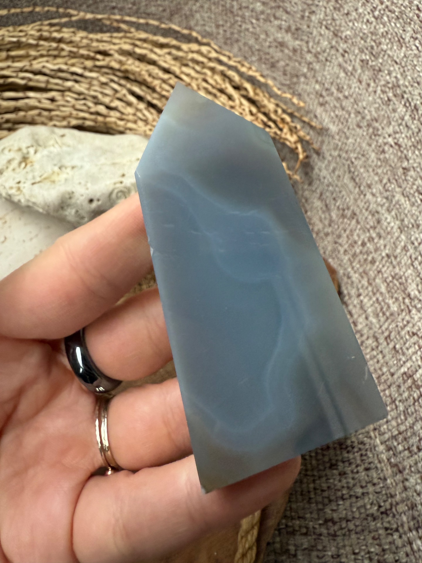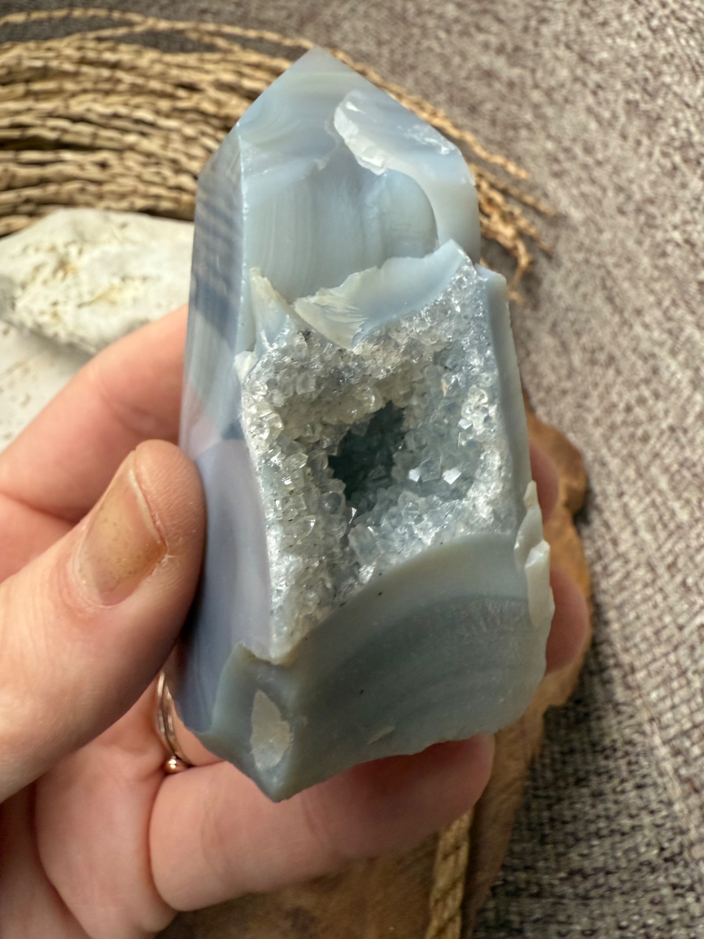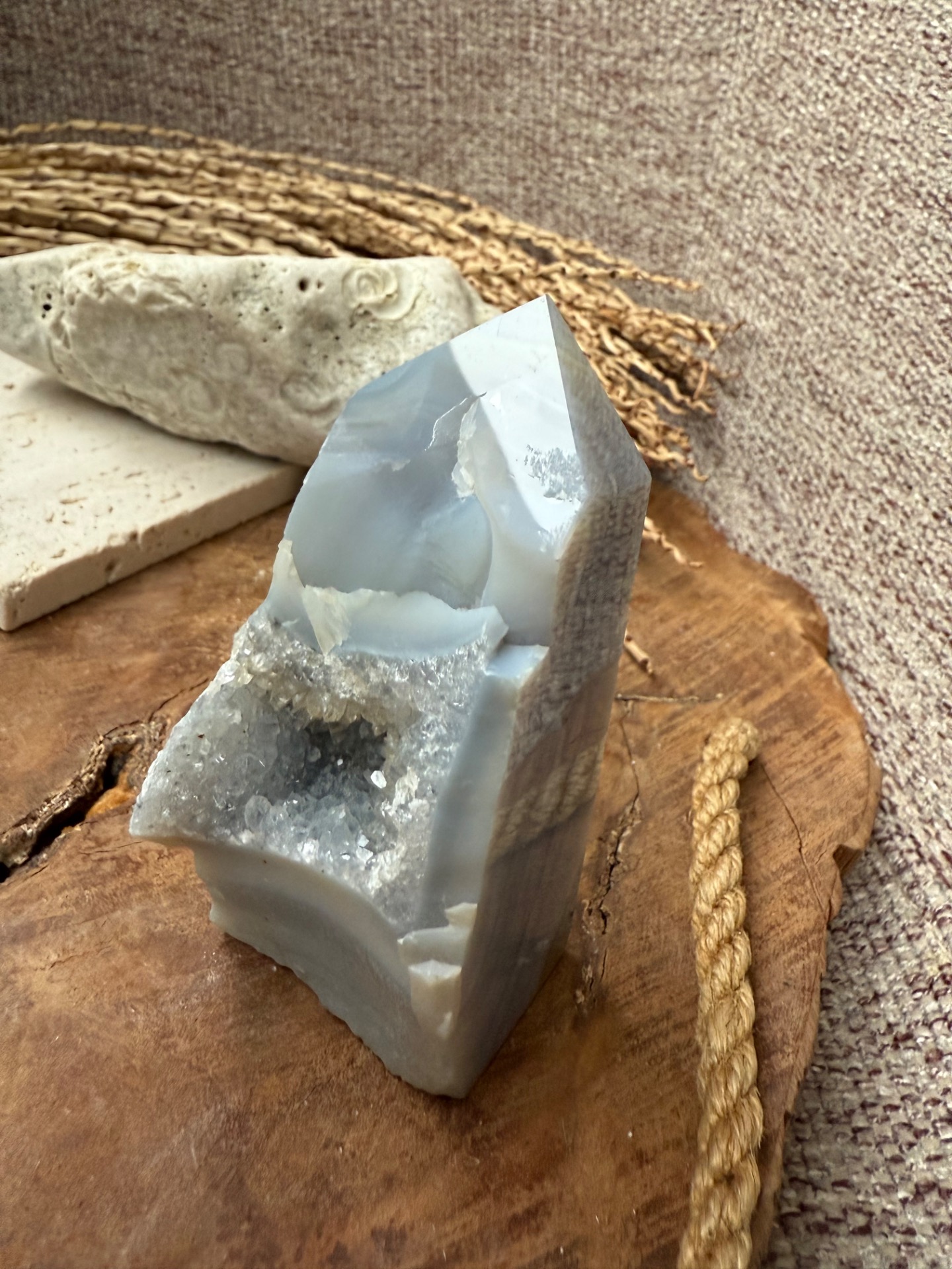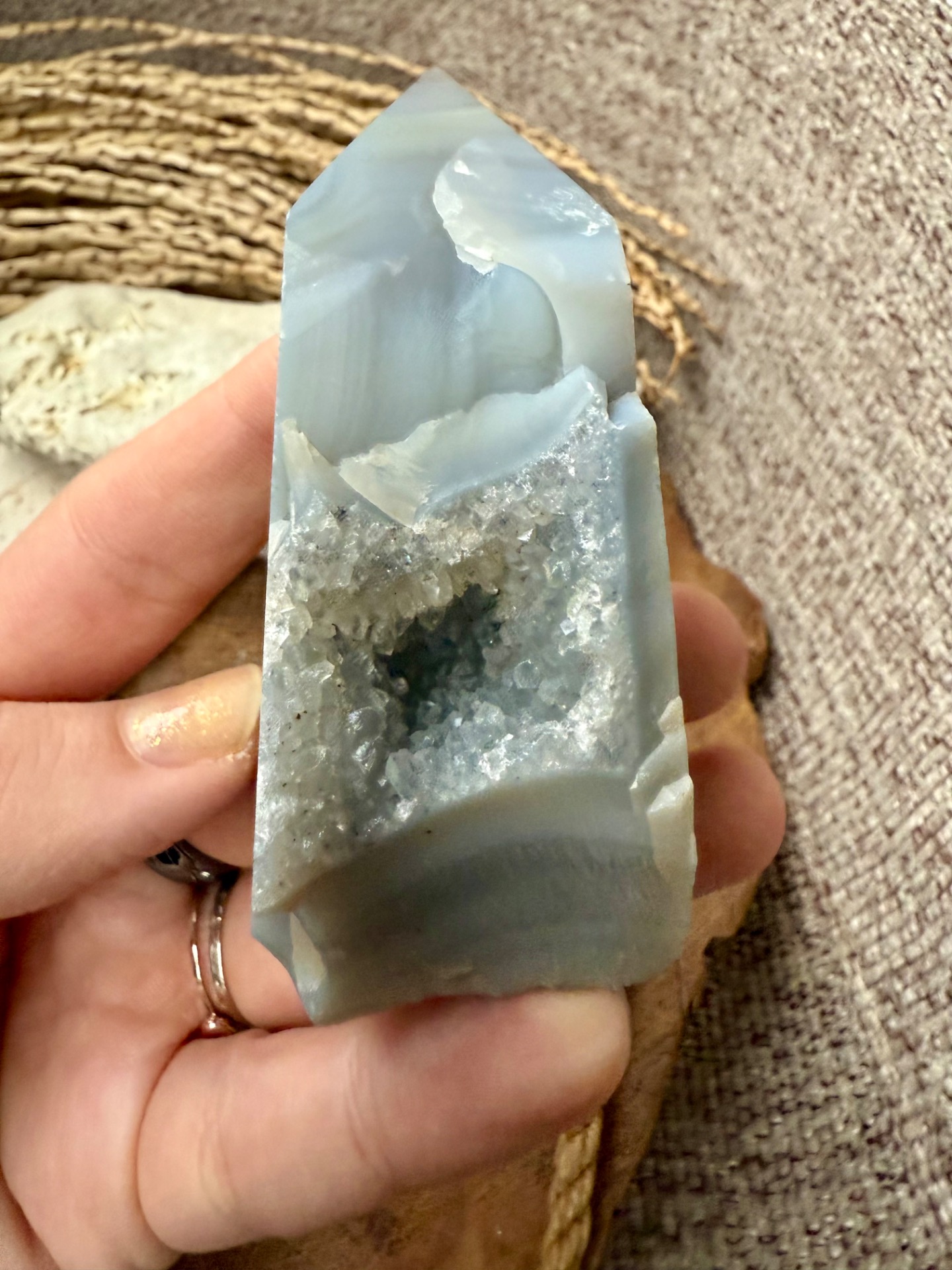 Tento prírodný sivý achát je nedofarbovaný a zachováva svoju autentickú krásu. Obsahuje vnútornú drúzu z kremeňa, ktorá dodáva jeho energii hĺbku a jemnú vibračnú silu. Achát je kameňom rovnováhy, stability a ochrany, ktorý pomáha uzemniť myseľ a uvoľniť stres.