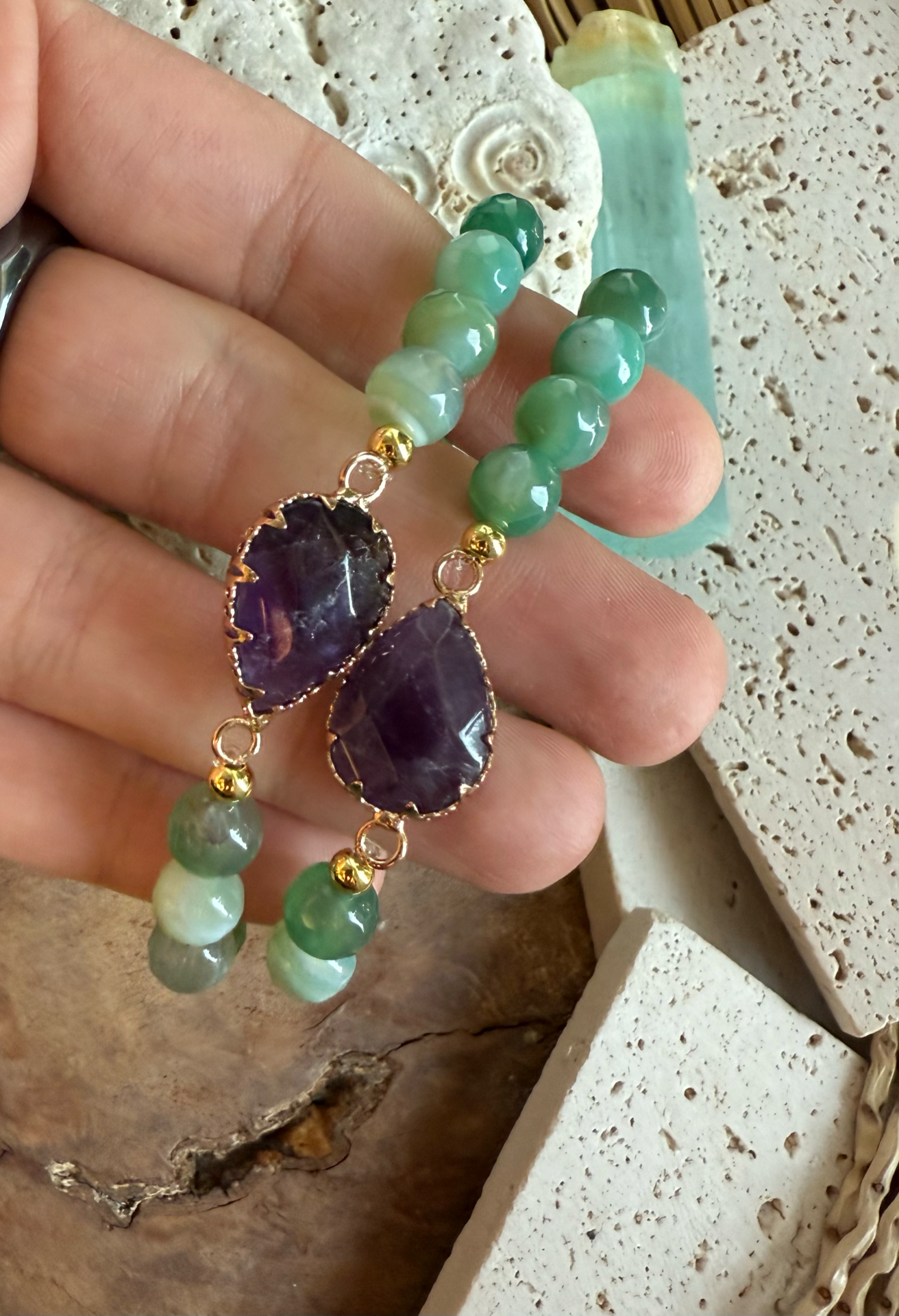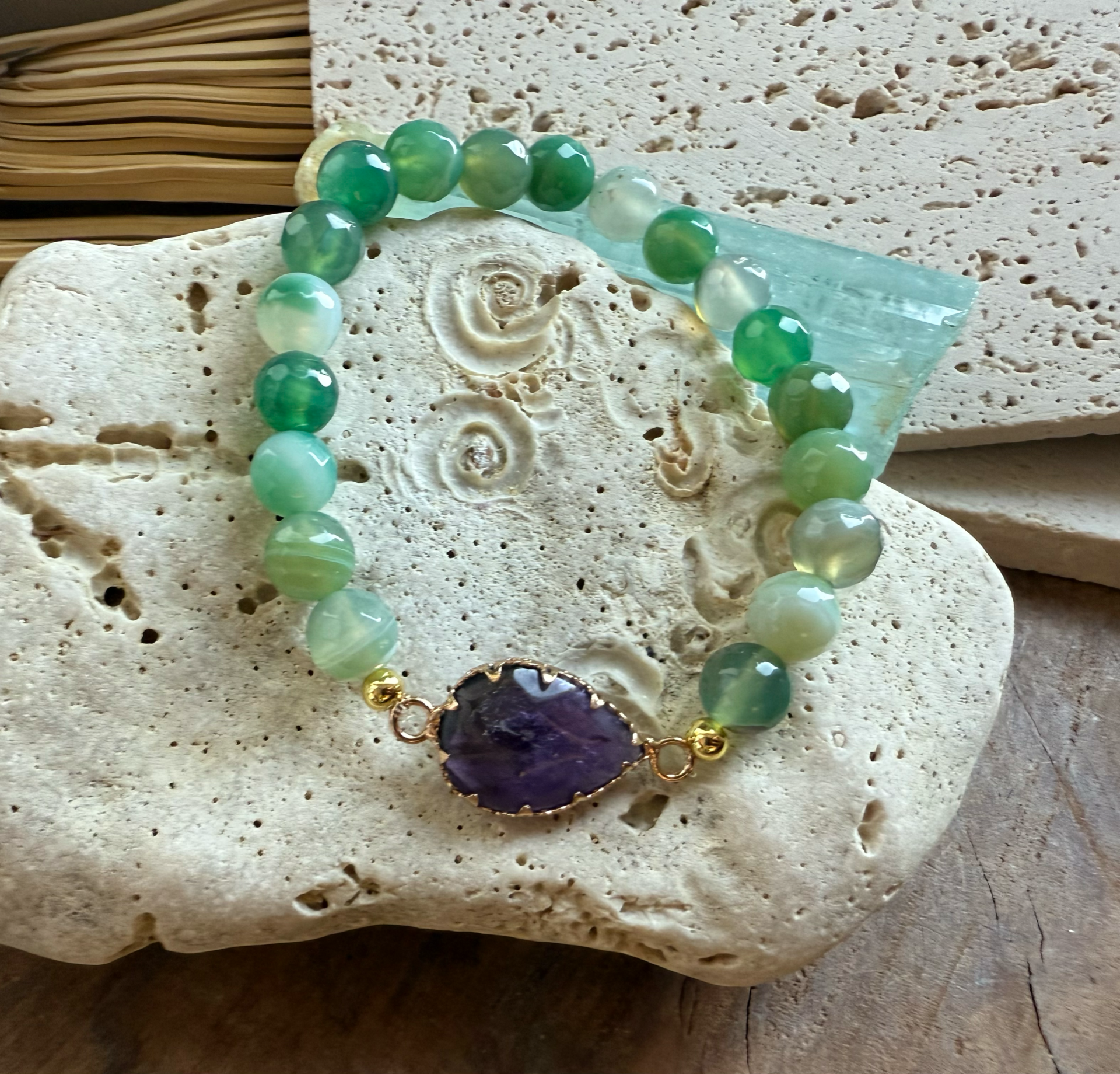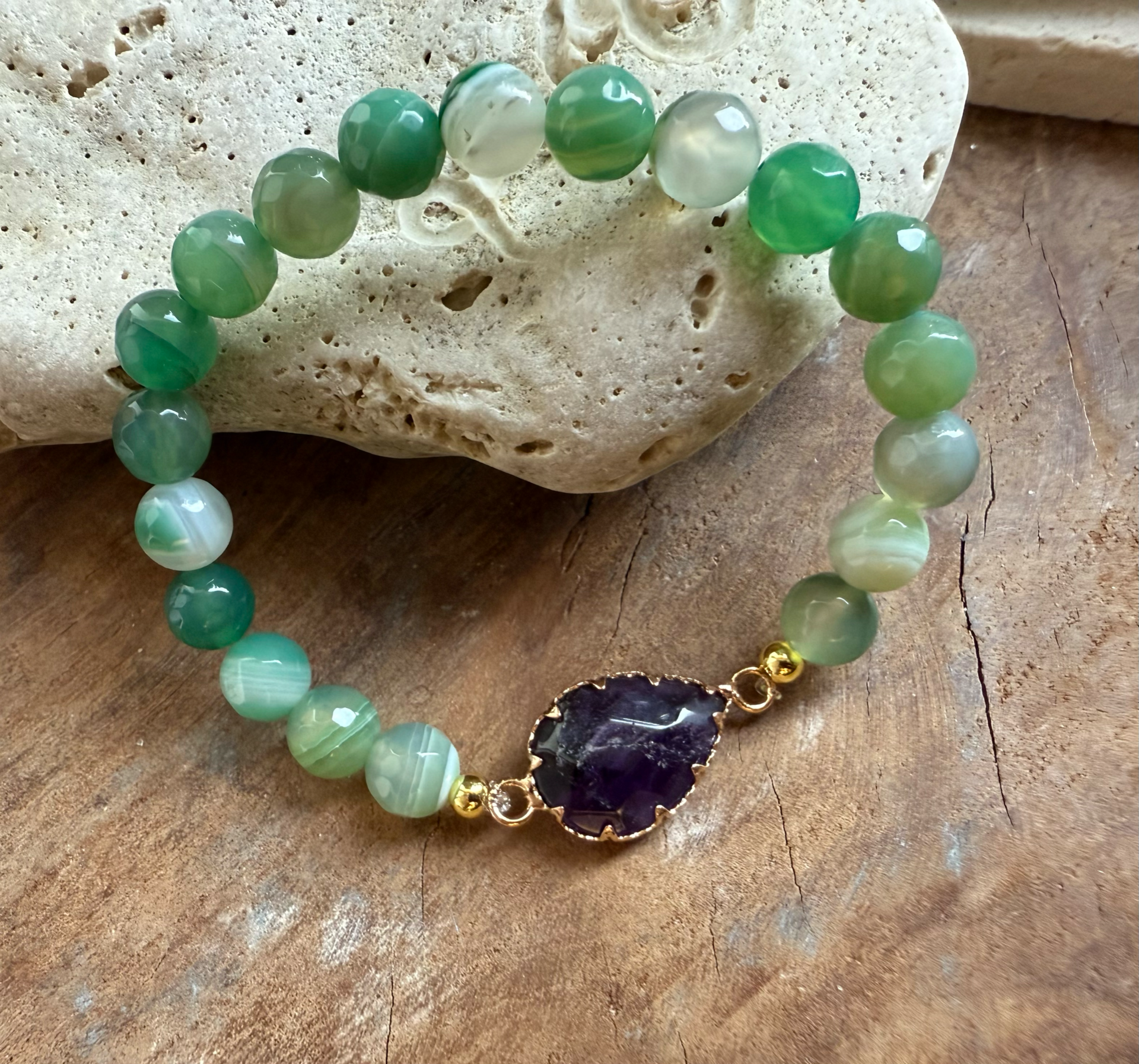 Náramok z dvojkombinácie minerálov ametyst placka doplnený achátom zeleným 8mm fazet výbrus.
