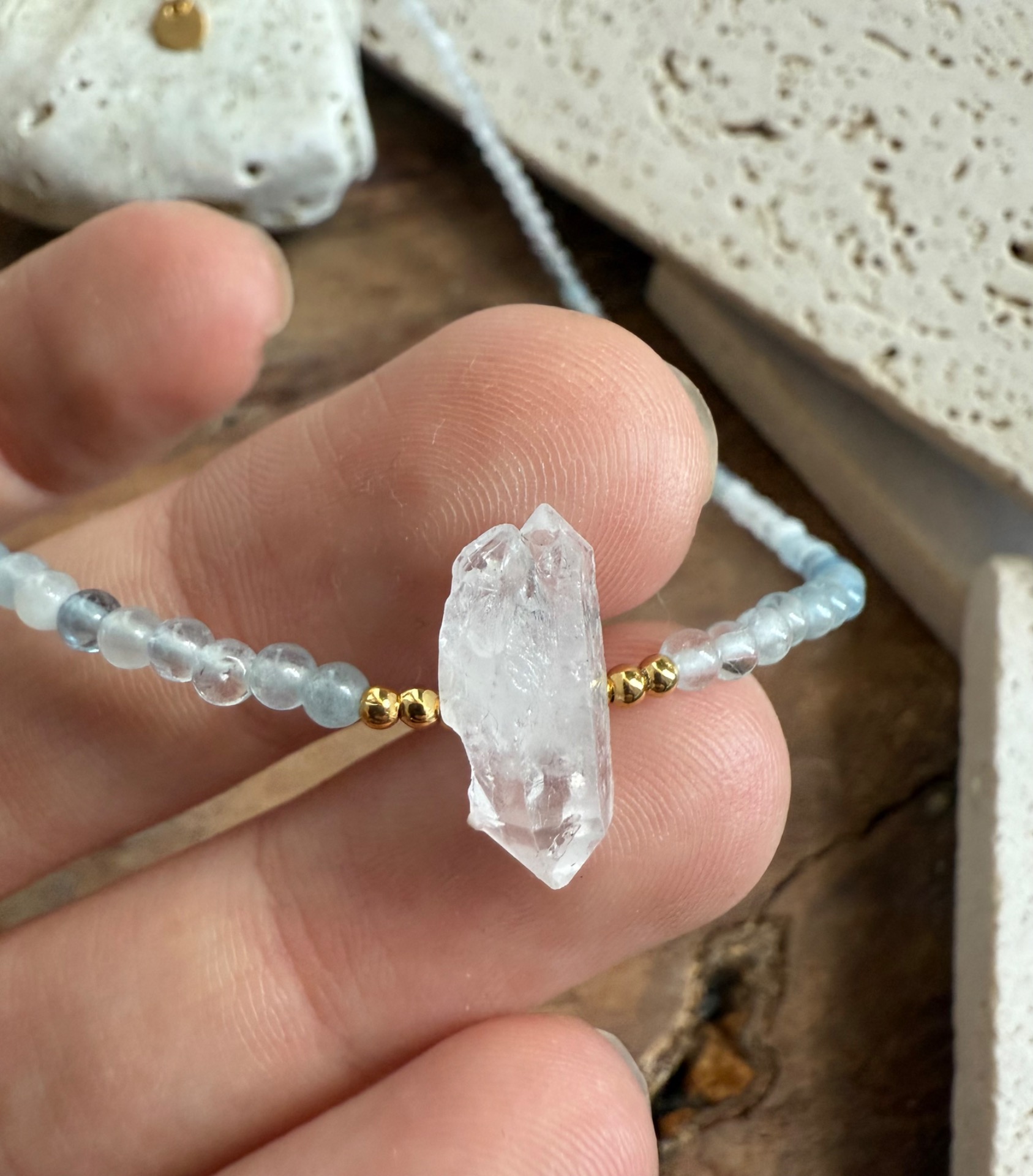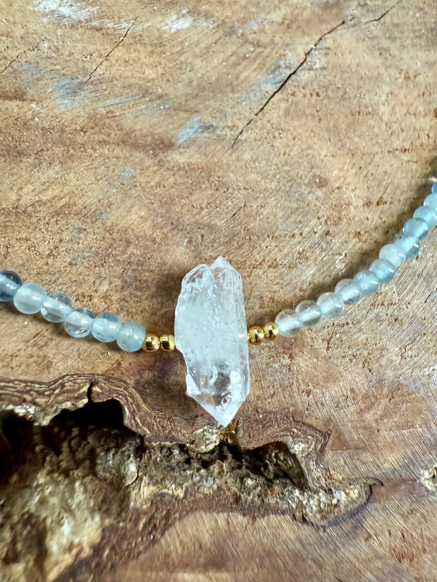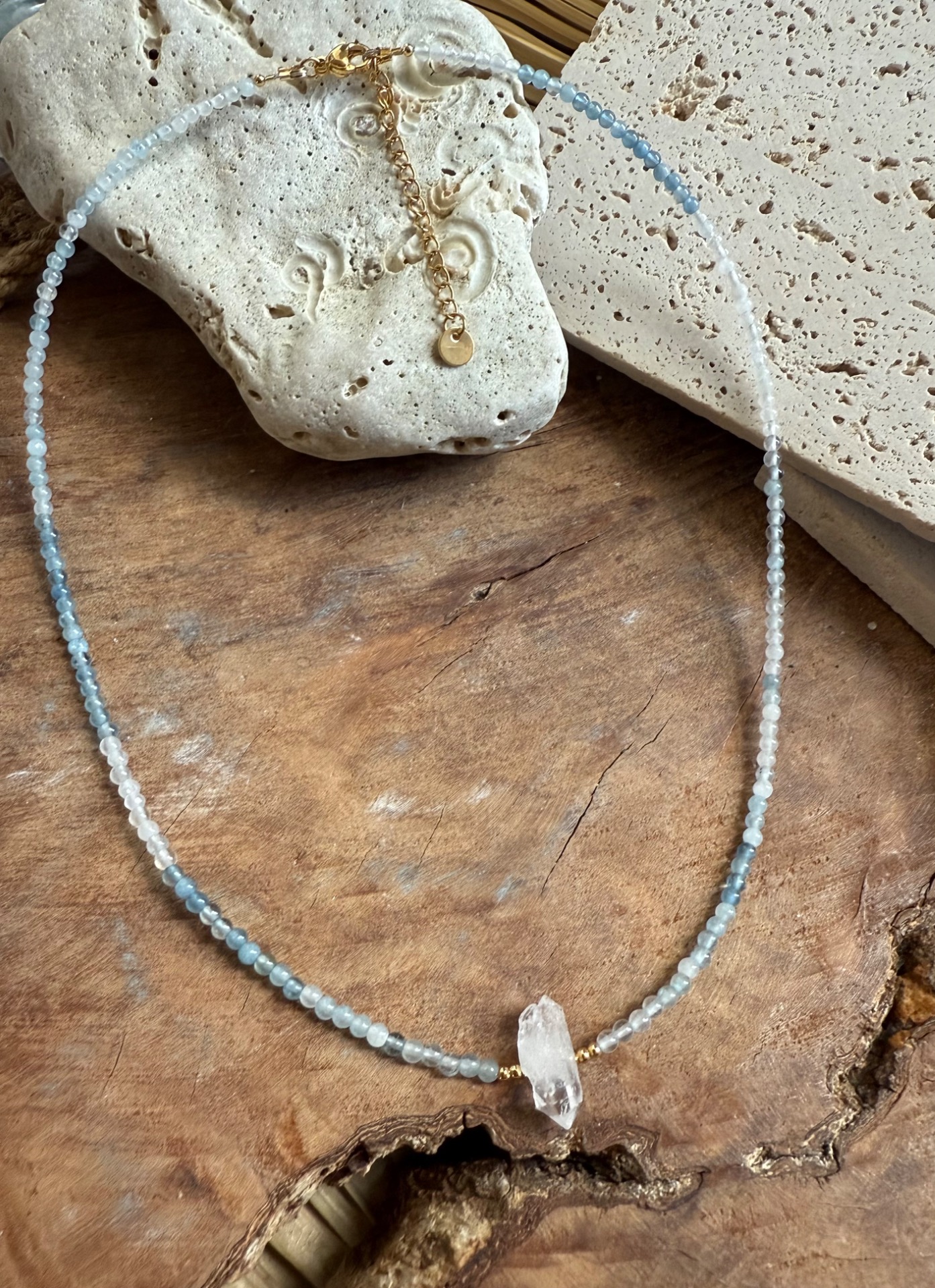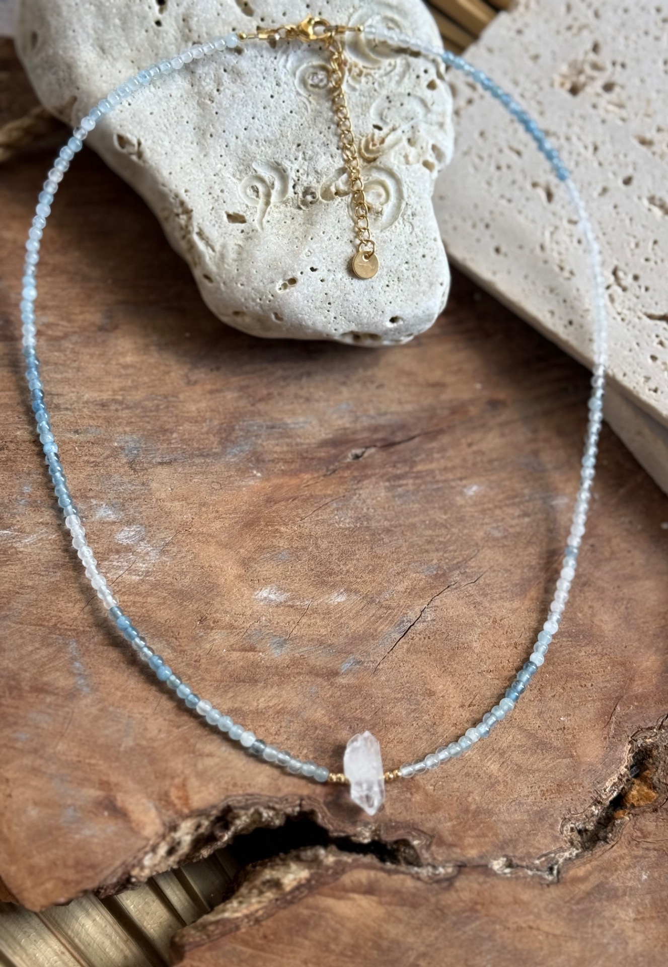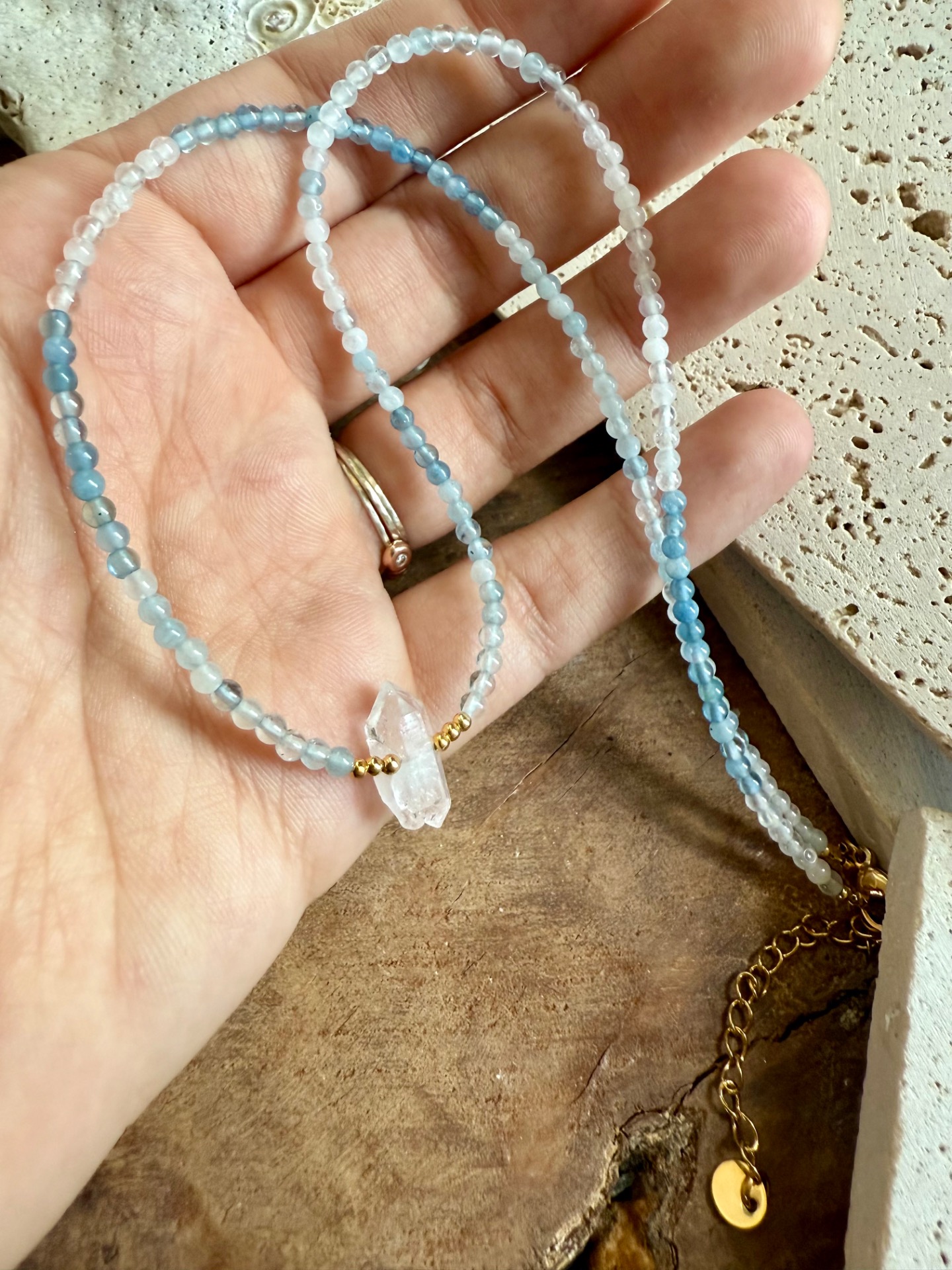 Tento náhrdelník z pravého akvamarínu (3 mm) a surového krištáľu je vytvorený ako jemná ochrana pre dušu, ktorá túži po harmónii, porozumení a spojení.