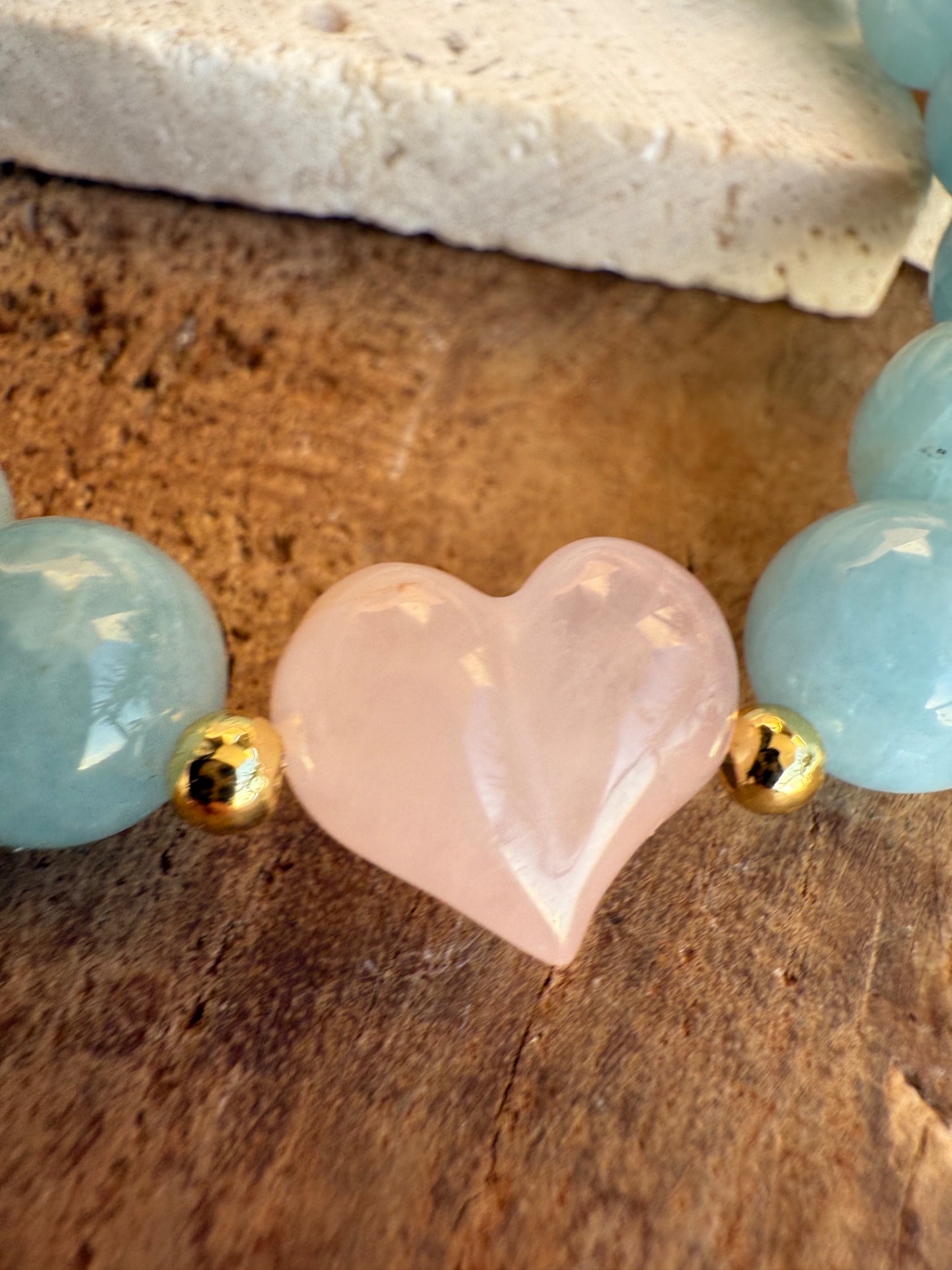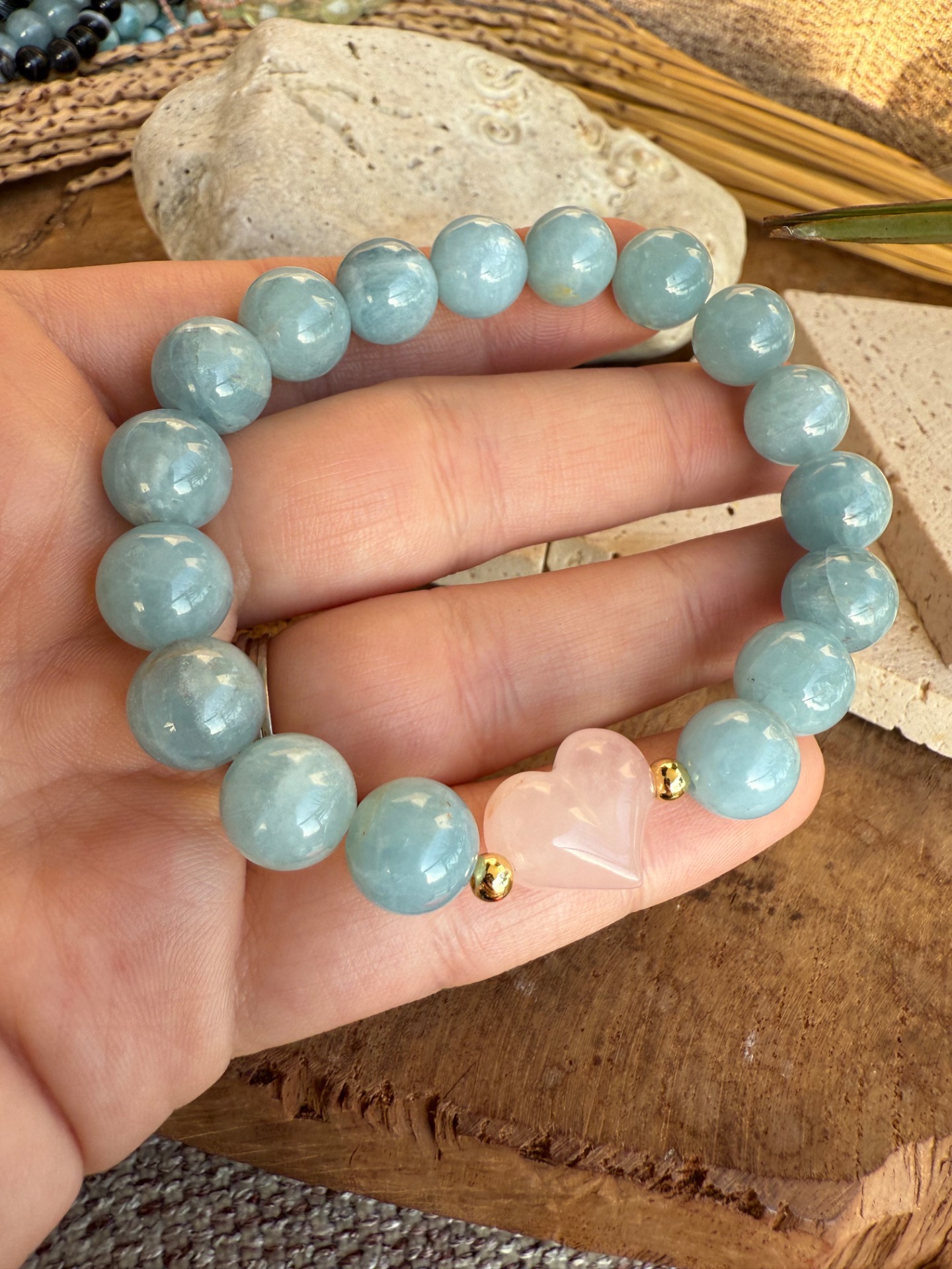 Jemný a zároveň výrazný náramok vytvorený z minerálu Akvamarín, doplnený o srdce z Ruženín. Spojenie týchto dvoch kameňov prináša energiu pokoja, lásky a emocionálnej harmónie.