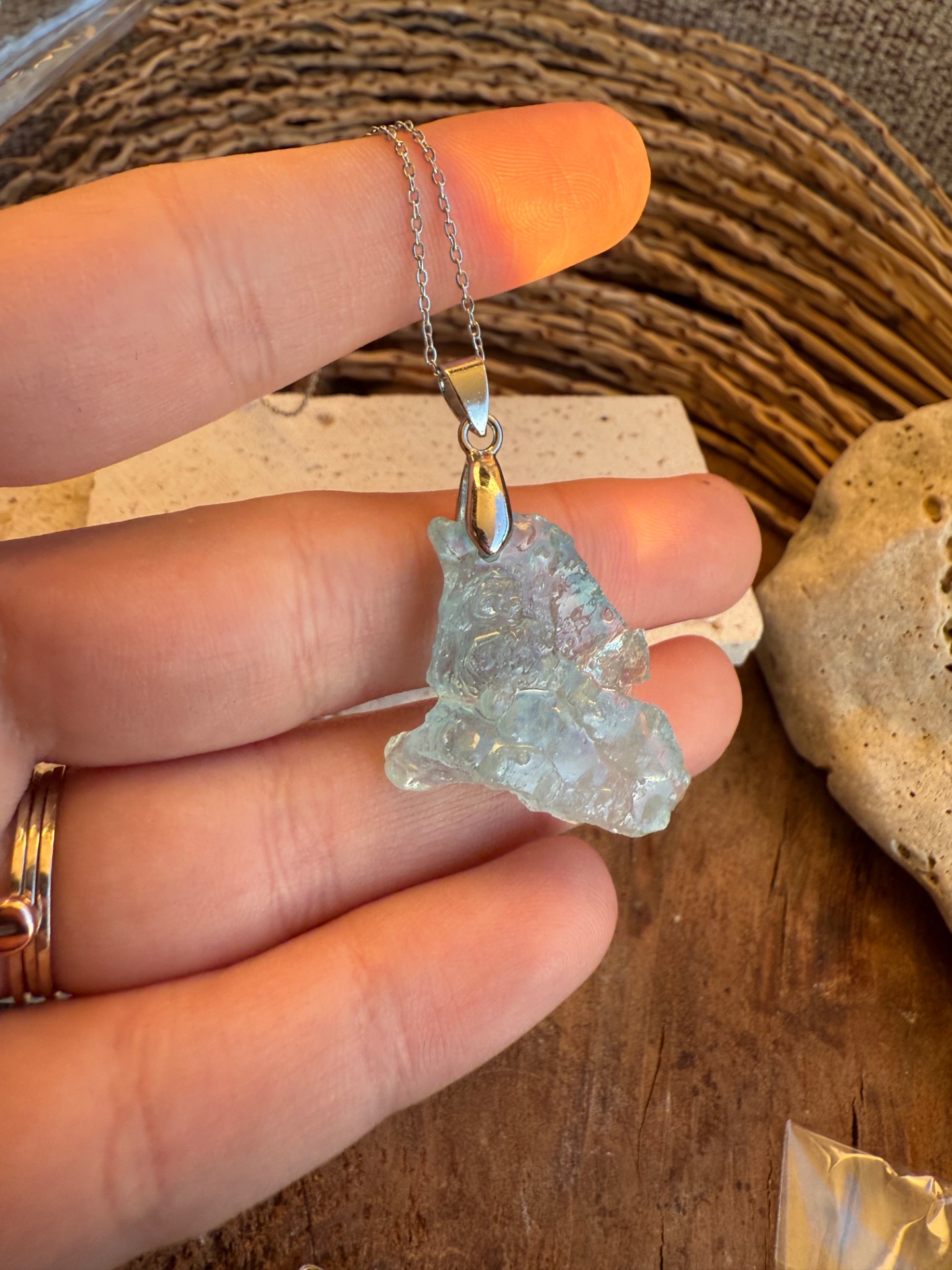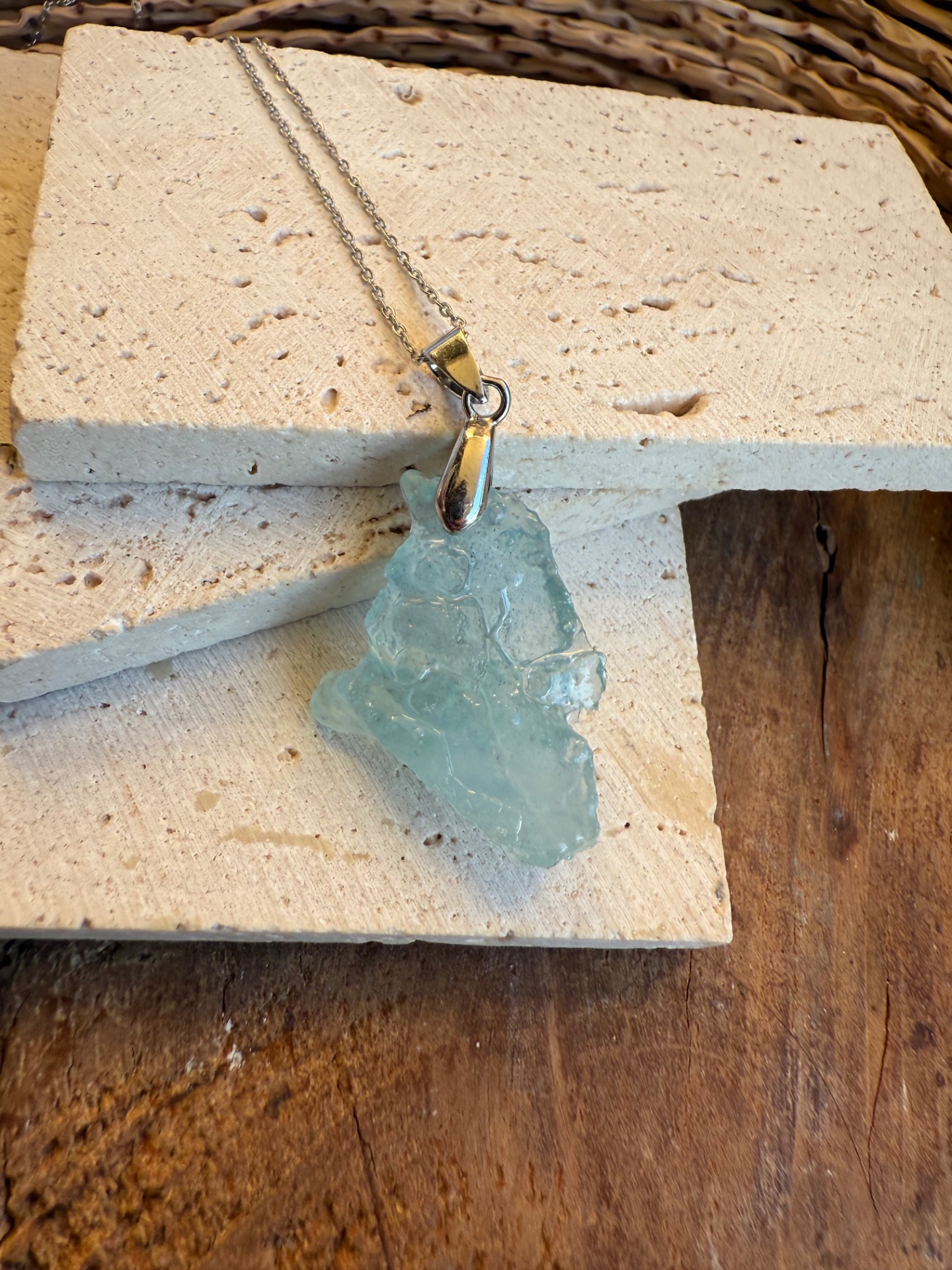 Jemný prívesok zo surového akvamarínu v prirodzenej, nepravidelnej forme. Každý kus je originál – tvar vytvorila samotná príroda. Svetlomodrá až jemne zelenkavá farba pripomína pokoj morskej hladiny a čistotu vody.