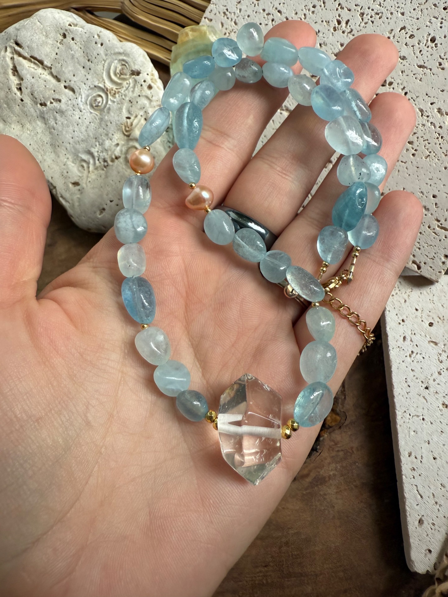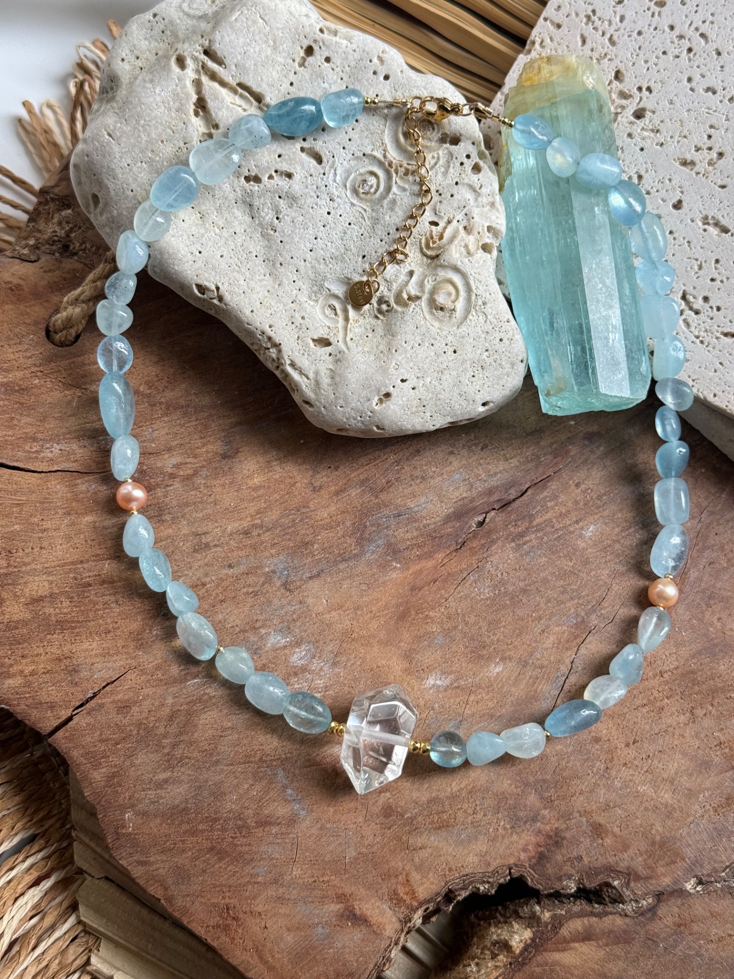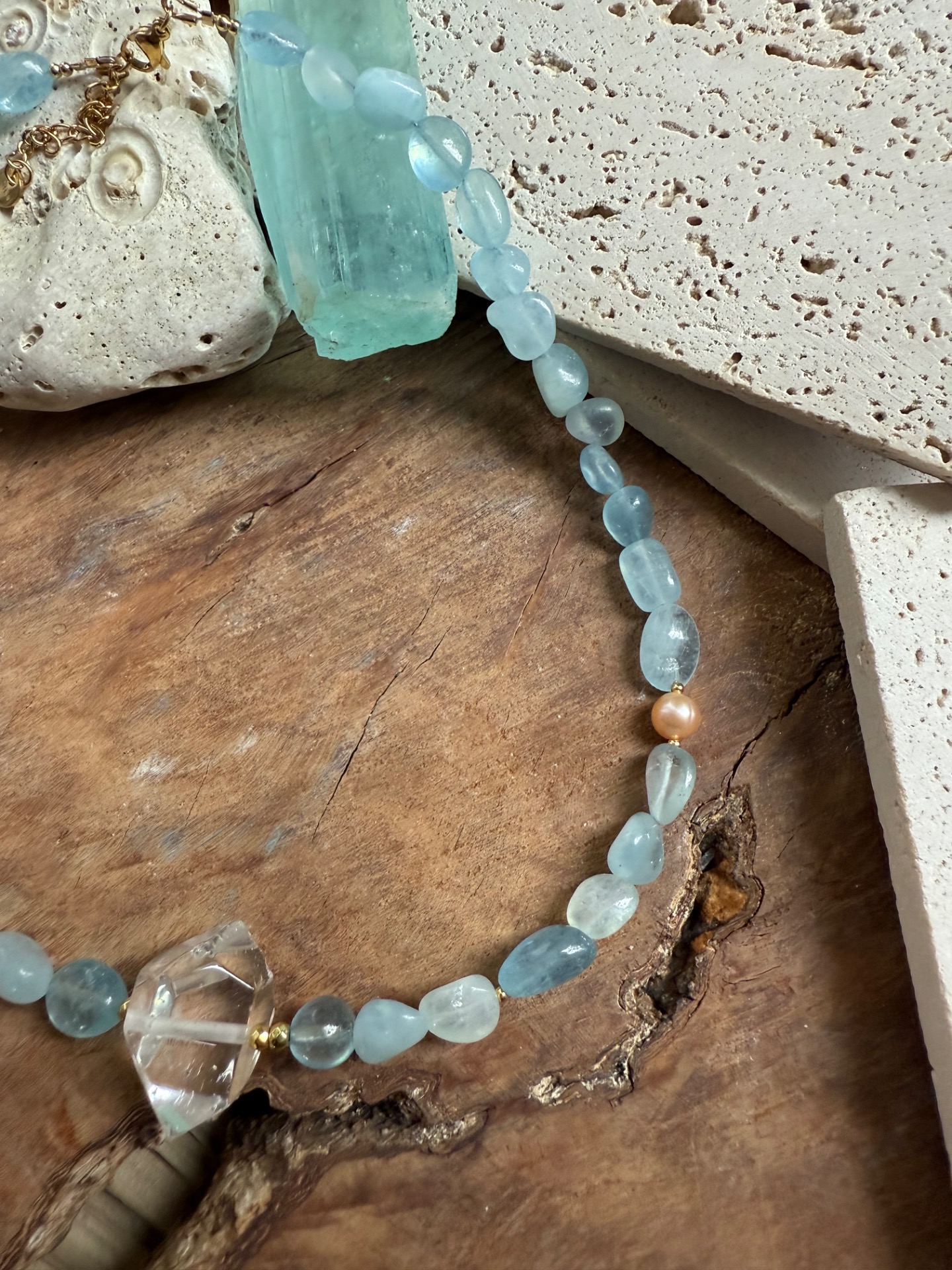 Ručne vybrané tučné nuggety akvamarínu v nádhernom oceánskom odtieni vytvárajú rytmus svetla a pokoja, zatiaľ čo stredový obojstranný krištáľ zosilňuje ich energiu a prináša harmonické prepojenie mysle a srdca.