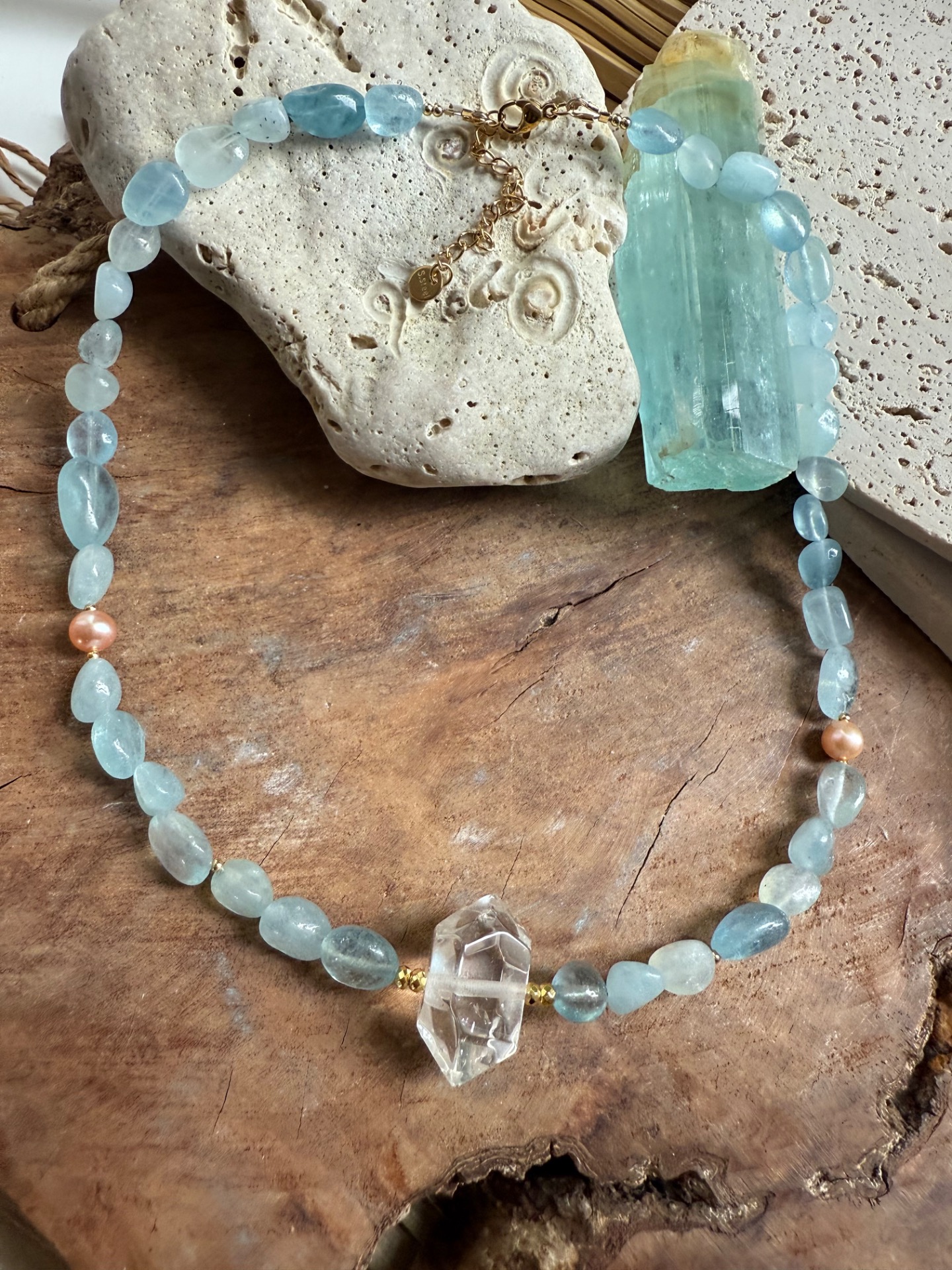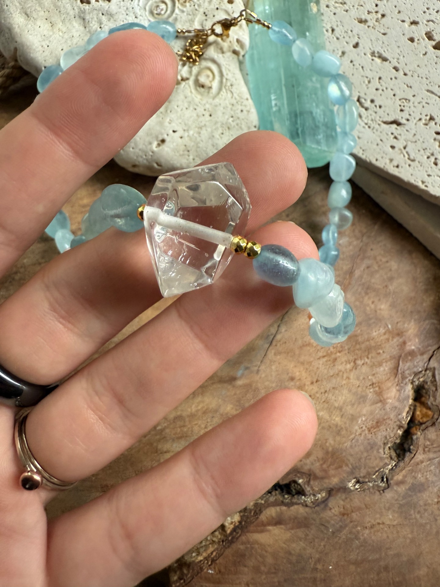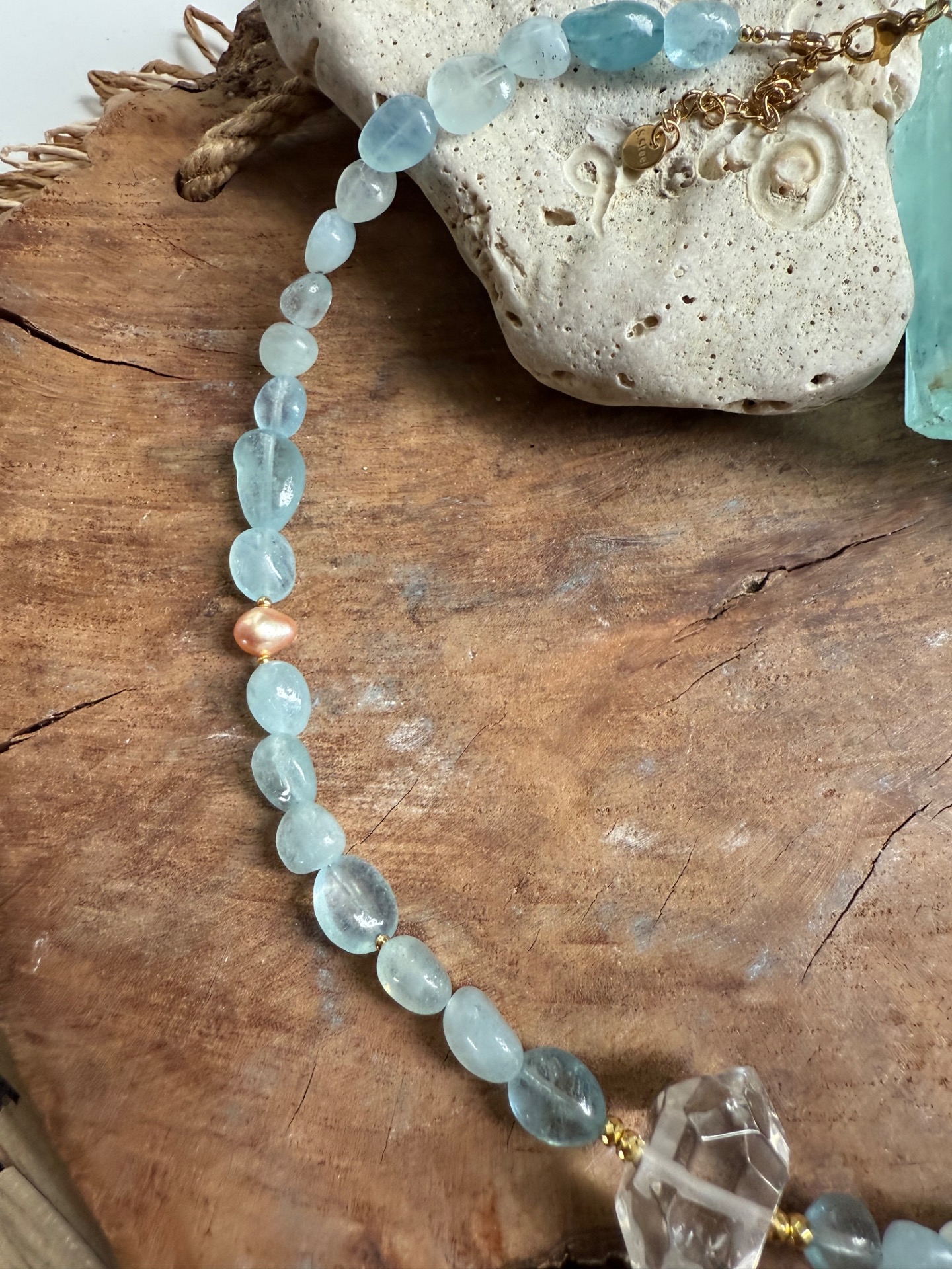 Ručne vybrané tučné nuggety akvamarínu v nádhernom oceánskom odtieni vytvárajú rytmus svetla a pokoja, zatiaľ čo stredový obojstranný krištáľ zosilňuje ich energiu a prináša harmonické prepojenie mysle a srdca.
