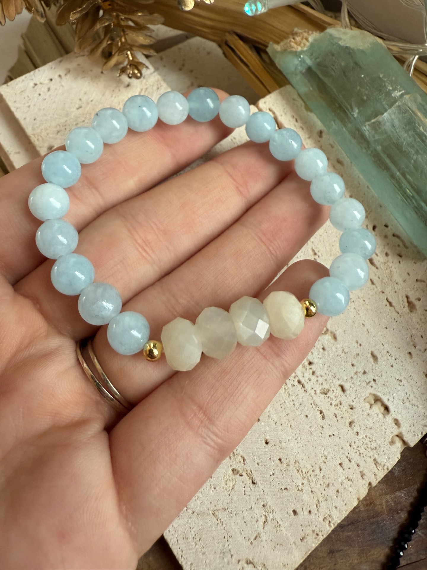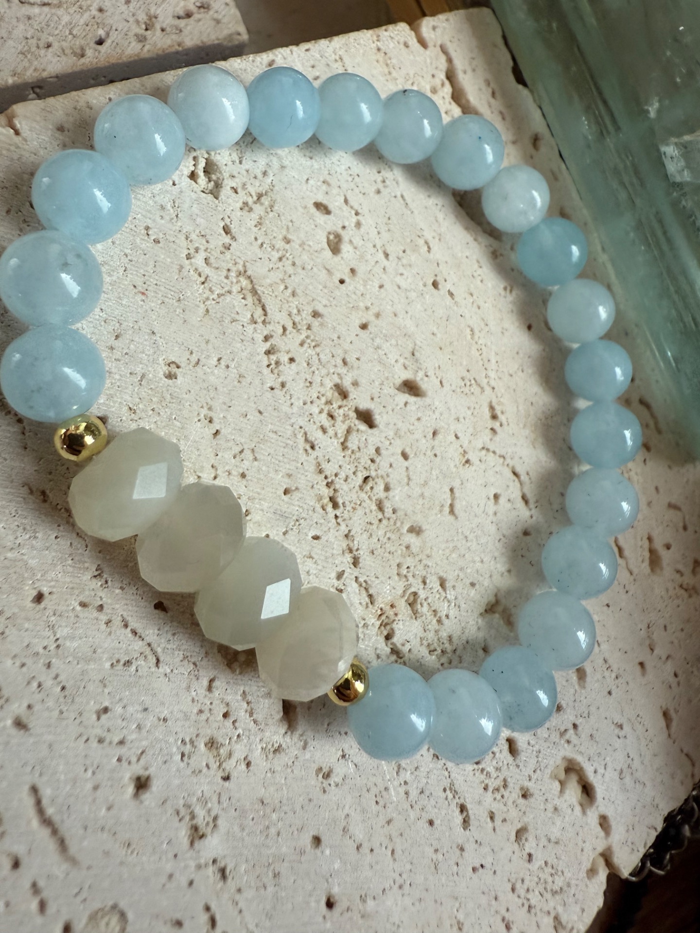 Tento náramok je ódou na ženskú jemnosť, vnútorný pokoj a plynutie v súlade so sebou. Akvamarín prináša pokoj mysle, ľahkosť a dôveru v životný tok, zatiaľ čo mesačný kameň podporuje intuíciu, cyklickosť a hlboké spojenie so ženskou energiou.