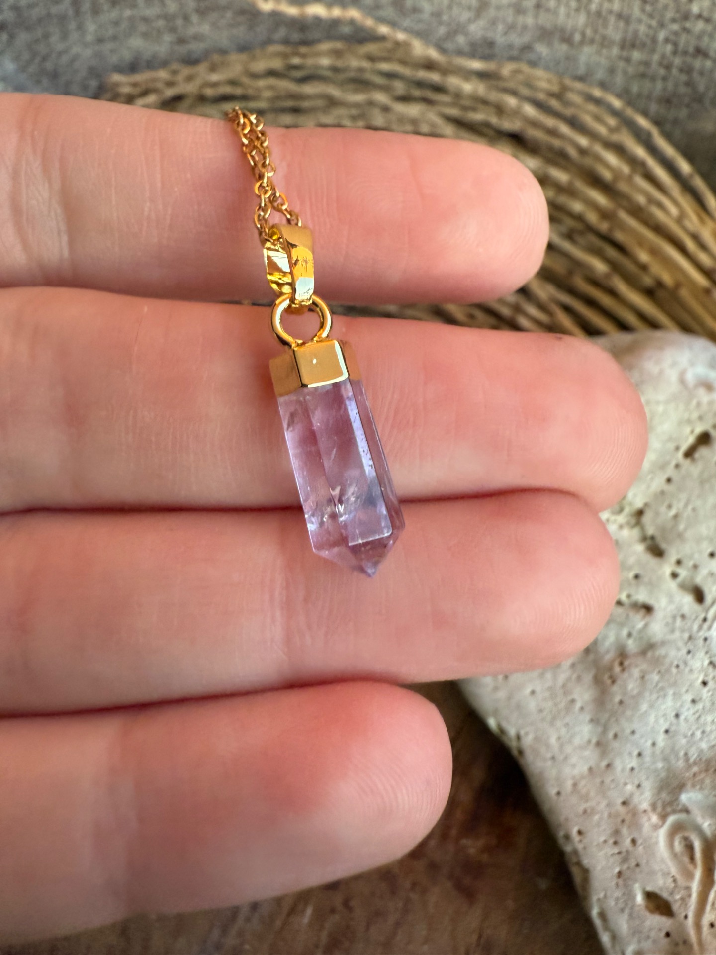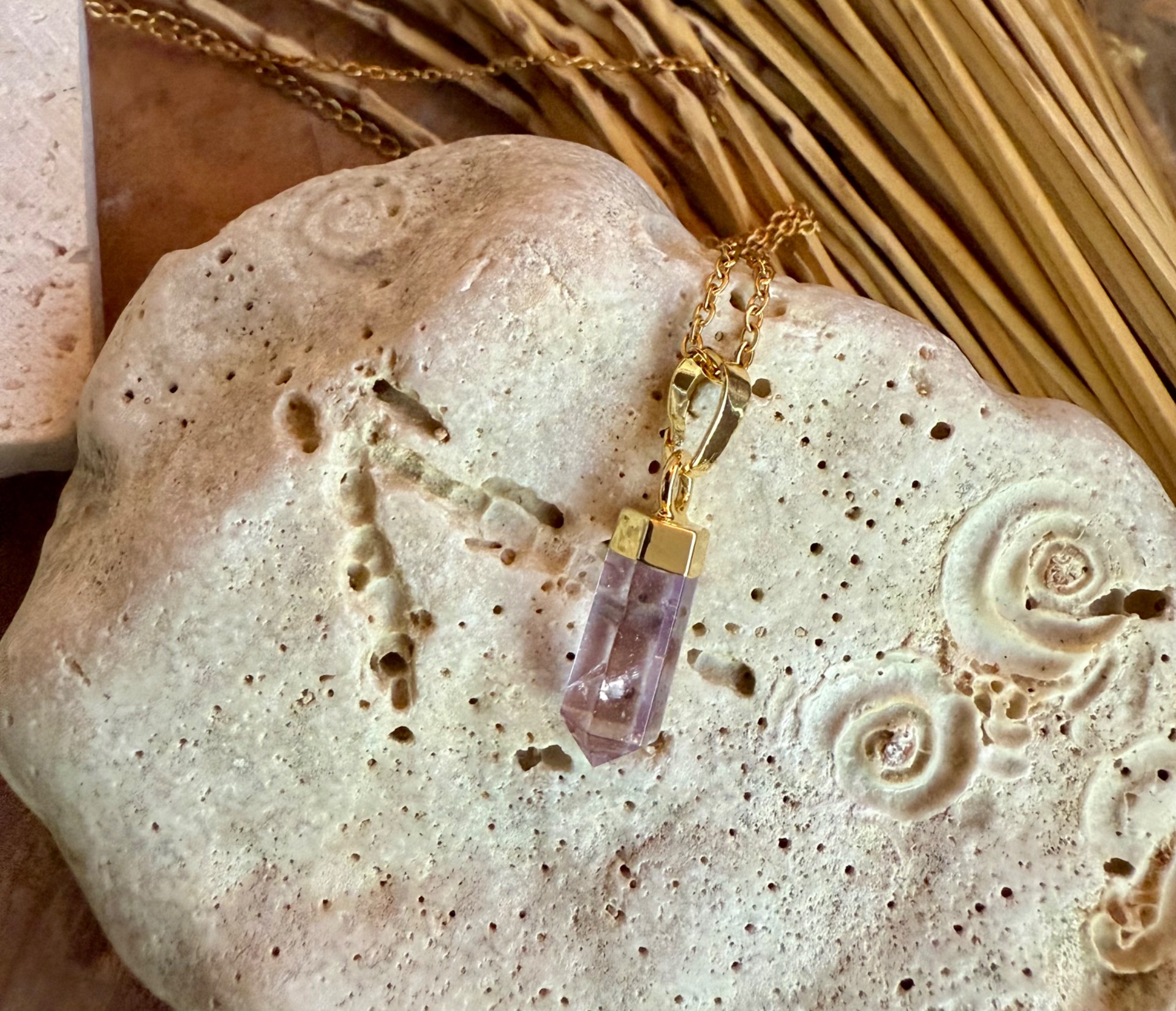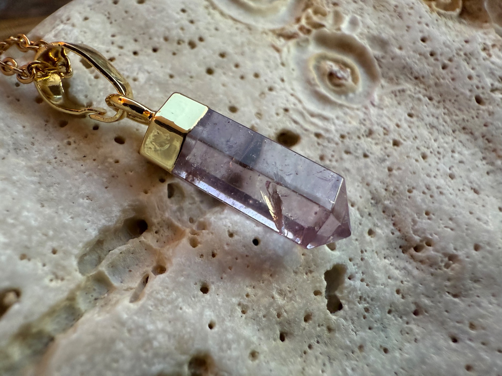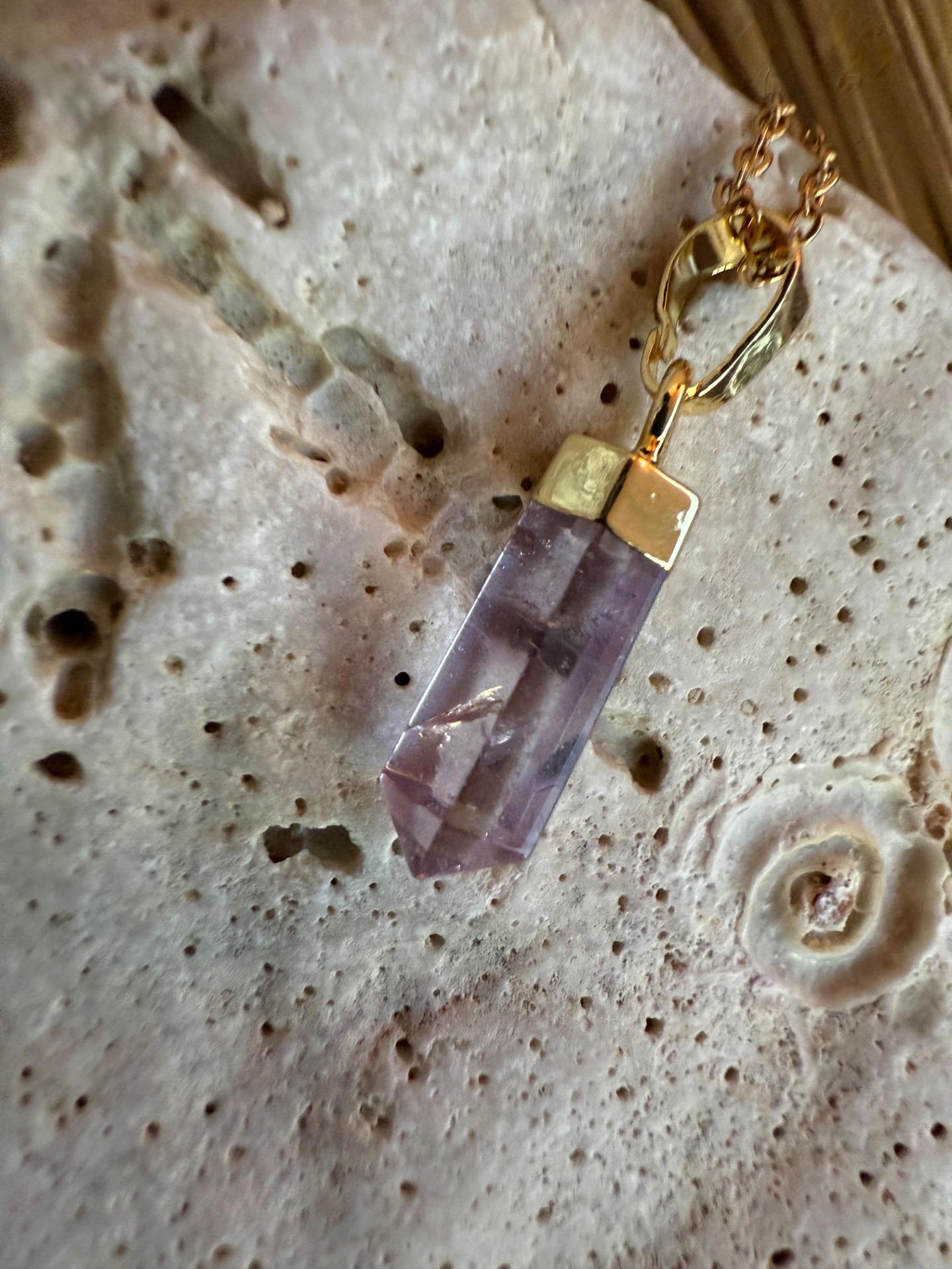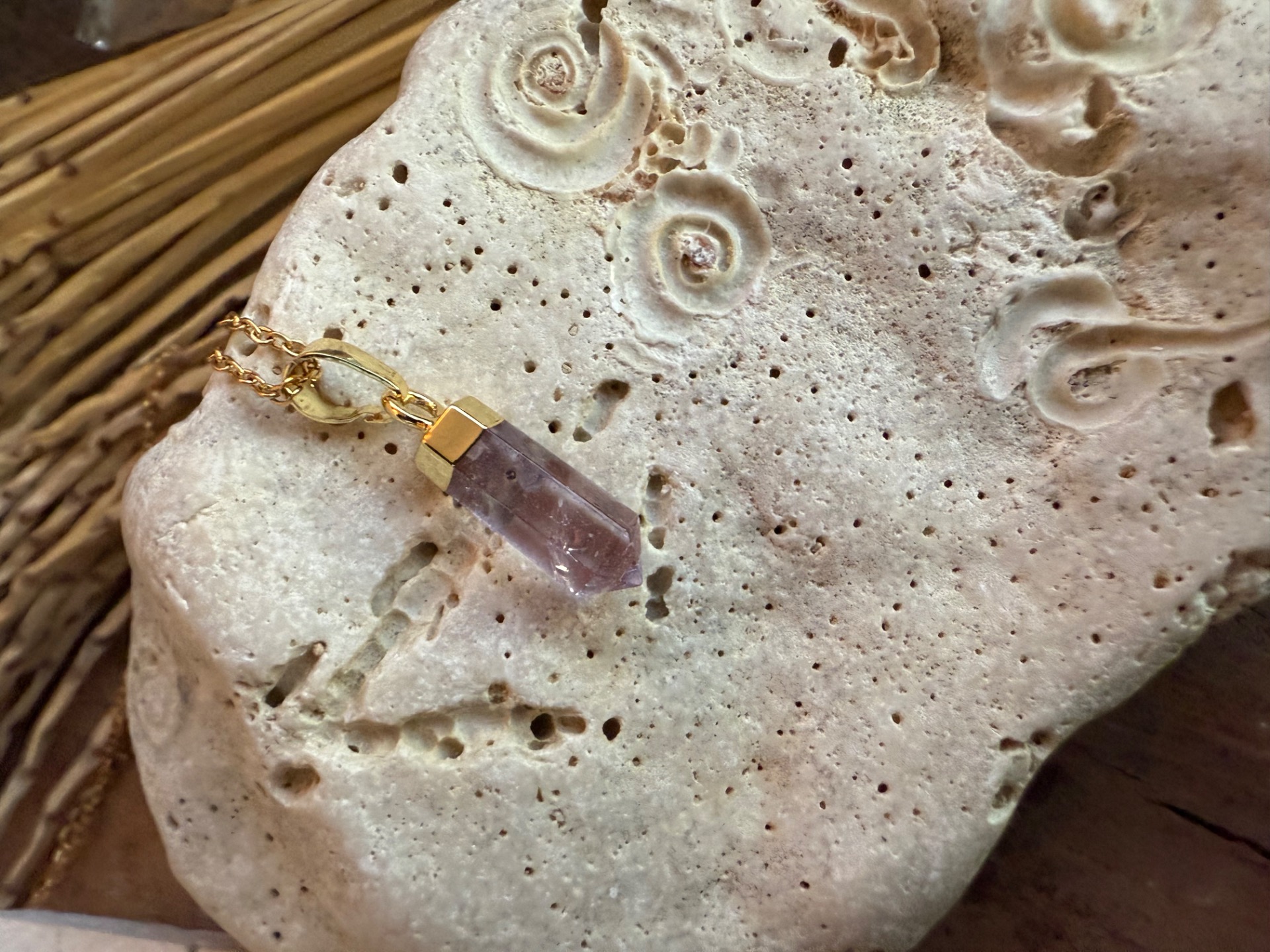 Elegantný prívesok z prírodného svetlého ametystu brúseného do tvaru šesťhranného hrotu. Jeho jemná, bledofialová farba pôsobí nežne, žensky a harmonicky. Minimalistický dizajn dopĺňa kovový detail a retiazka, vďaka čomu je ideálny na každodenné nosenie aj vrstvenie s ďalšími náhrdelníkmi.