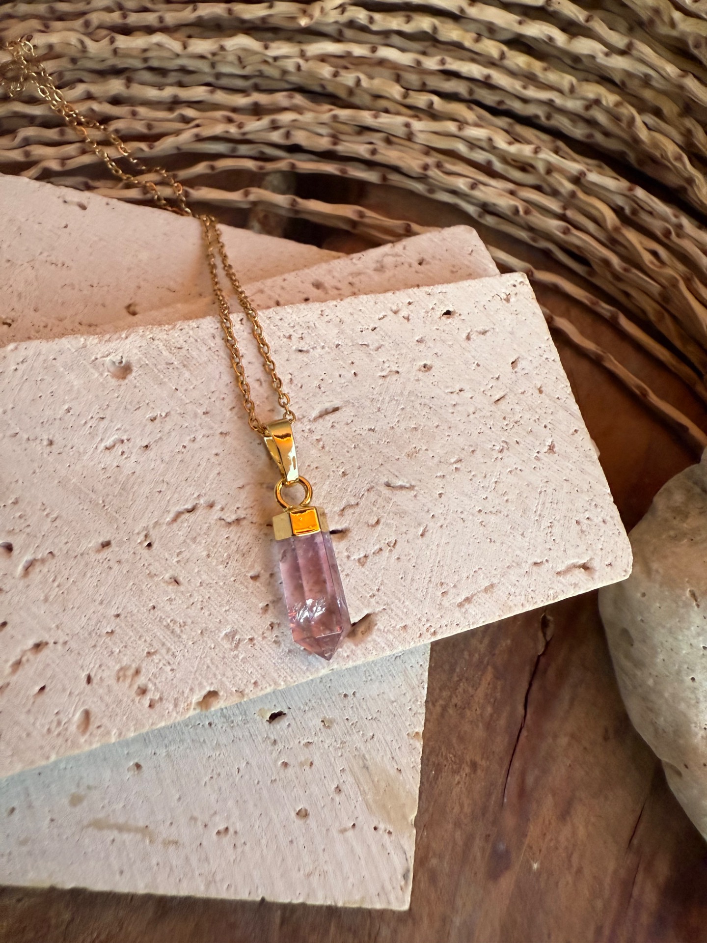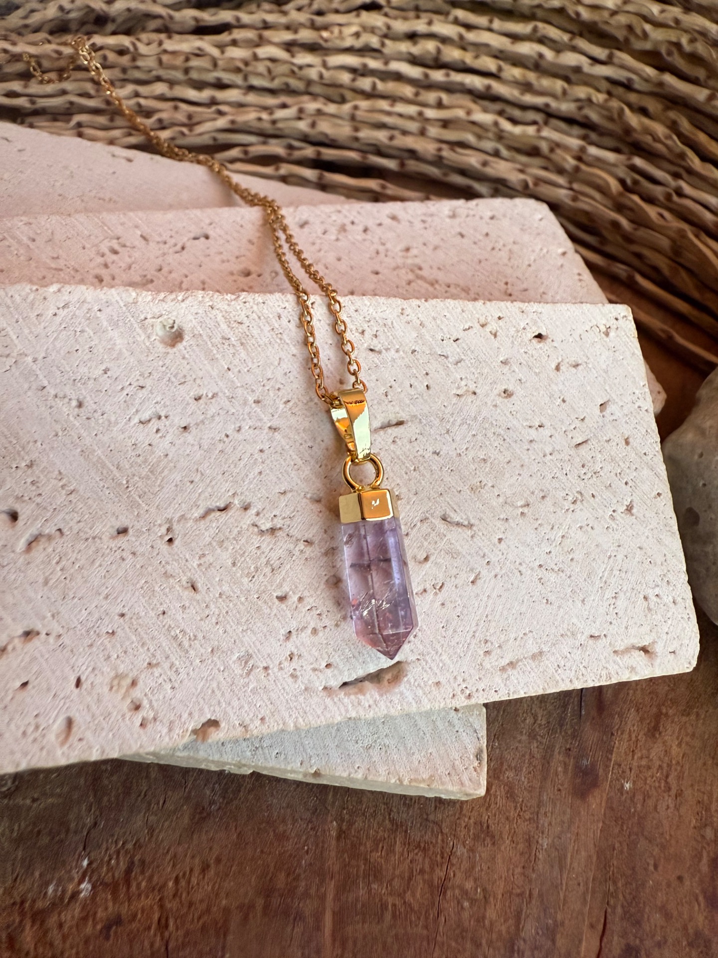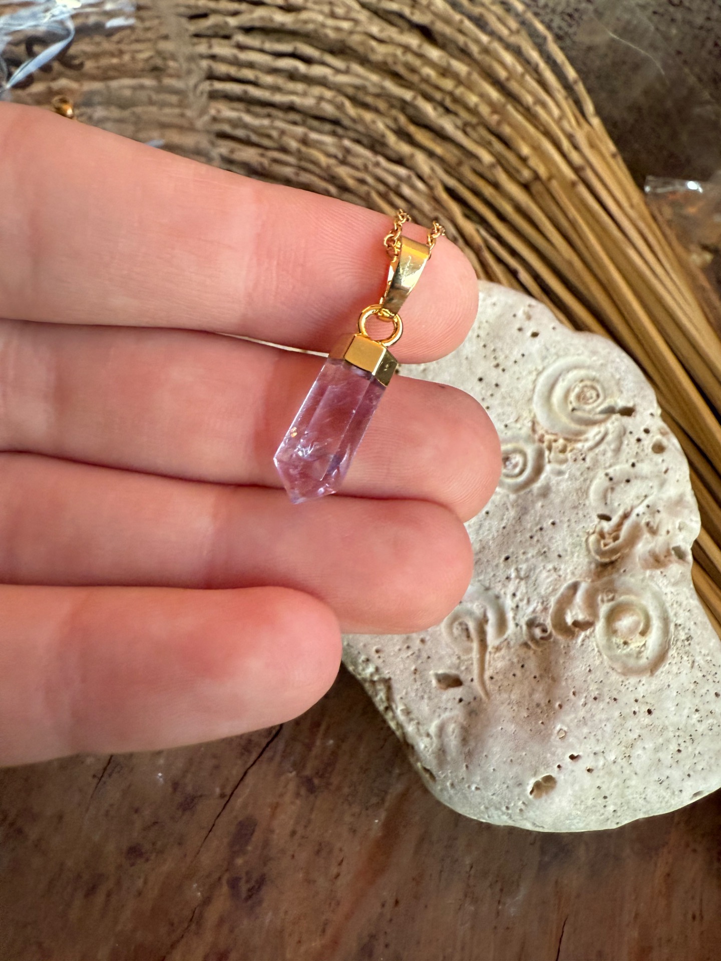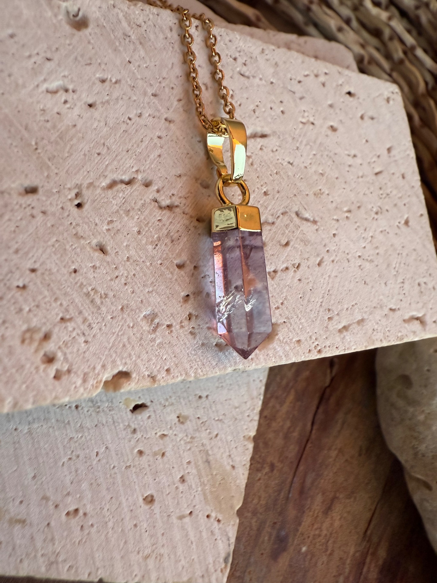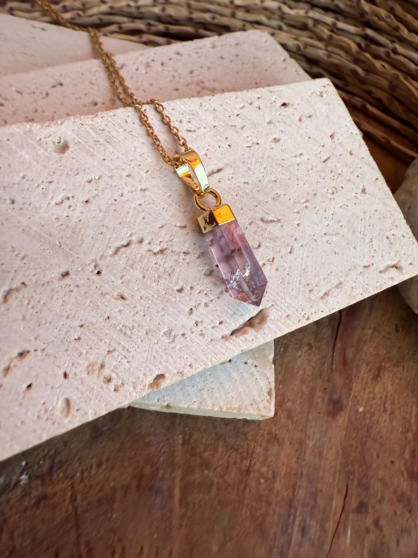 Elegantný prívesok z prírodného svetlého ametystu brúseného do tvaru šesťhranného hrotu. Jeho jemná, bledofialová farba pôsobí nežne, žensky a harmonicky. Minimalistický dizajn dopĺňa kovový detail a retiazka, vďaka čomu je ideálny na každodenné nosenie aj vrstvenie s ďalšími náhrdelníkmi.