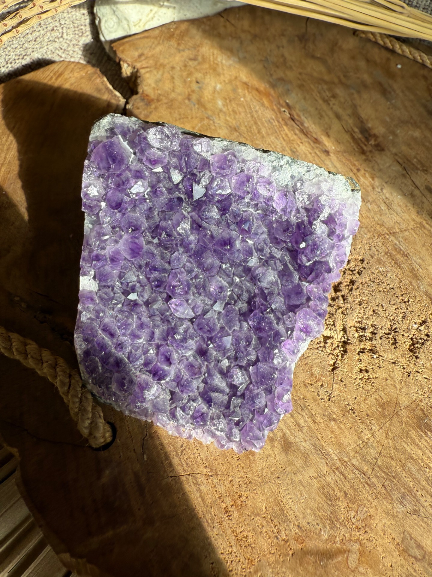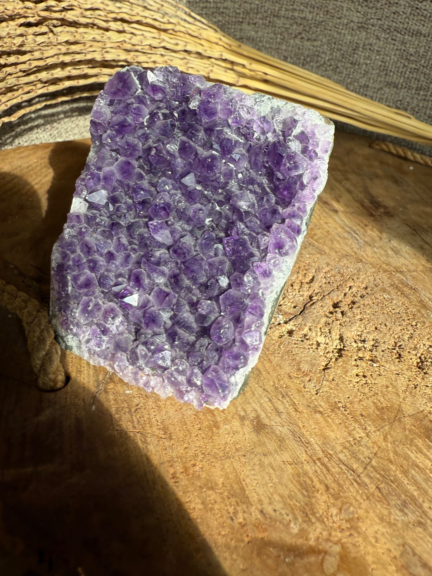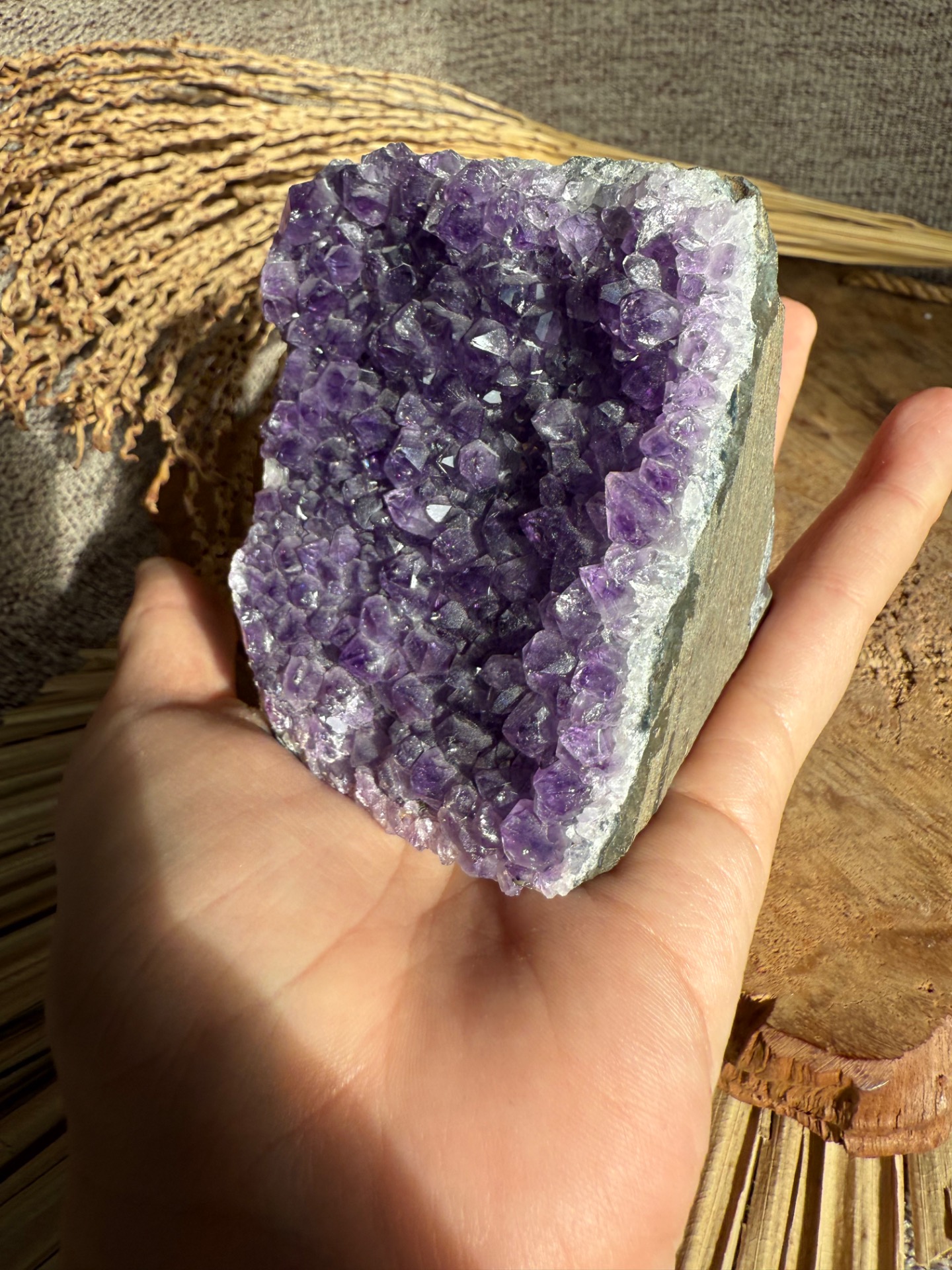Vizualita a úprava: Tento kus je ponechaný v autentickej drúze, ktorá zvýrazňuje bohaté fialové odtiene a prirodzený lesk krištálov. Každá drúza je jedinečná – presne tak, ako ju vidíte na fotografiách.