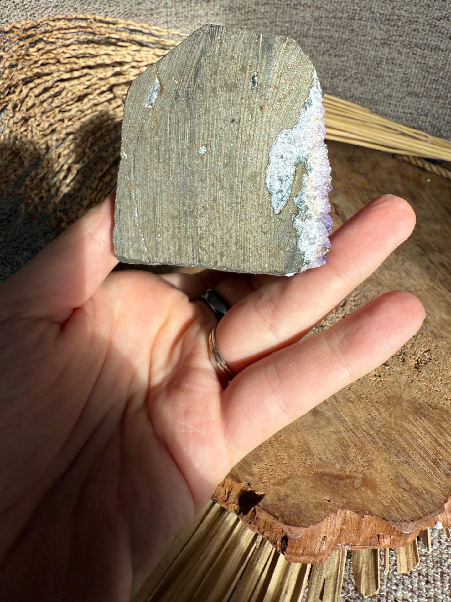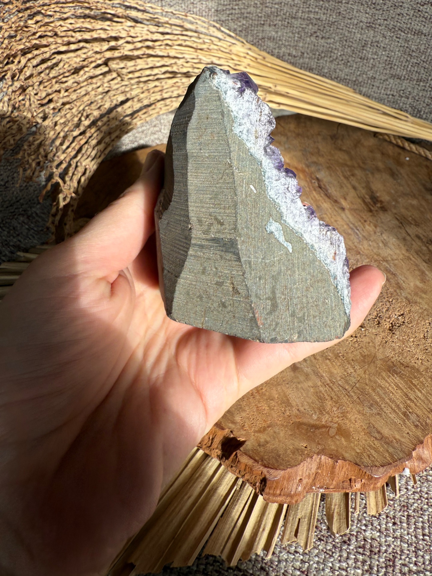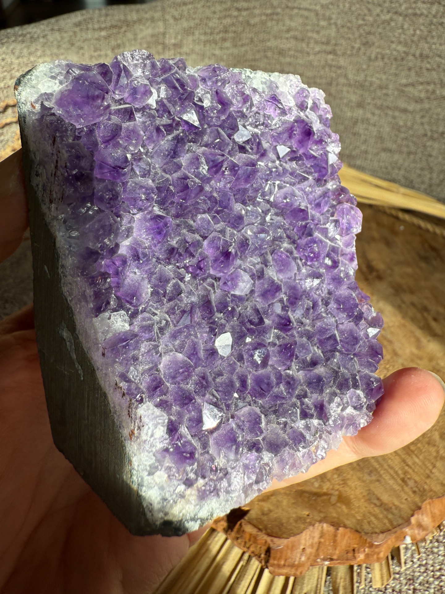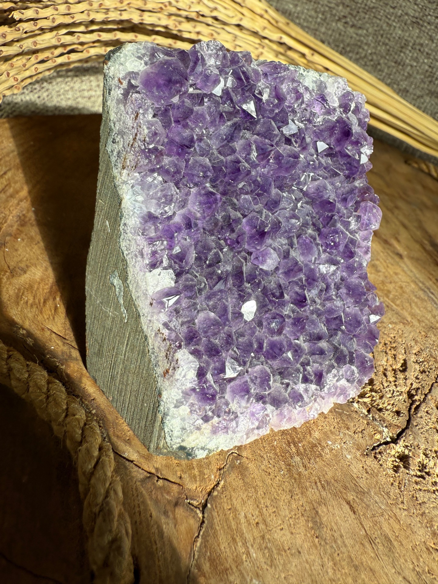 Vizualita a úprava: Tento kus je ponechaný v autentickej drúze, ktorá zvýrazňuje bohaté fialové odtiene a prirodzený lesk krištálov. Každá drúza je jedinečná – presne tak, ako ju vidíte na fotografiách.