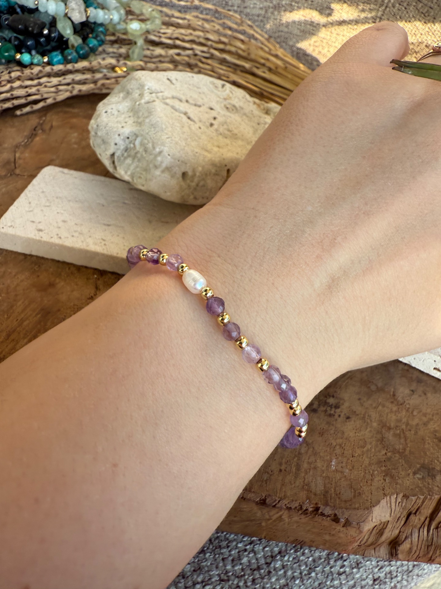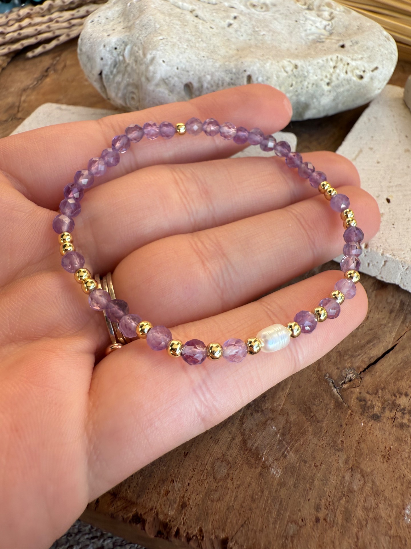 Elegantný a veľmi jemný náramok vytvorený z drobných fazetovaných korálok Ametyst doplnených o prírodnú Riečna perla. Vďaka malému 3 mm výbrusu pôsobí náramok subtílne, žensky a zároveň veľmi elegantne – ideálny na každodenné nosenie aj vrstvenie s ďalšími šperkami.