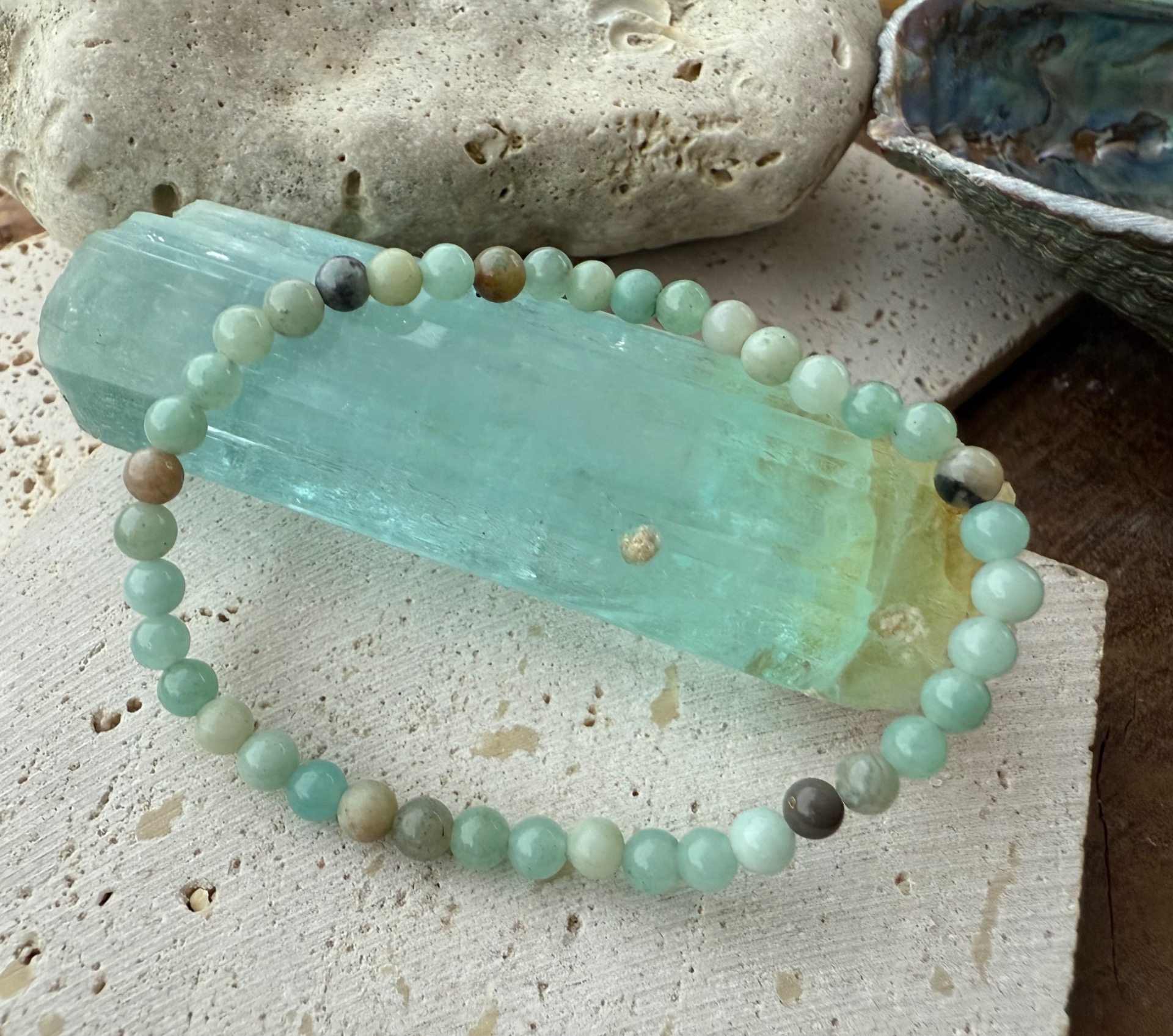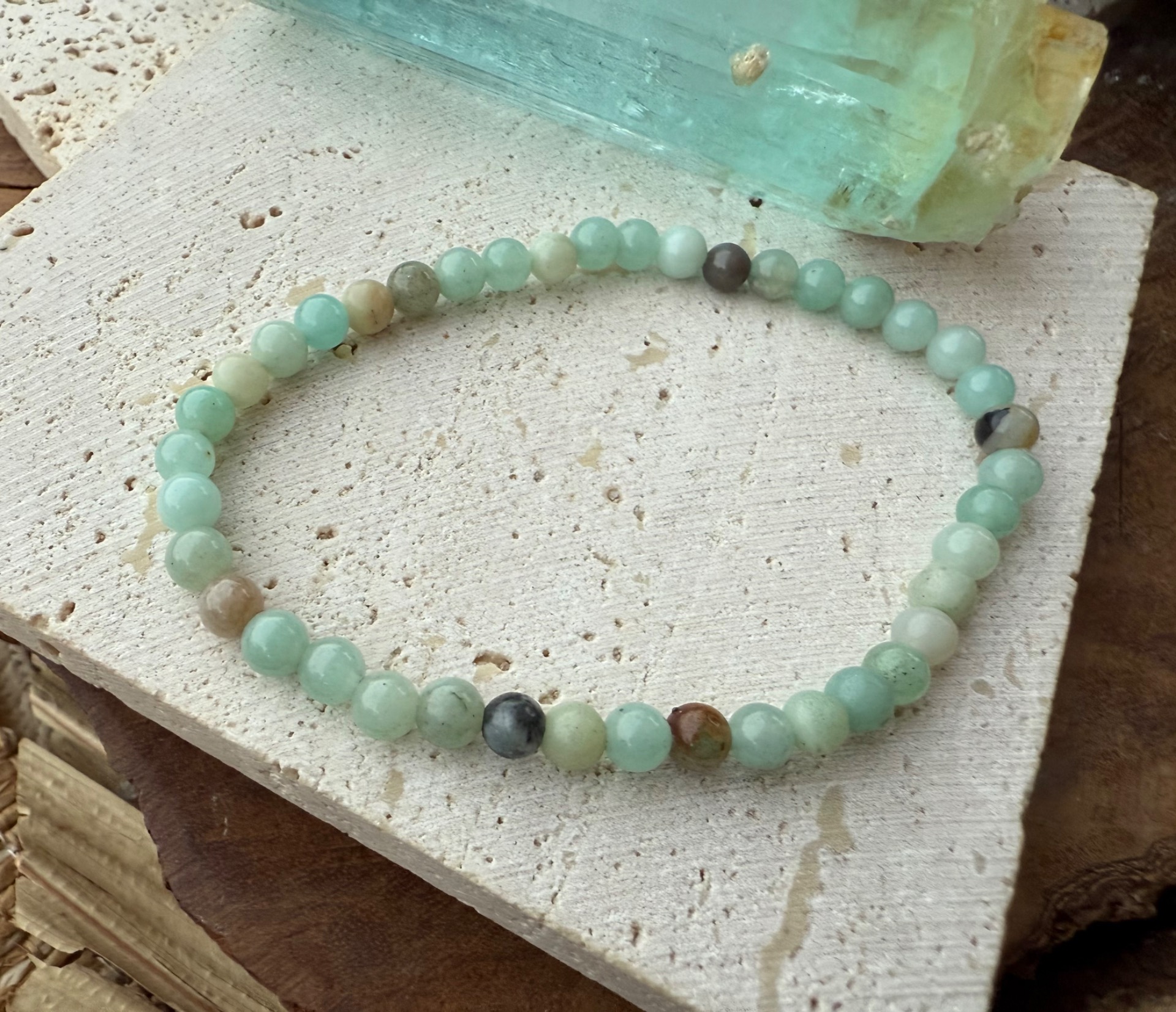 Vďaka svojej jemnej, vyrovnávajúcej energii je amazonit vhodný na celodenné nosenie a krásne sa kombinuje s ďalšími minerálnymi náramkami.