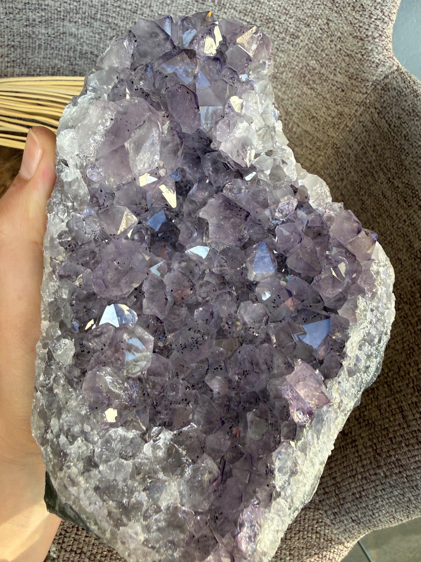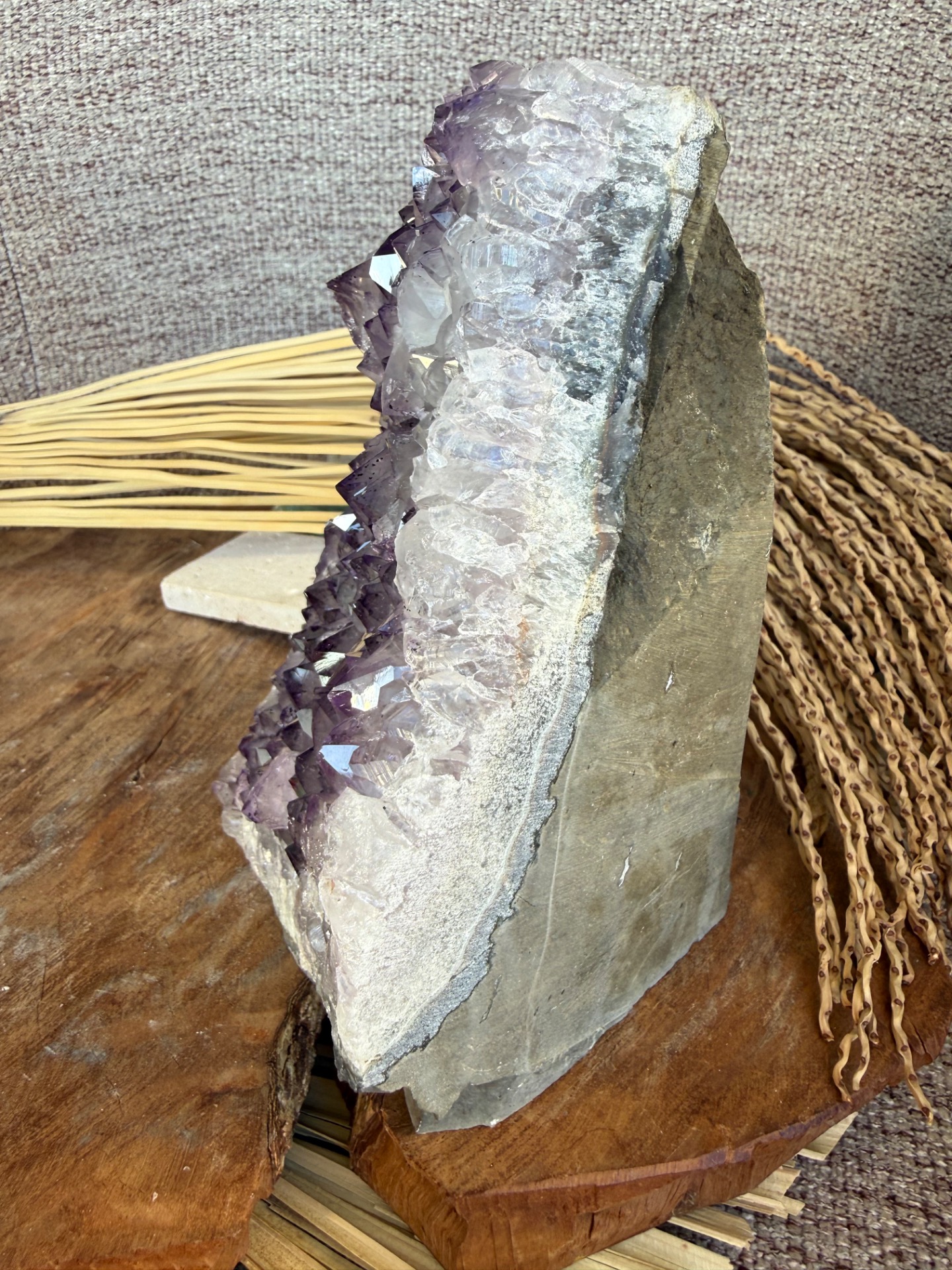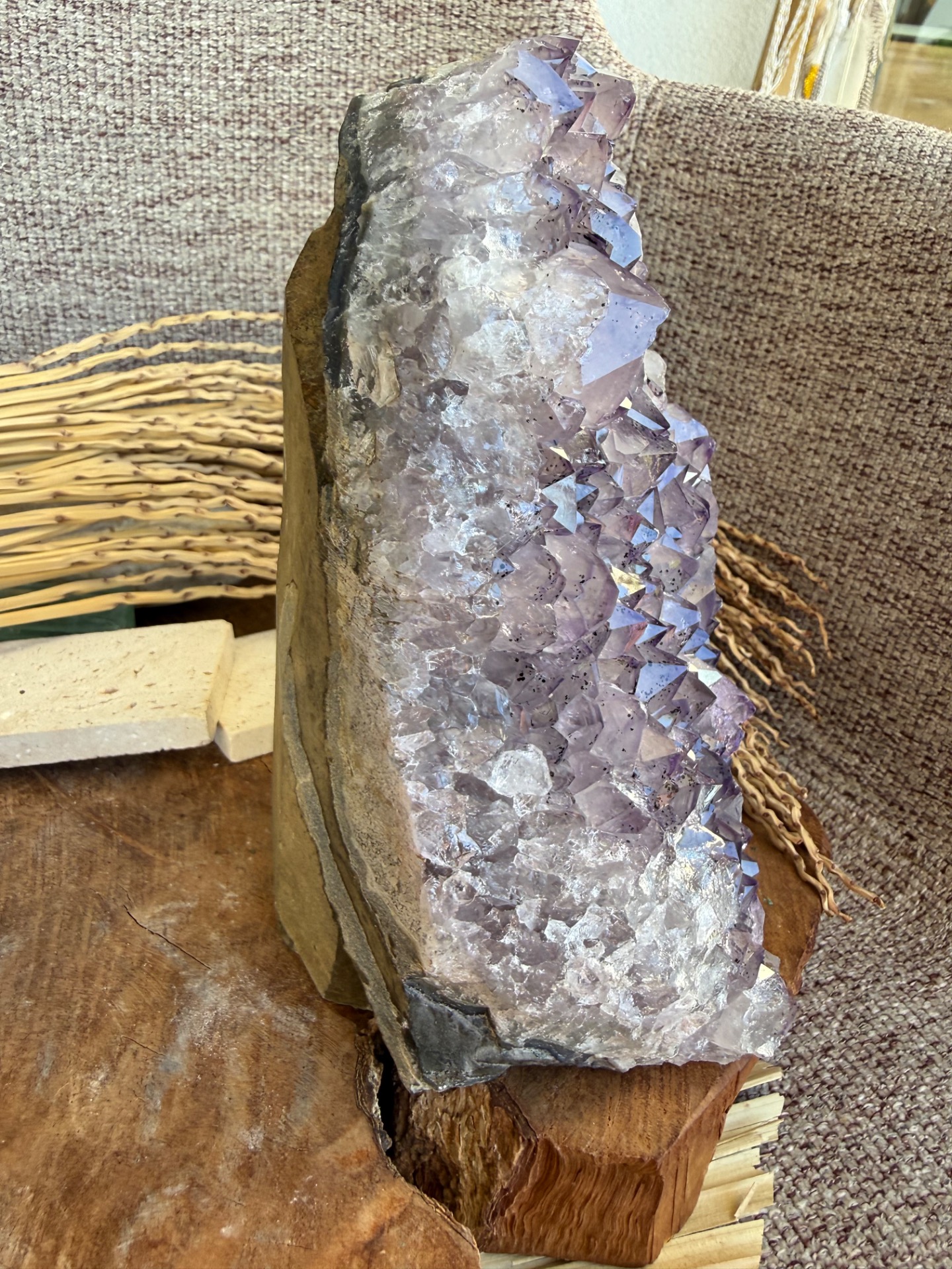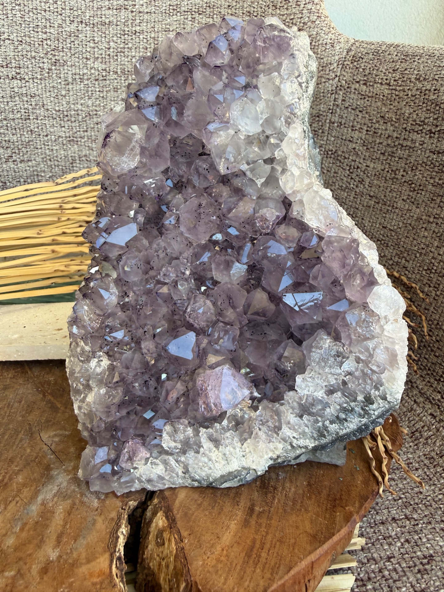 Táto nádherná ametystová drúza z Brazílie je výrazný, no zároveň jemne pôsobiaci prírodný kúsok s hmotnosťou 2 kg. Vyniká svetlejšími, jemne fialovými kryštálmi, ktoré pôsobia veľmi čisto, vzdušne a harmonicky. Ide o krásny prírodný solitér, ktorý v priestore vytvára pocit pokoja a jemnej ochrany.