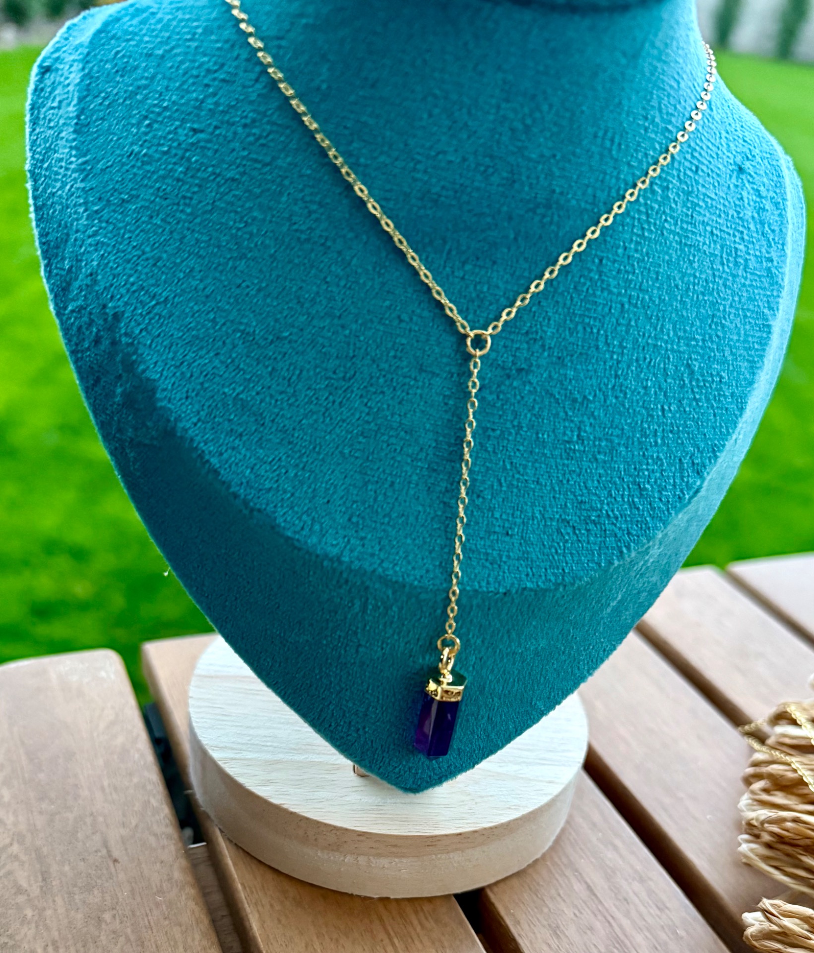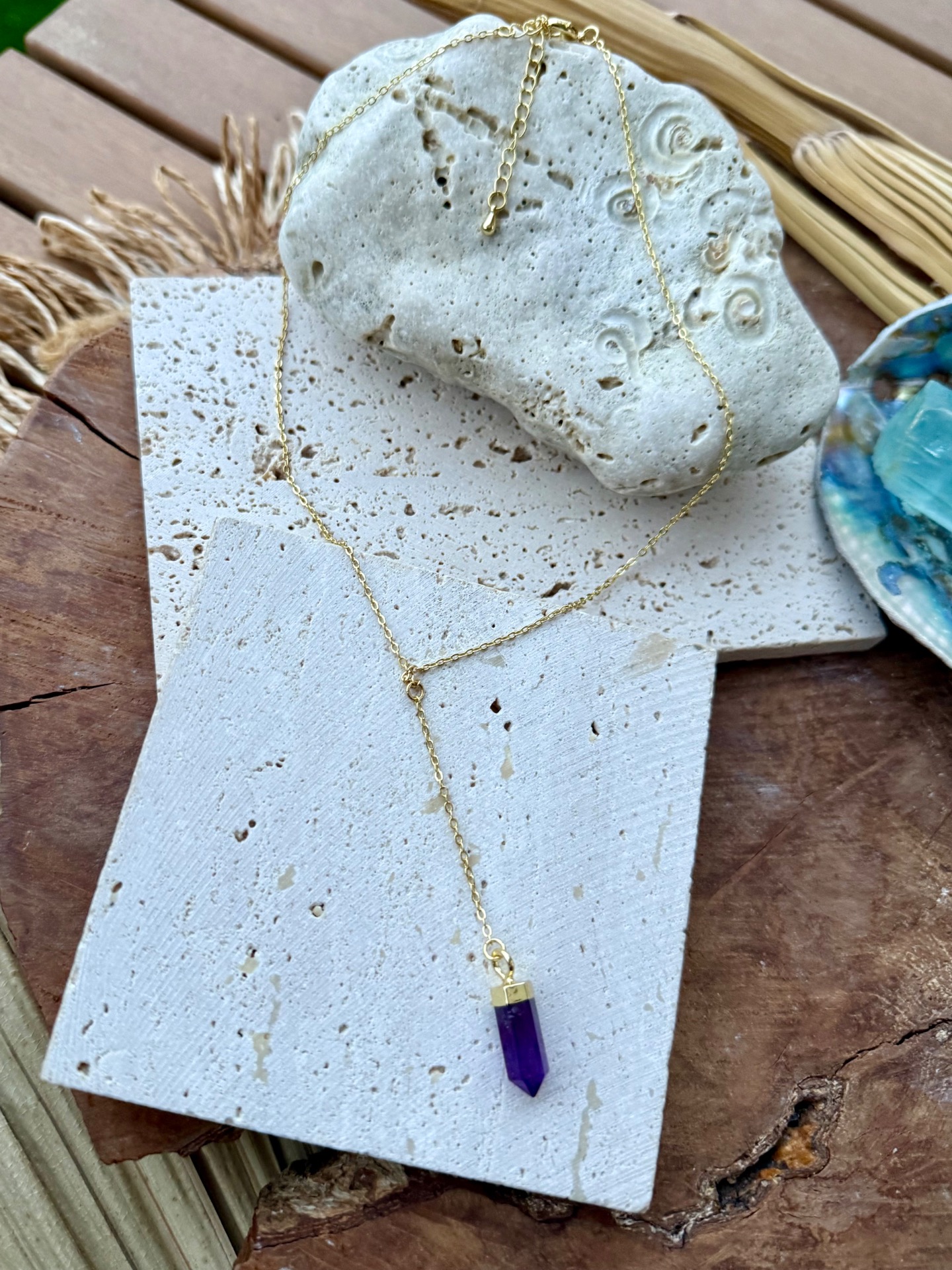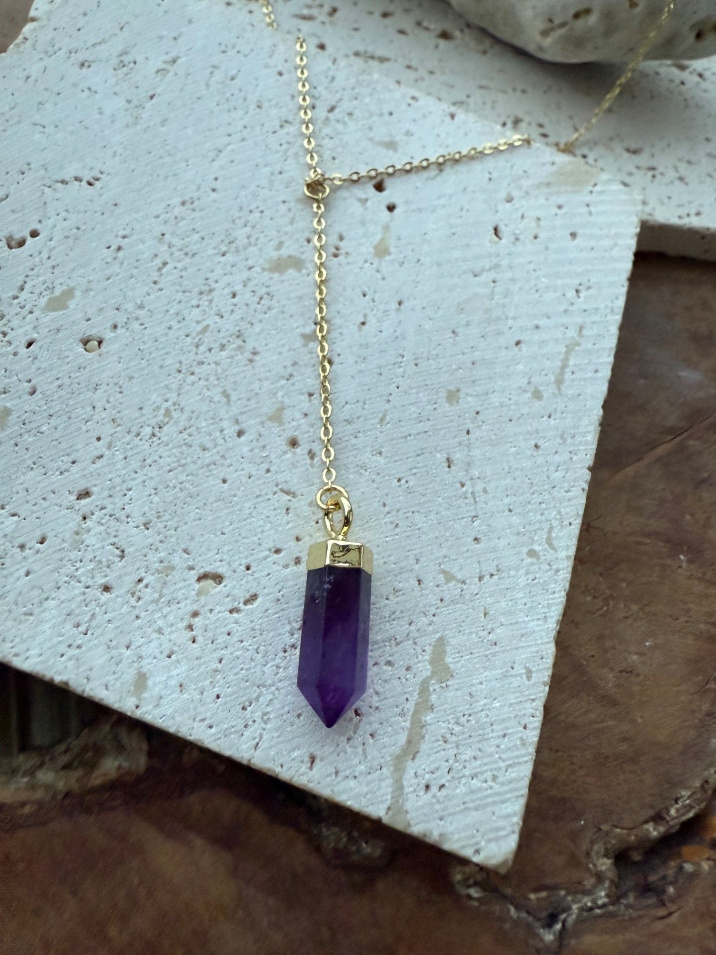 Elegantná Y retiazka s jemným zlatým leskom 18k gold plated prináša do každého dňa sofistikovanú eleganciu a energiu. Na jej konci visiaci hrot ametystu podporuje vnútorný pokoj, jasnosť mysle a duchovnú rovnováhu, pričom dodáva šperku jemný a trblietavý akcent.