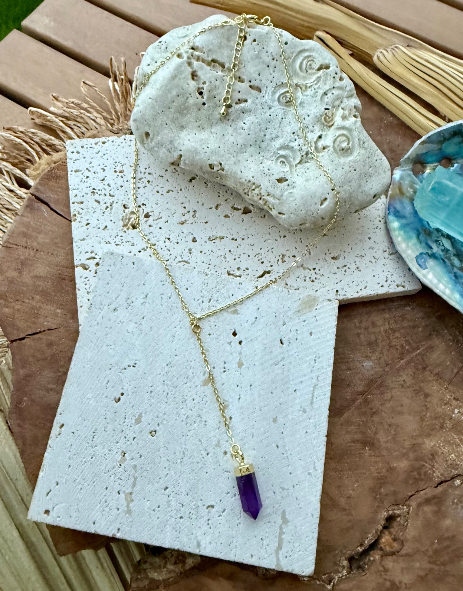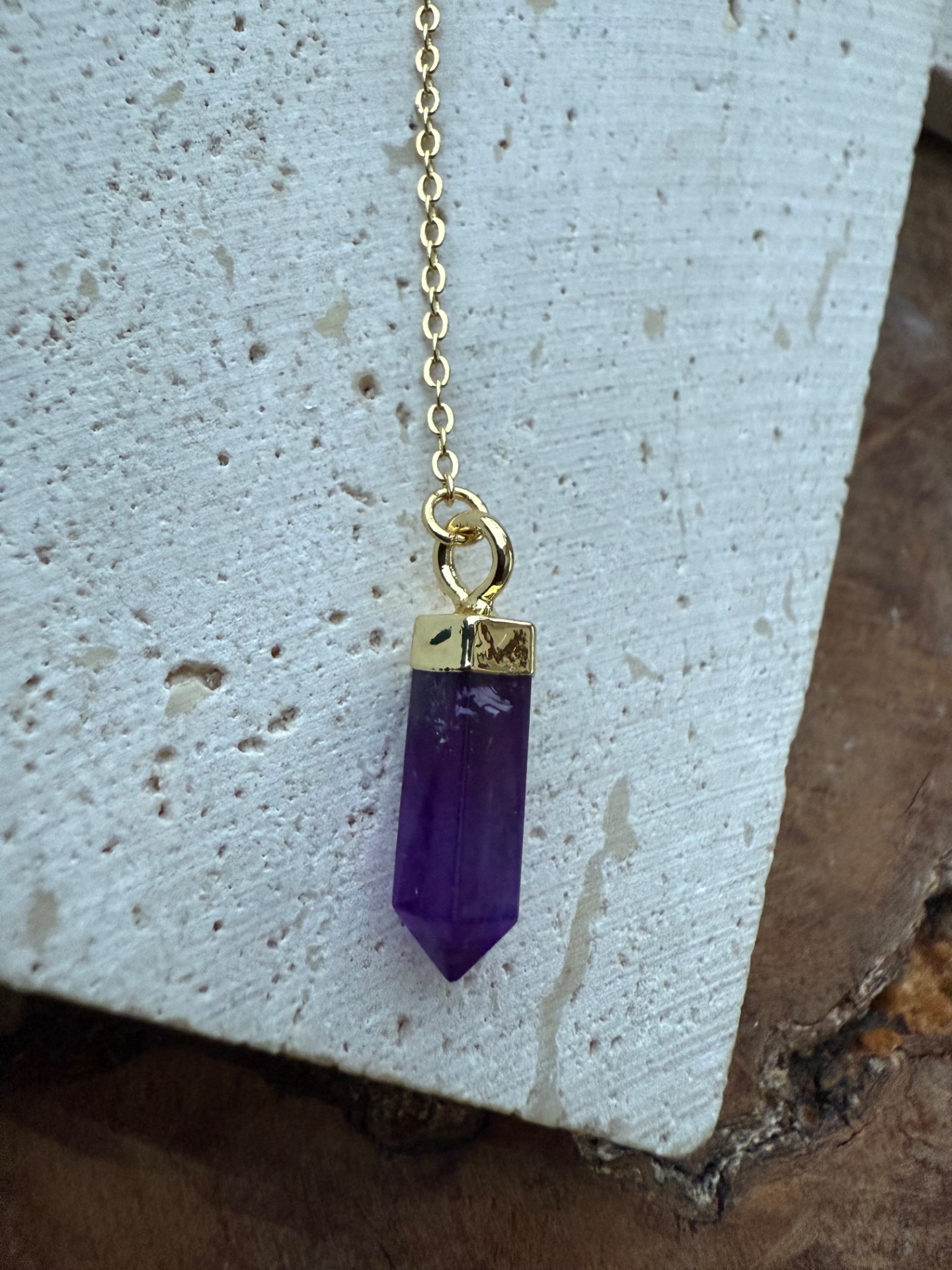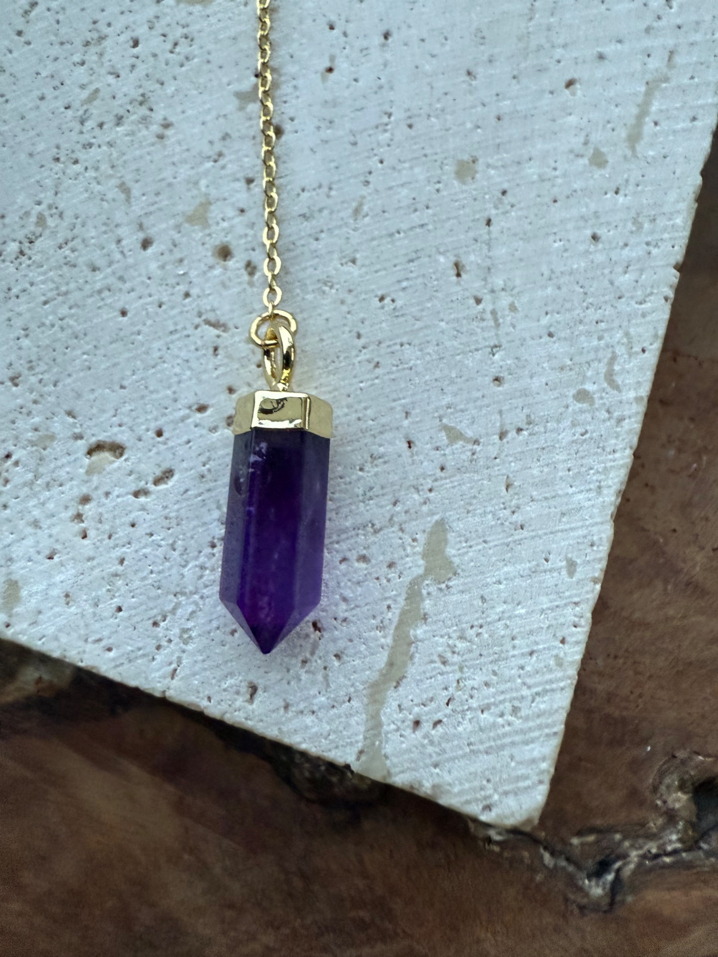 Elegantná Y retiazka s jemným zlatým leskom 18k gold plated prináša do každého dňa sofistikovanú eleganciu a energiu. Na jej konci visiaci hrot ametystu podporuje vnútorný pokoj, jasnosť mysle a duchovnú rovnováhu, pričom dodáva šperku jemný a trblietavý akcent.