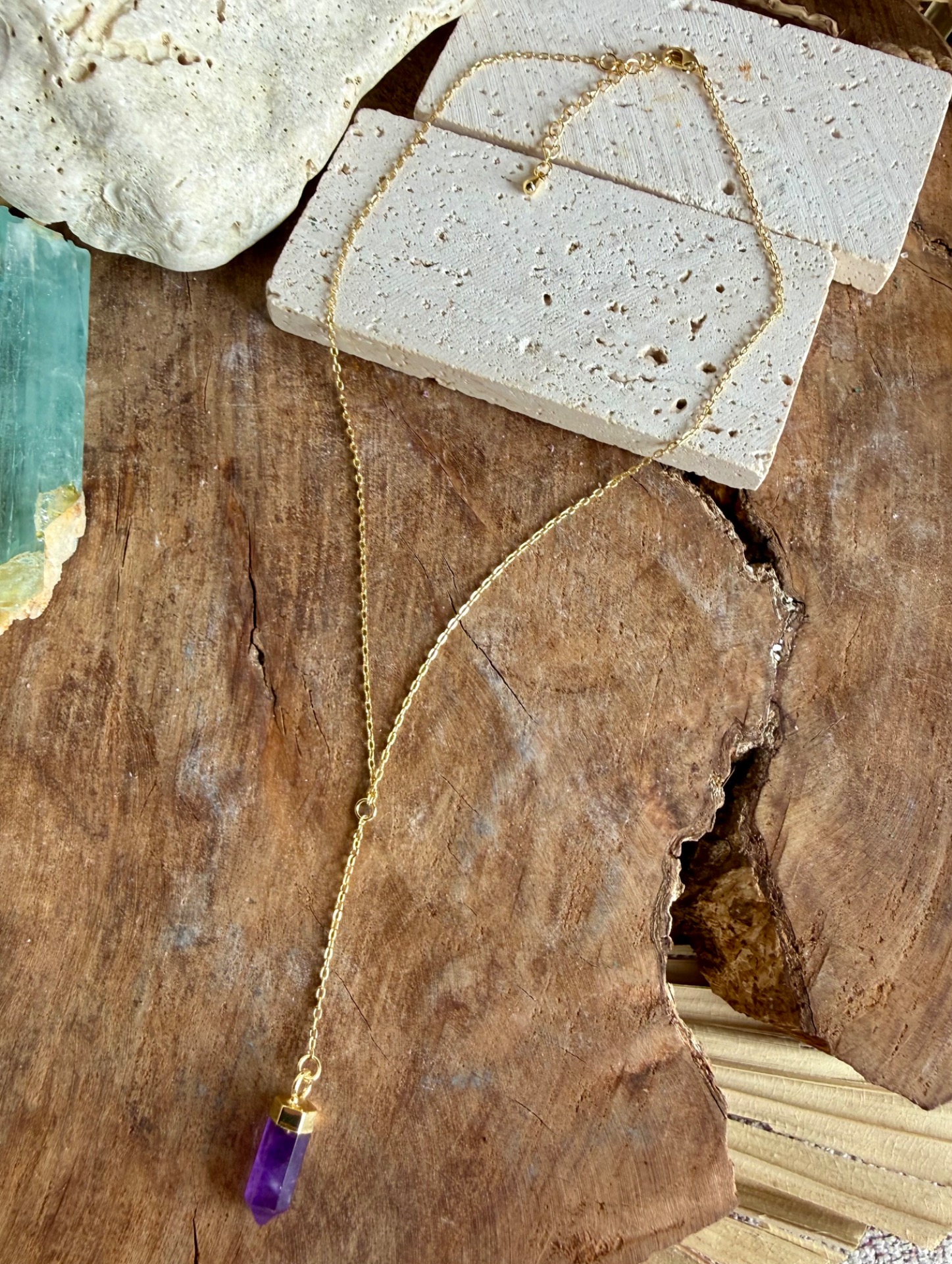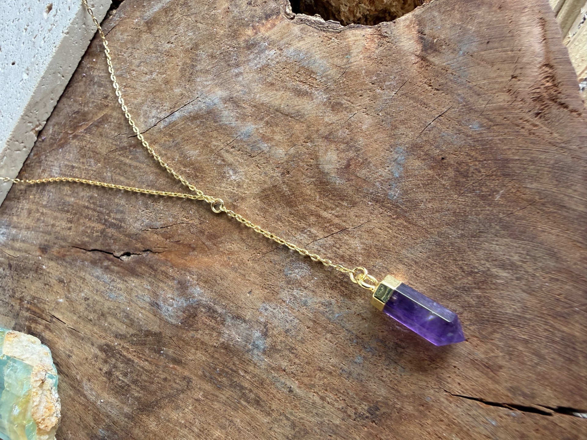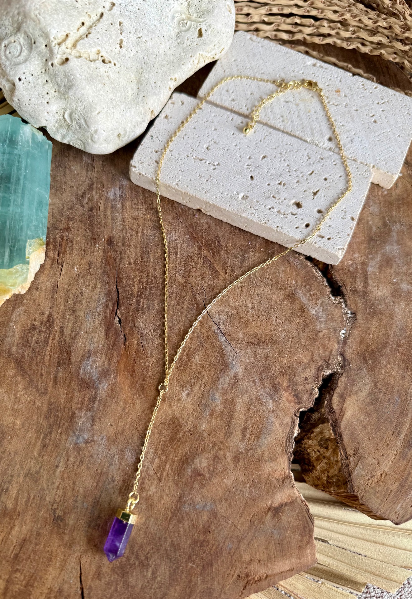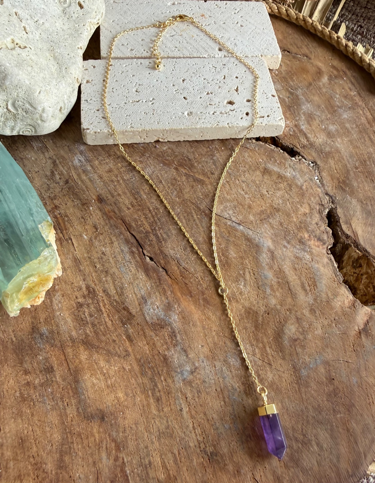 Jemná zlatá retiazka v tvare Y elegantne kopíruje líniu krku a dekoltu a vytvára prirodzene ženský, predĺžený efekt. Dominantou je brúsený prívesok z ametystu, ktorý jemne odráža svetlo a nesie v sebe hlbokú, pokojnú energiu.