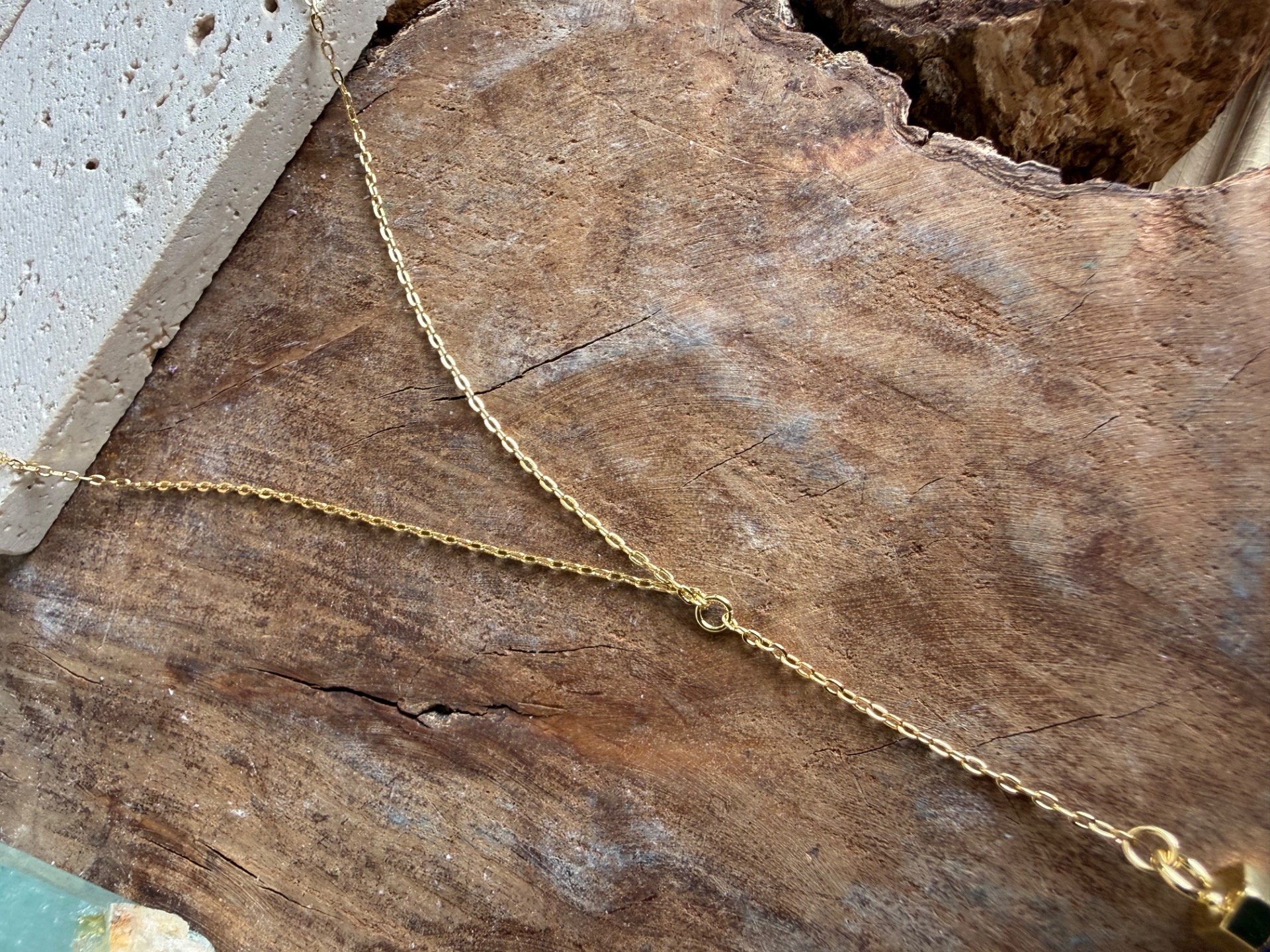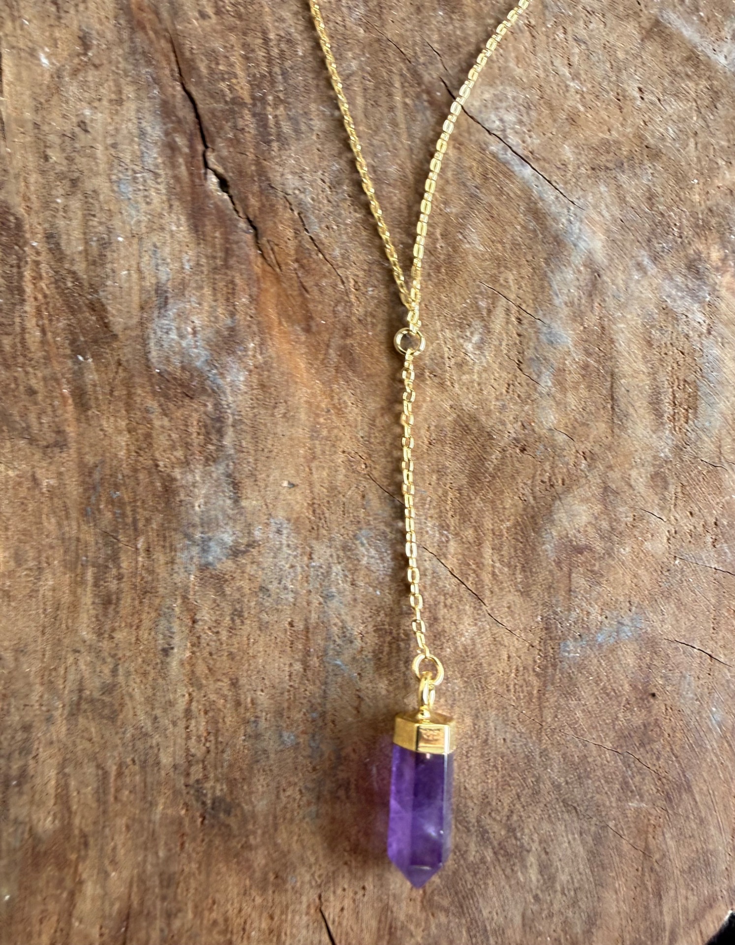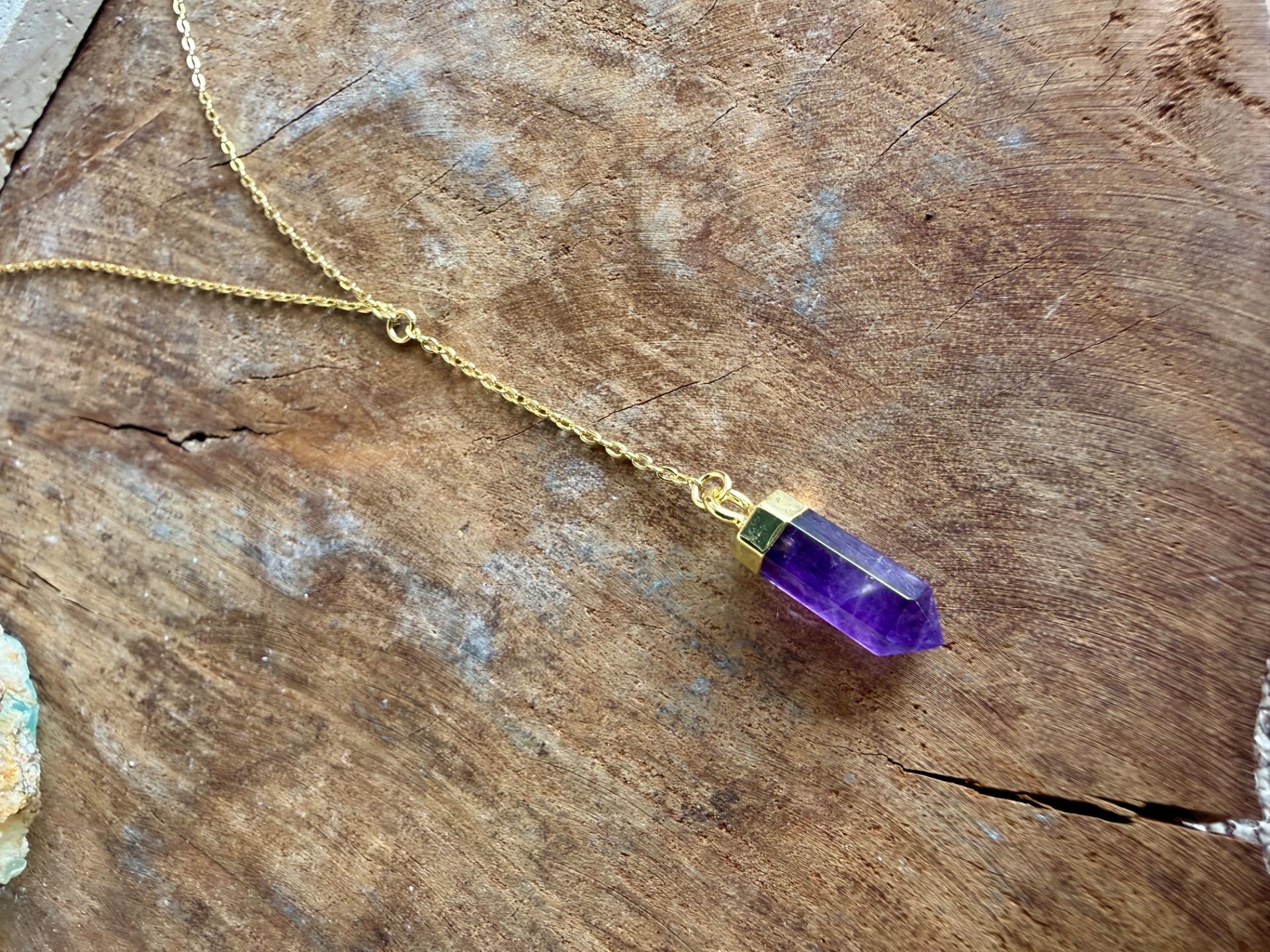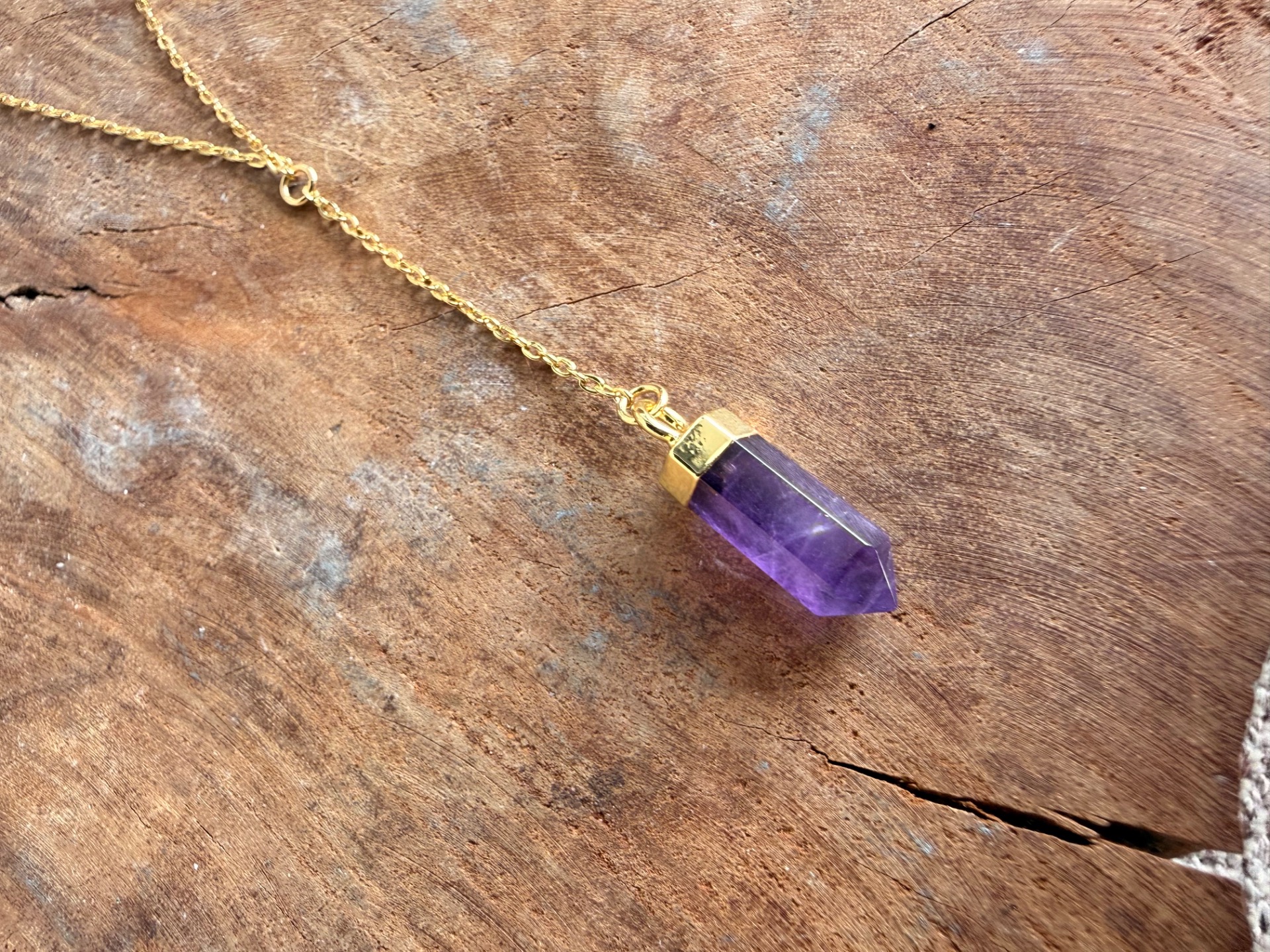 Jemná zlatá retiazka v tvare Y elegantne kopíruje líniu krku a dekoltu a vytvára prirodzene ženský, predĺžený efekt. Dominantou je brúsený prívesok z ametystu, ktorý jemne odráža svetlo a nesie v sebe hlbokú, pokojnú energiu.