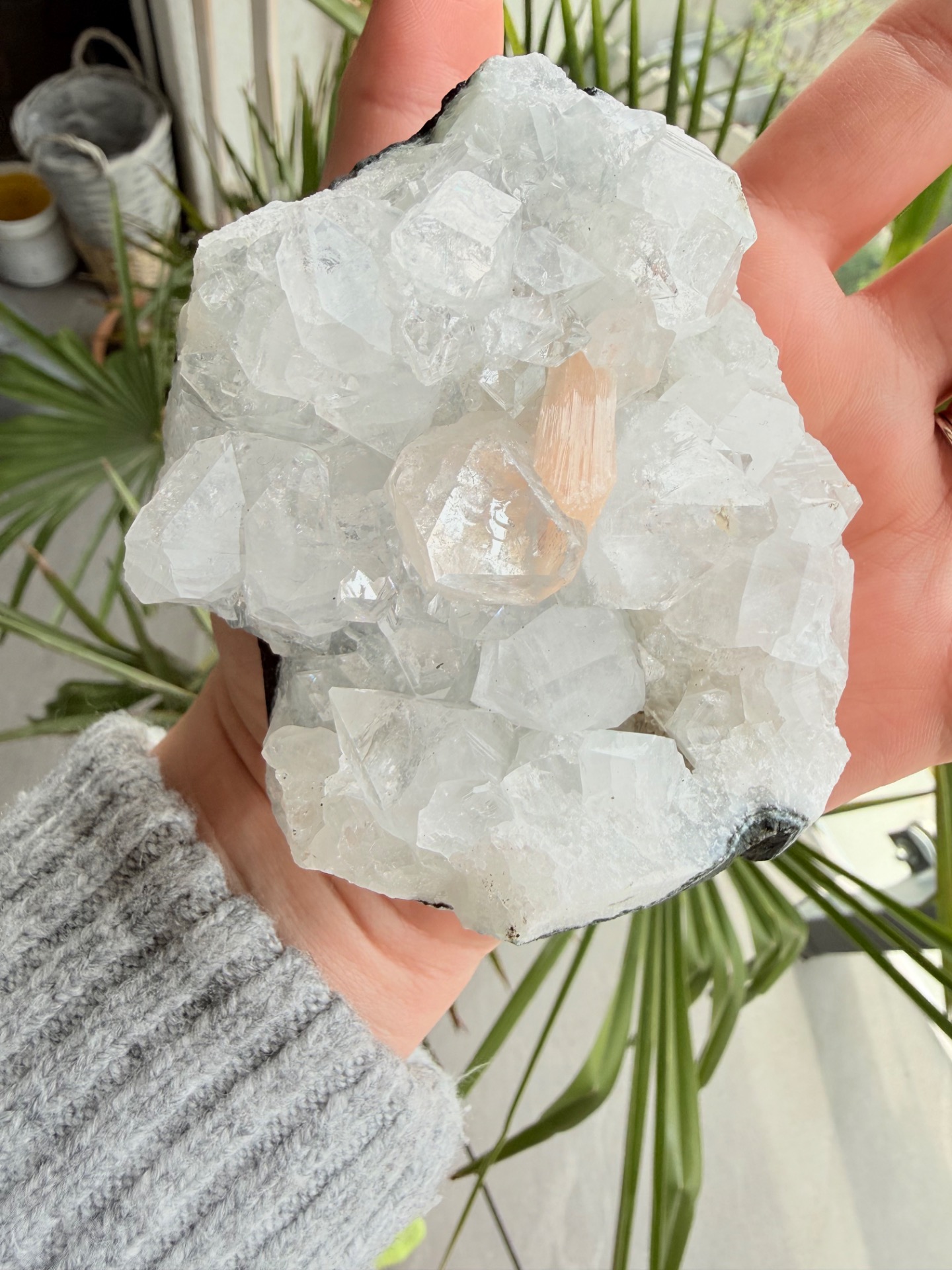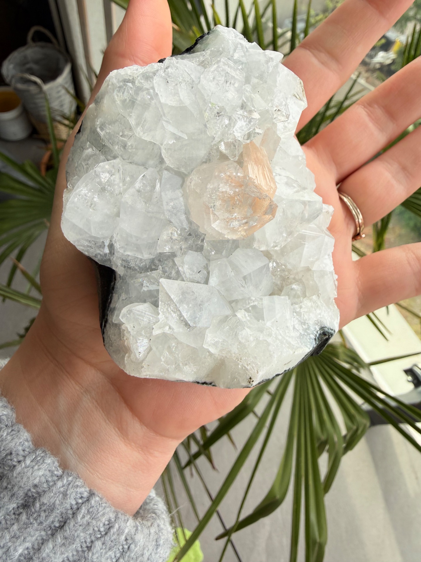 Tento výnimočný zberateľský kúsok spája krištáľovú čistotu apofylitu s jemnou, hrejivou energiou stilbitu. Ich prirodzené spojenie vytvára harmonický celok, ktorý pôsobí nežne, no zároveň veľmi silno a prítomne.