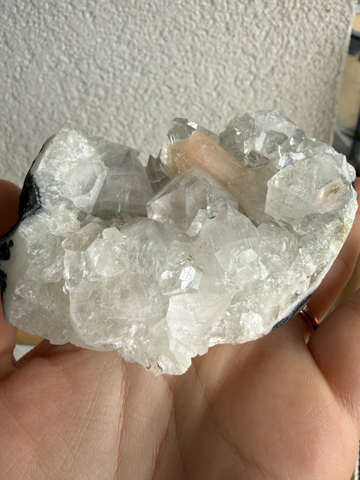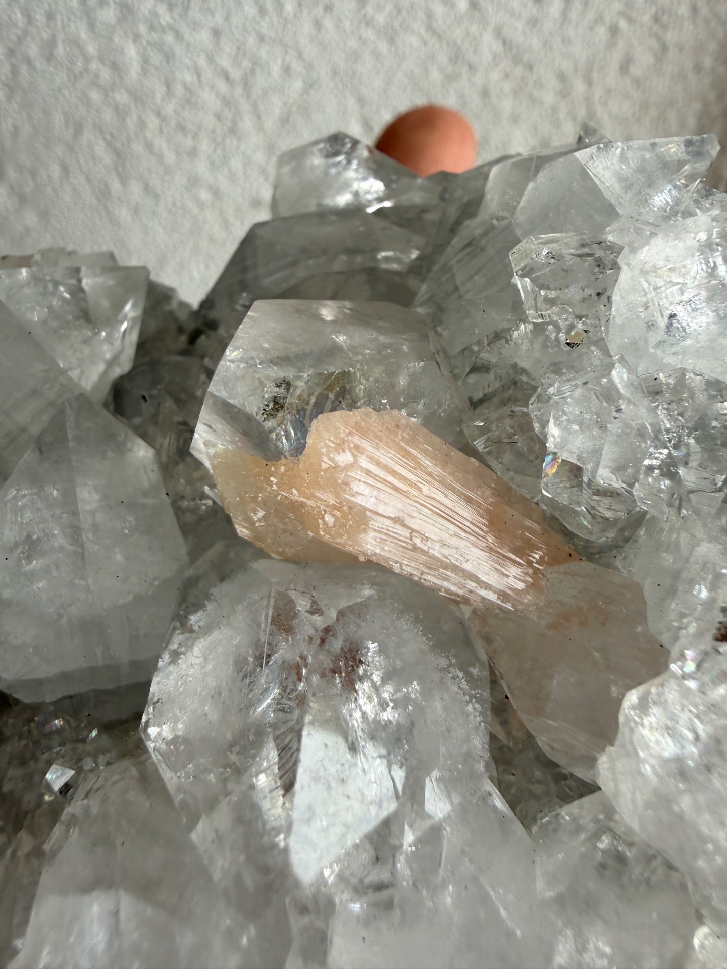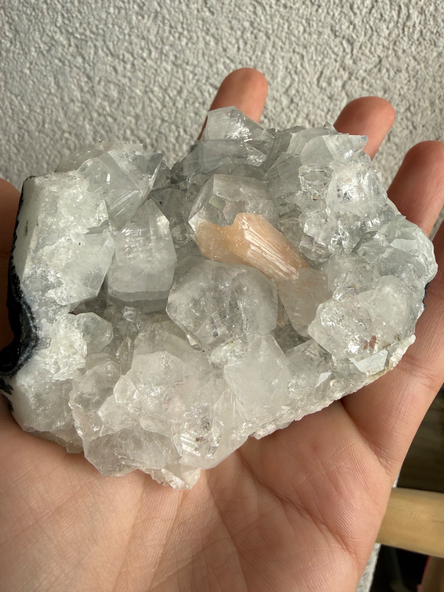 Apofylit zaujme svojím vysokým leskom a schopnosťou krásne odrážať svetlo, zatiaľ čo stilbit svojimi broskyňovo-ružovými tónmi prináša do priestoru jemnosť, pokoj a teplo.