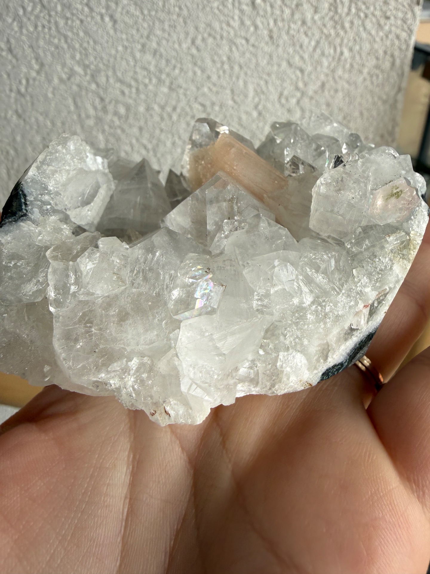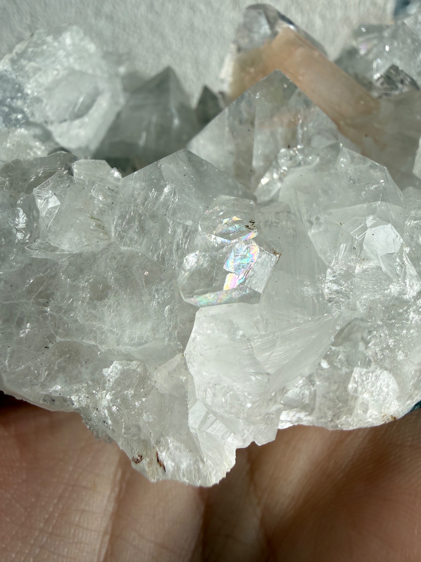 Vnútri kryštálov sa ukrývajú prirodzené dúhy, ktoré sa objavujú pri dopade svetla. Tento detail dodáva minerálu jedinečný, až magický charakter a robí z neho skutočný unikát.
