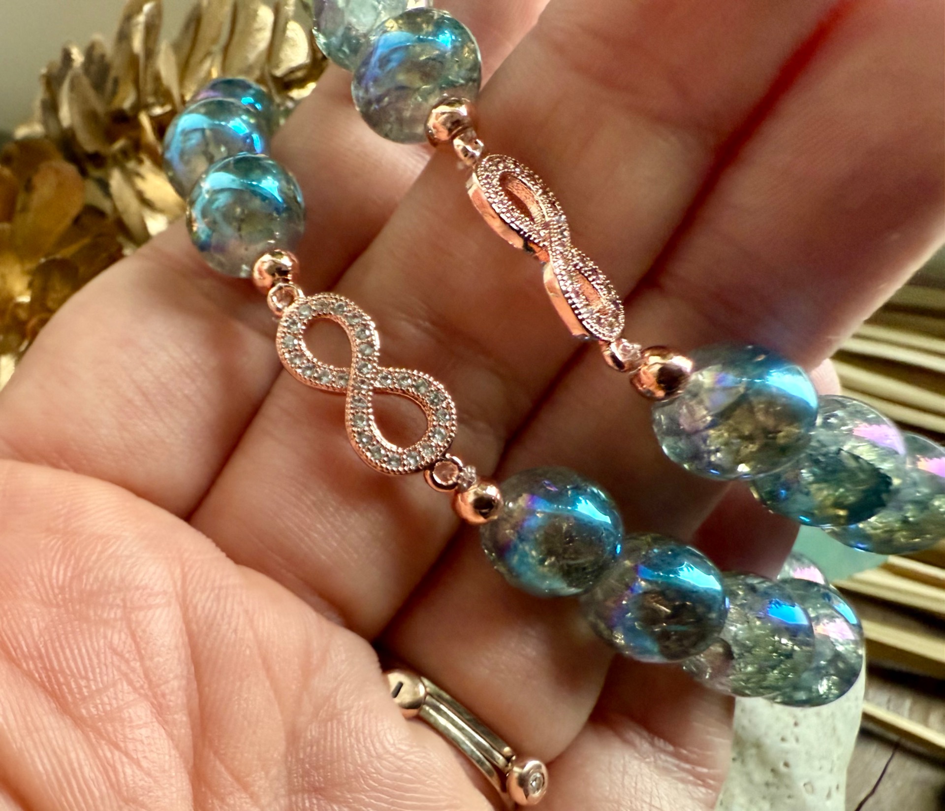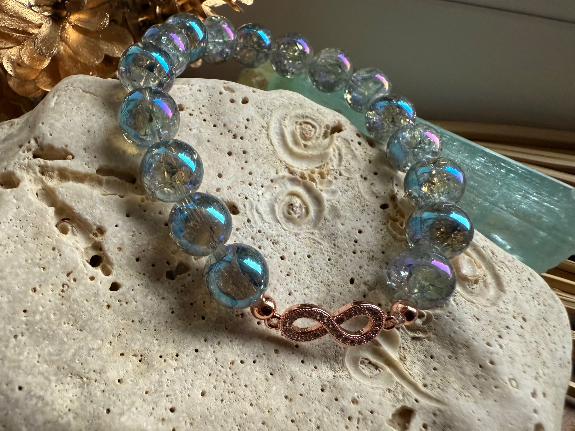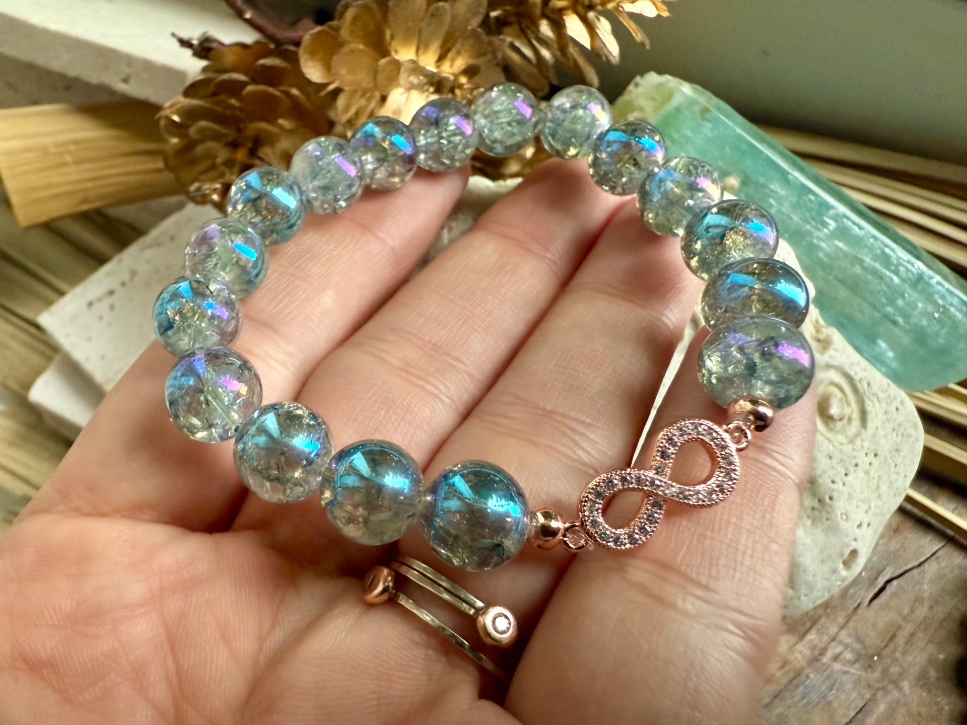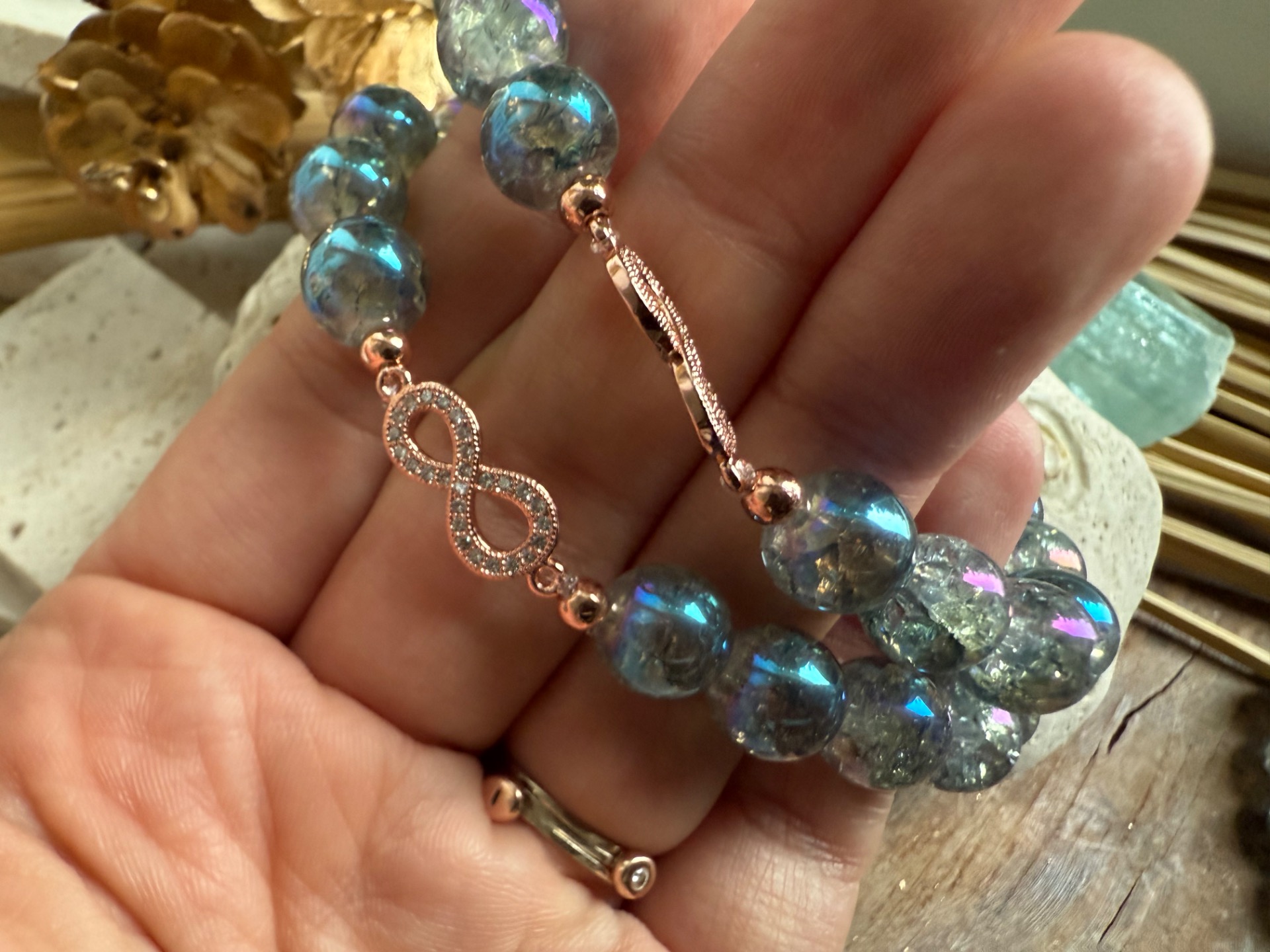 Tento nádherný náramok je vytvorený z 10 mm praskaného aqua aura krištáľu, ktorý odráža jemné modré odtiene a pri každom pohybe zachytáva svetlo, ako by rozohrával nekonečnú energiu radosti.