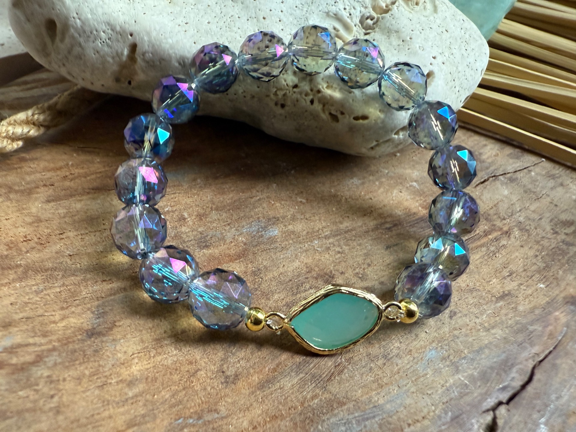 Tento náramok je vytvorený z 10 mm fazetovaných aqua aura modrých krištáľových korálok, ktoré jemne odrážajú svetlo a vytvárajú magickú hru farieb. V strede náramku je doplnok ladený do zlatej, ktorý dodáva šperku elegantný akcent a sofistikovaný vzhľad.