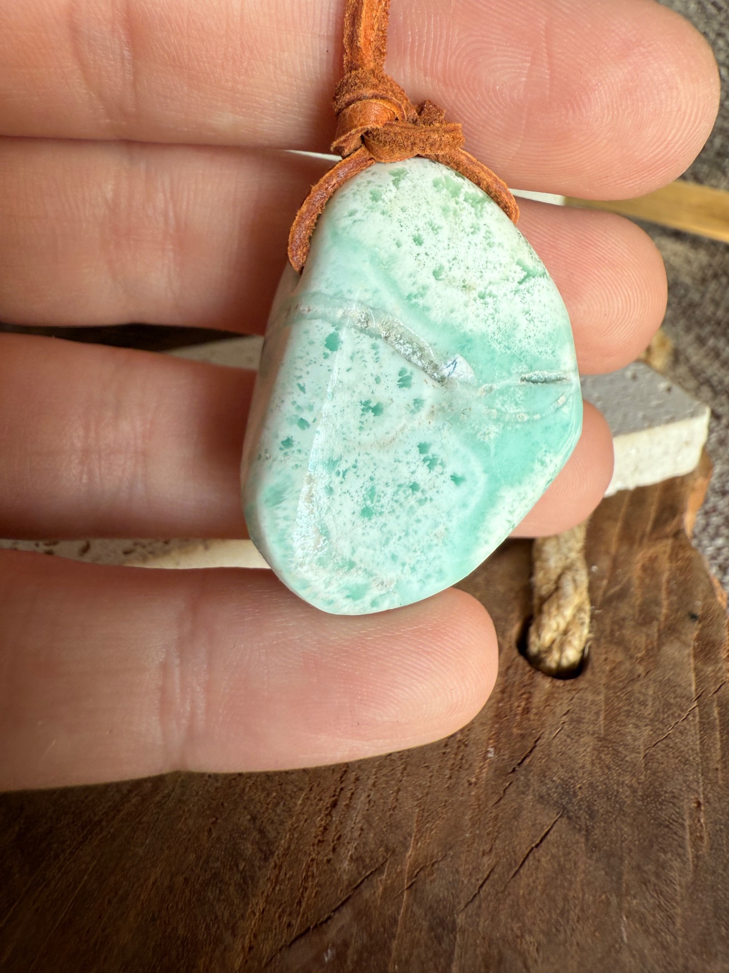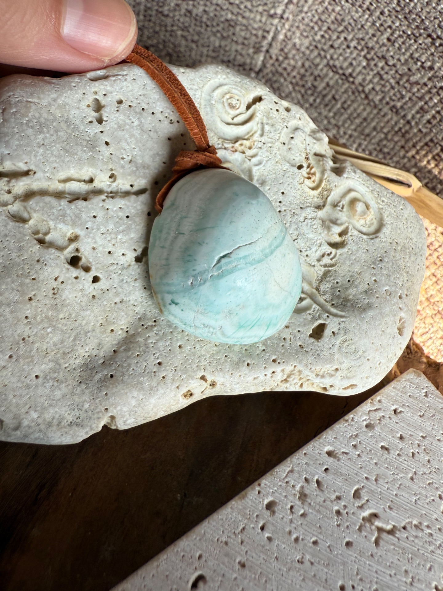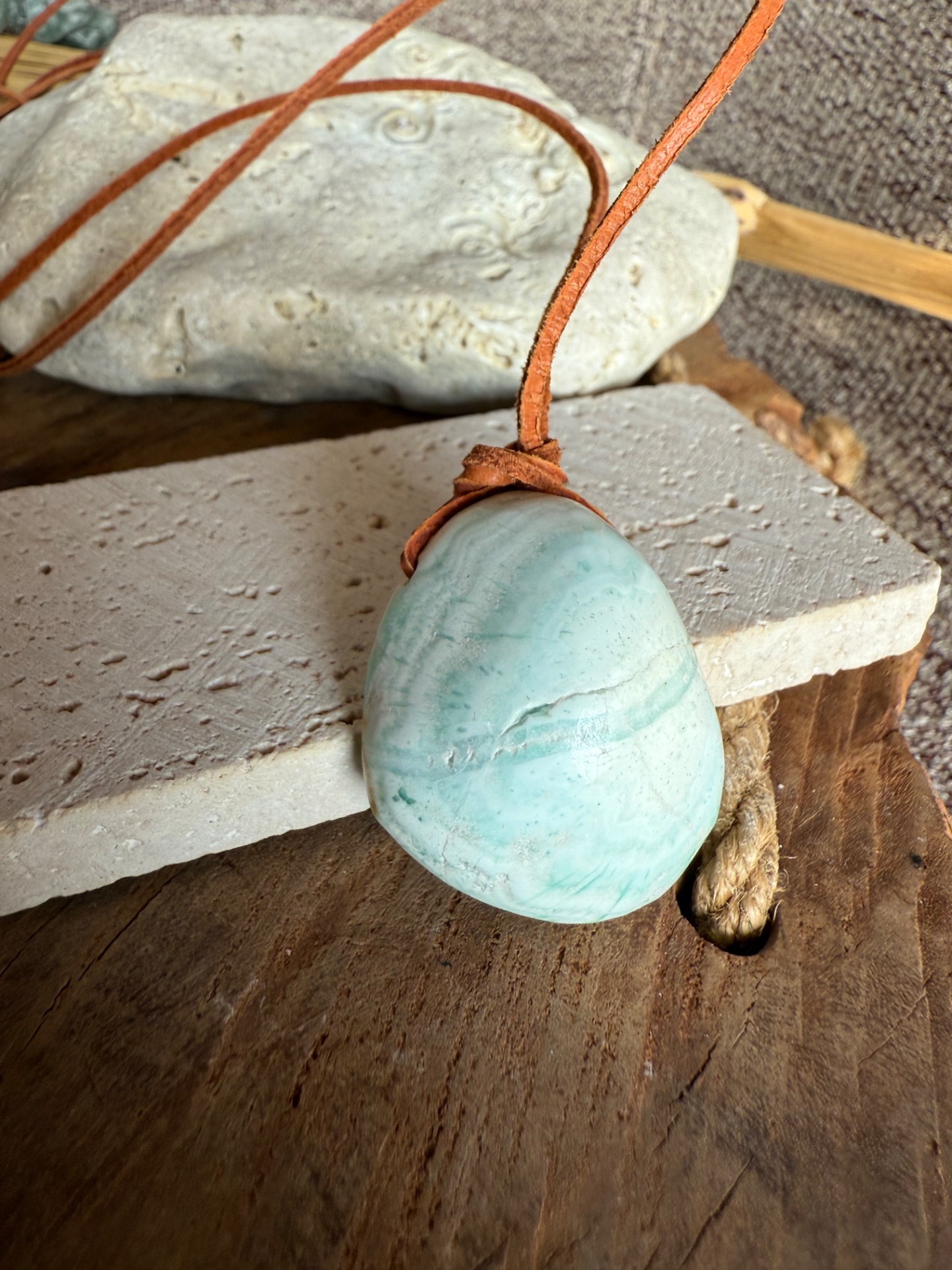 Kameň je tromlovaný do nepravidelného tvaru a vrtaný zhora. Je zavesený na koženej šnúrke.