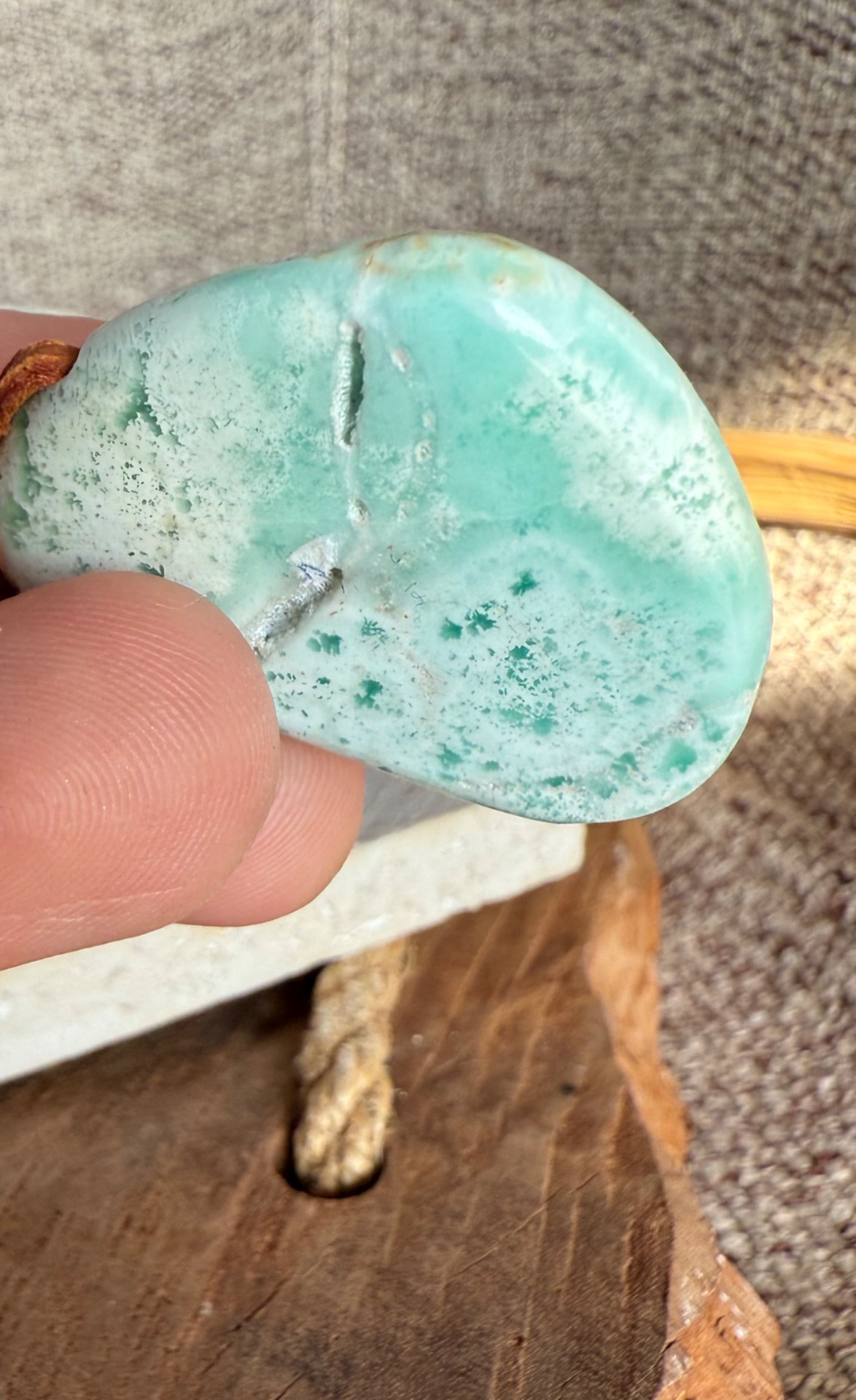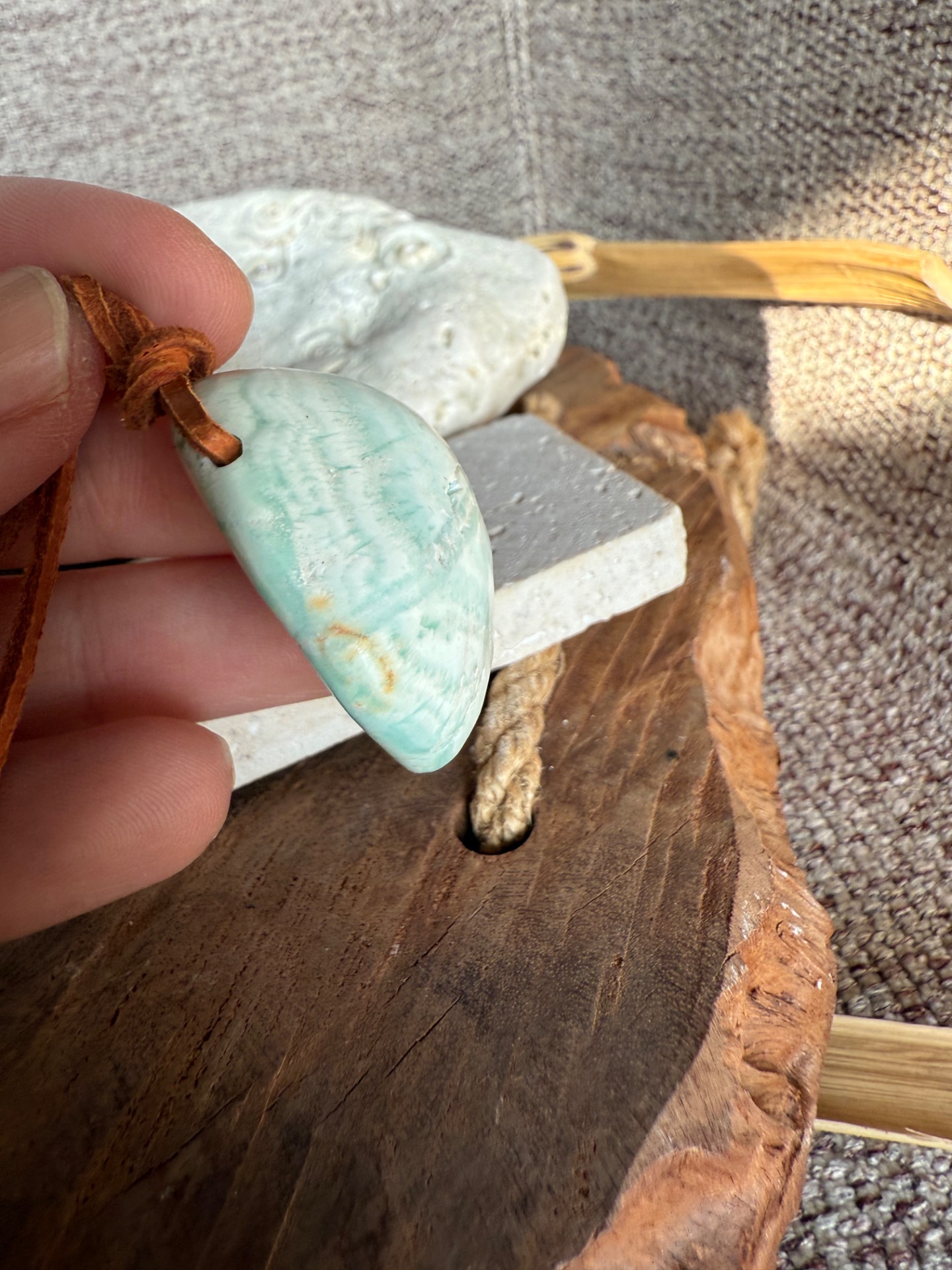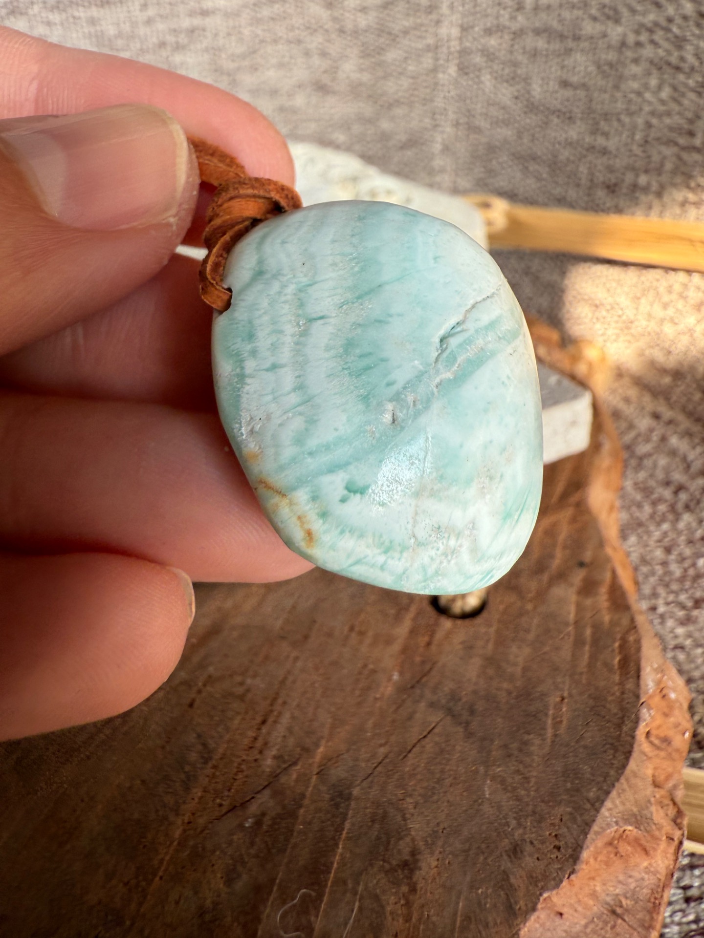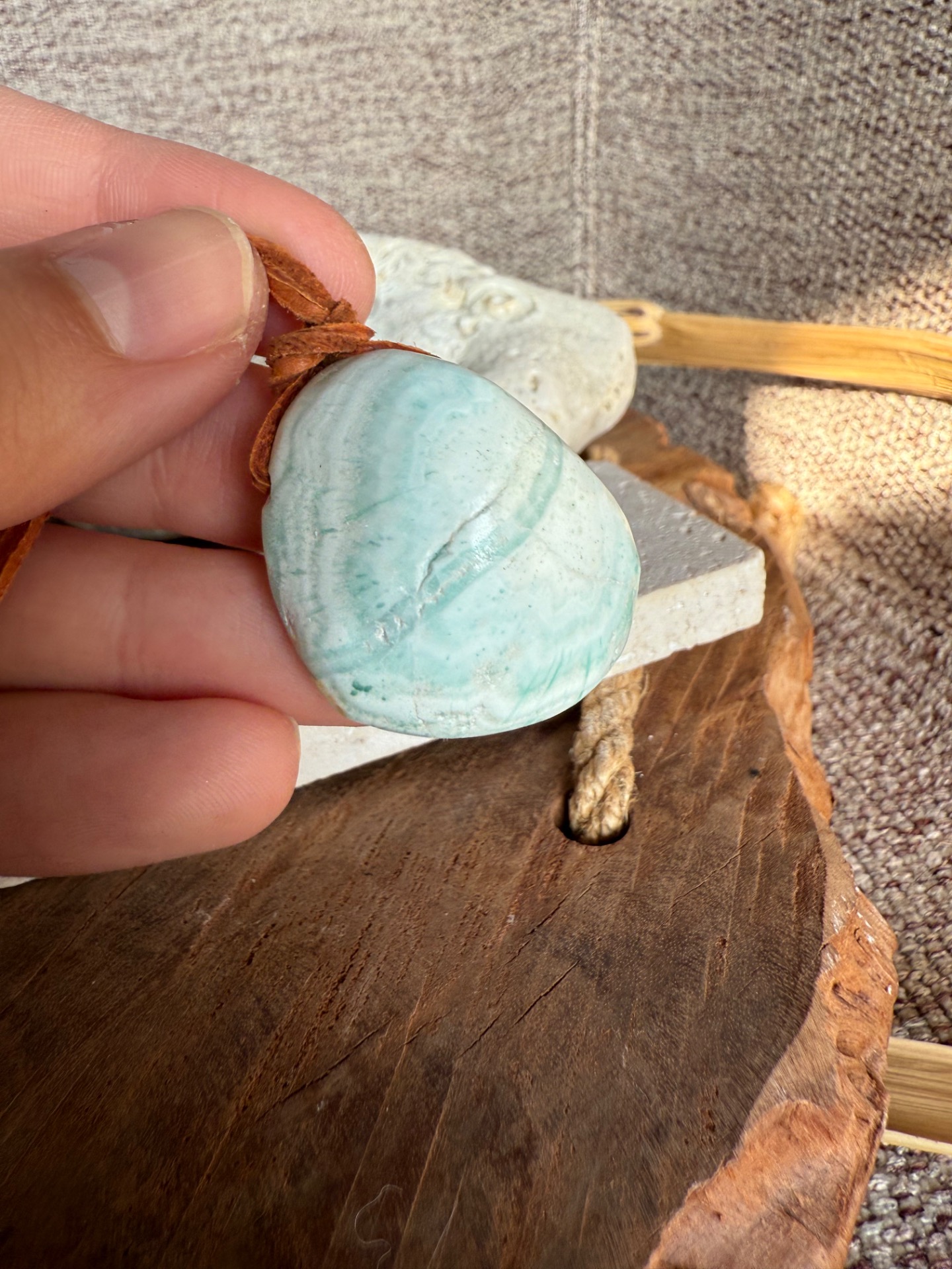Kameň je tromlovaný do nepravidelného tvaru a vrtaný zhora. Je zavesený na koženej šnúrke.