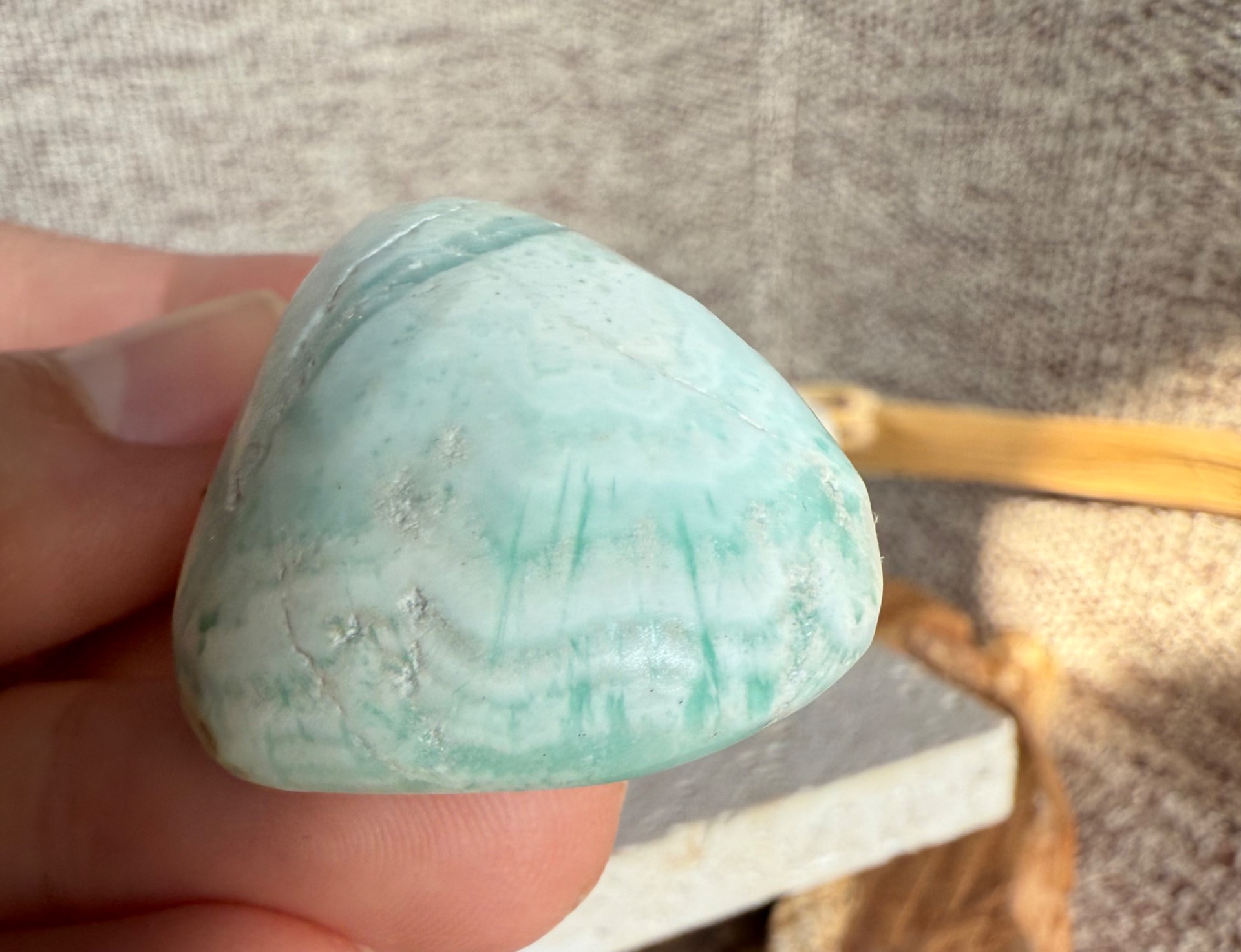 Blue Aragonite, často označovaný aj ako Caribbean Calcite, je jedinečná prírodná kombinácia minerálov modrého kalcitu a aragonitu. Táto fascinujúca symbióza vytvára typické tyrkysovo-modré oblaky s krémovo pieskovými vrstvami, ktoré svojou kresbou pripomínajú pokojné more, lagúny a karibské pláže.