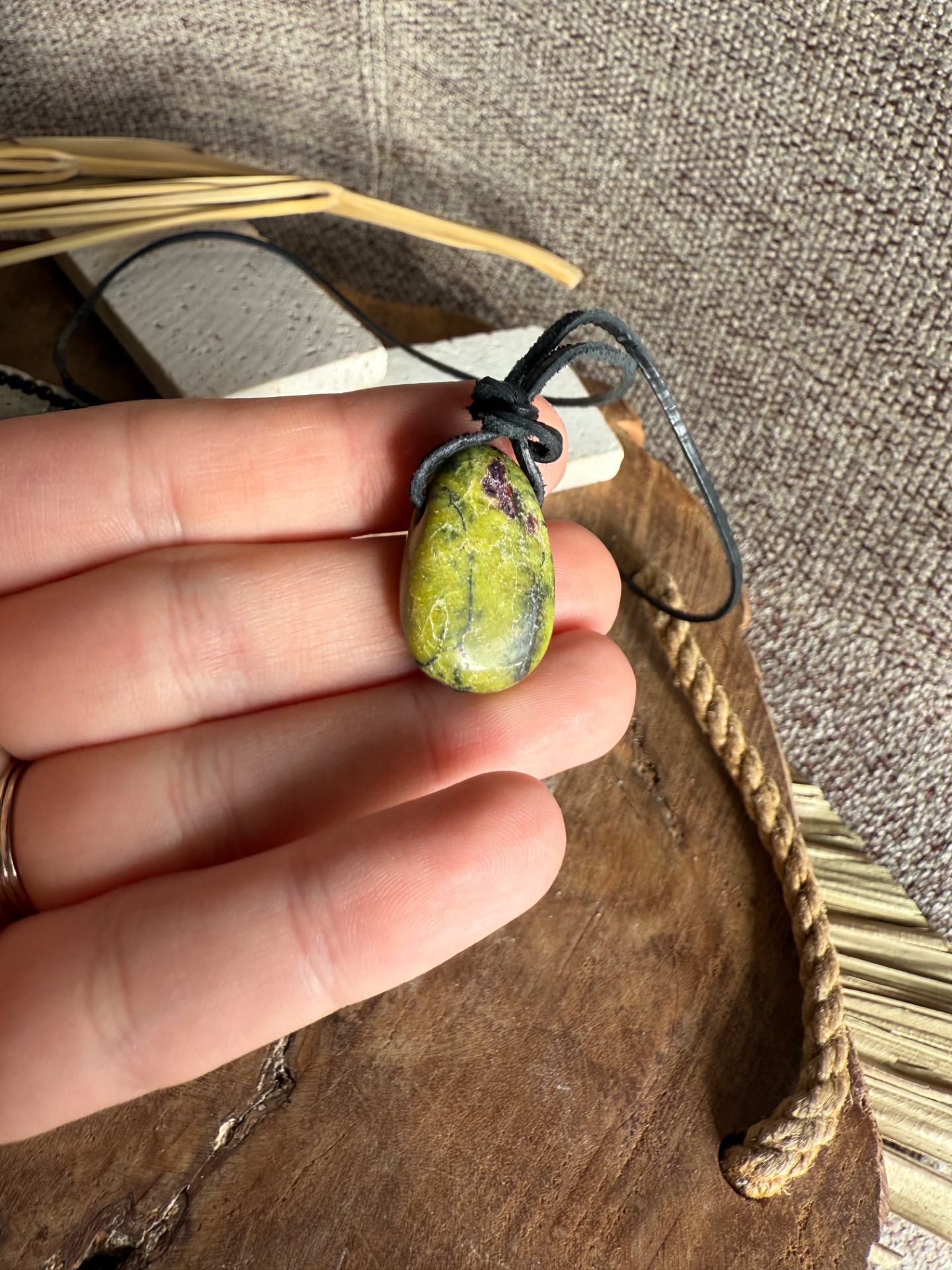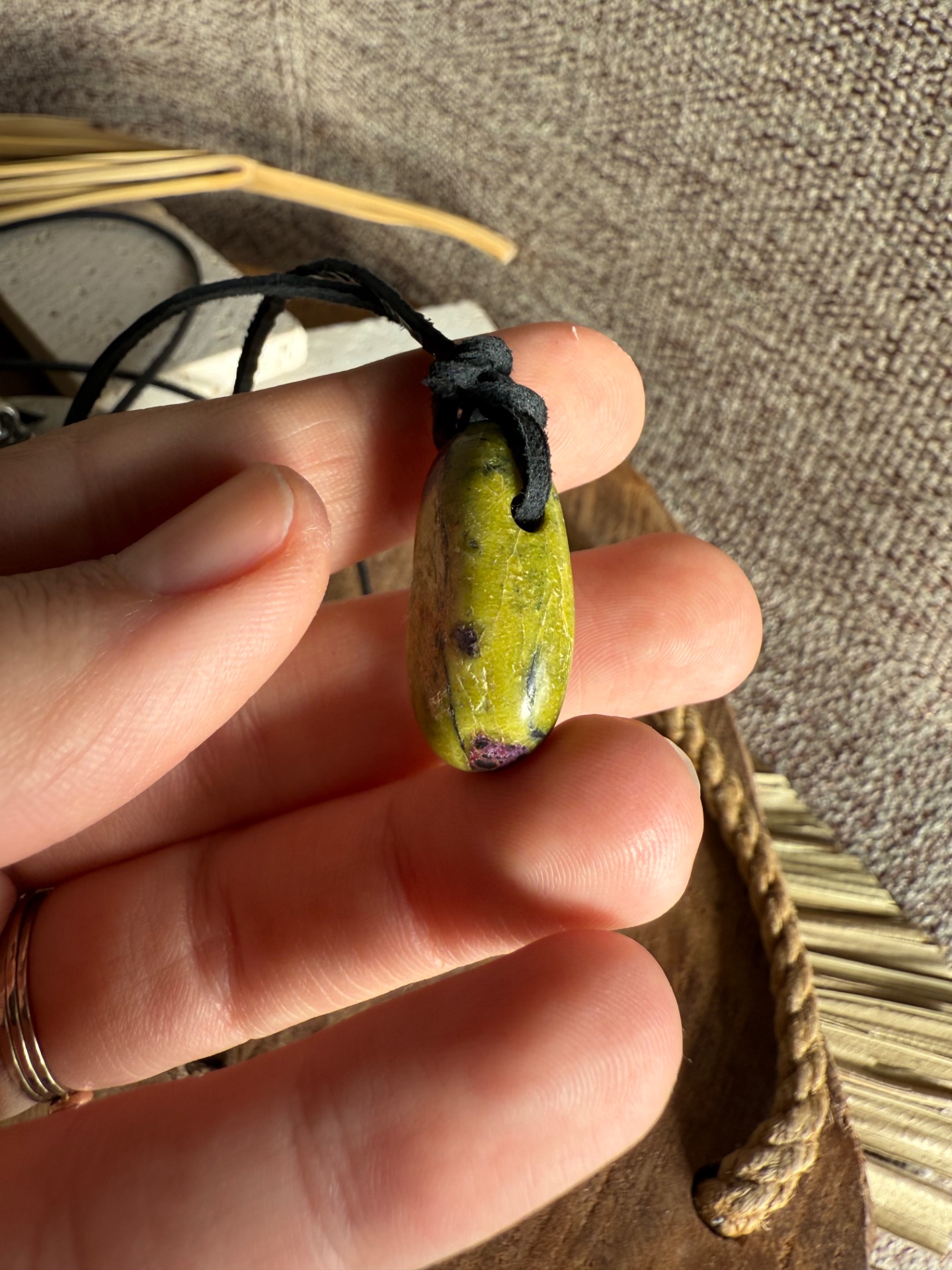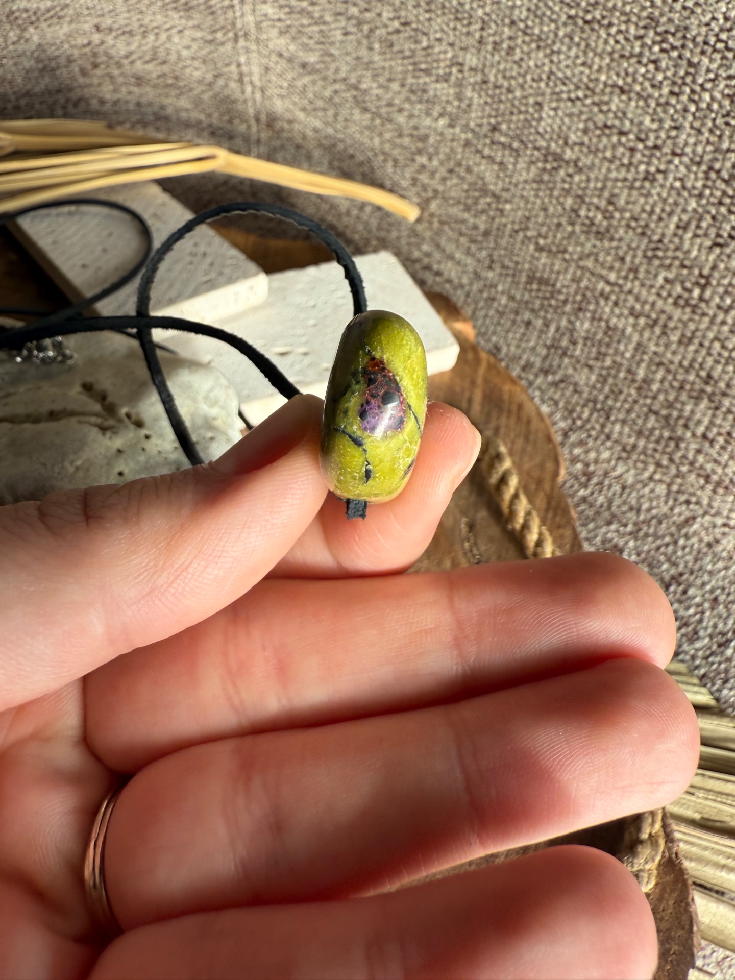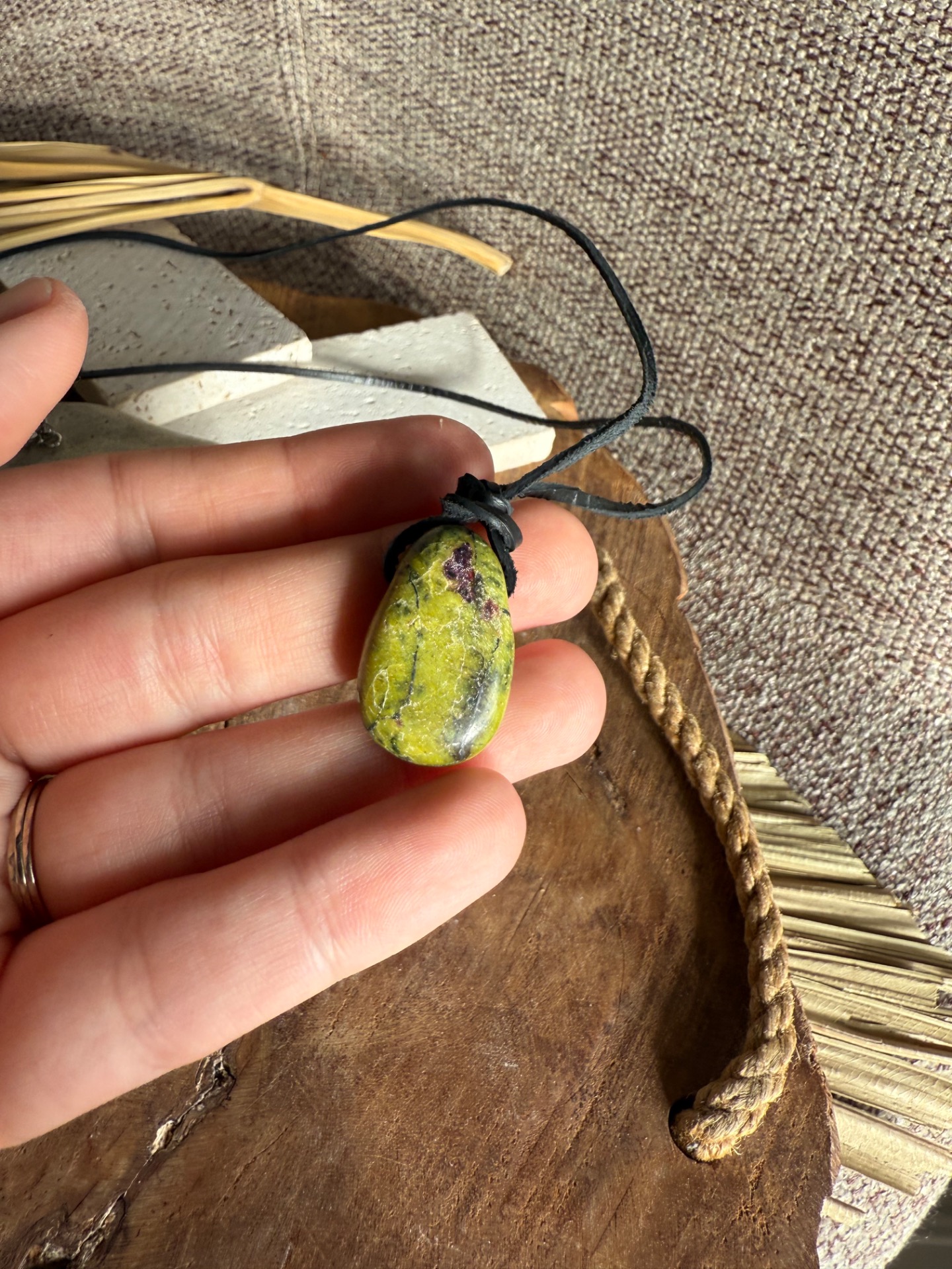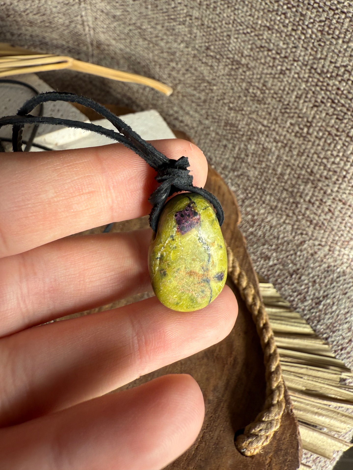 Tento prívesok je vŕtaný priamo cez kameň a zavesený na jednoduchej koženke, čo mu dodáva surový, autentický vzhľad. Je ideálny pre každého, kto hľadá spojenie so zemou, harmóniu a vnútorný balans.
