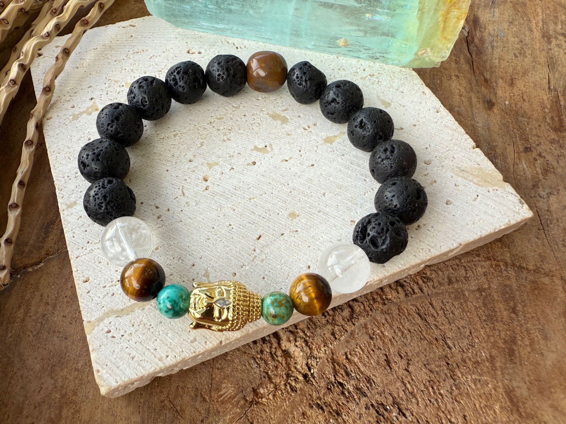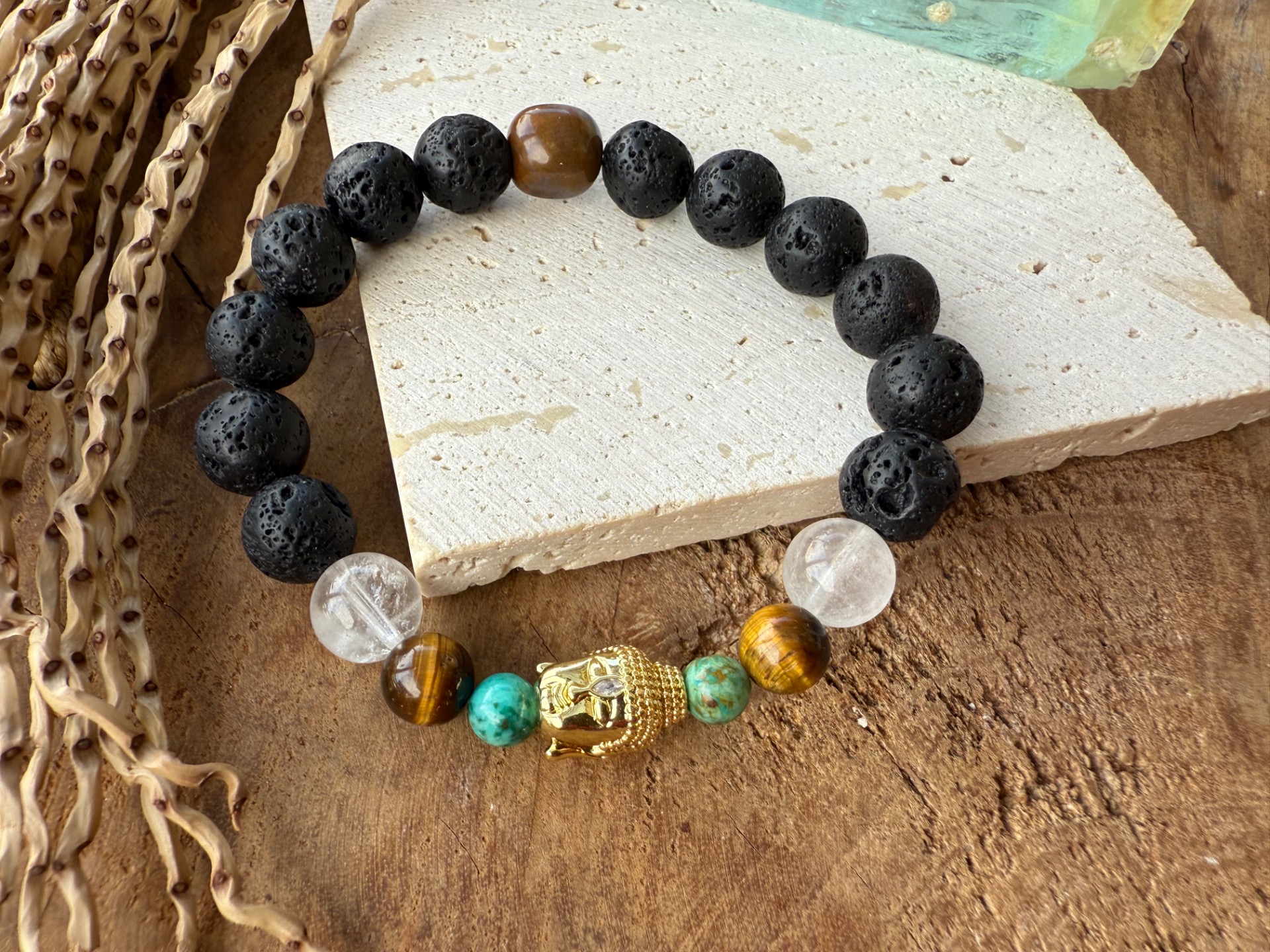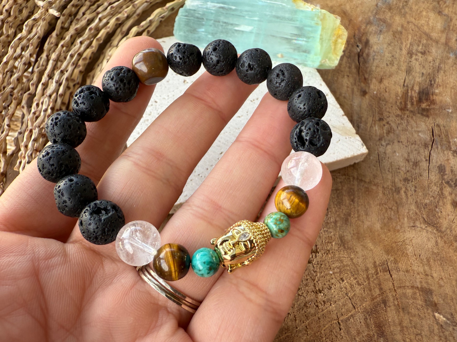 Unikátna kombinácia prírodných minerálov lavový kameň 10 mm, krištáľ mliečny , tigrie oko 8mm, tyrkys peru 6mm.