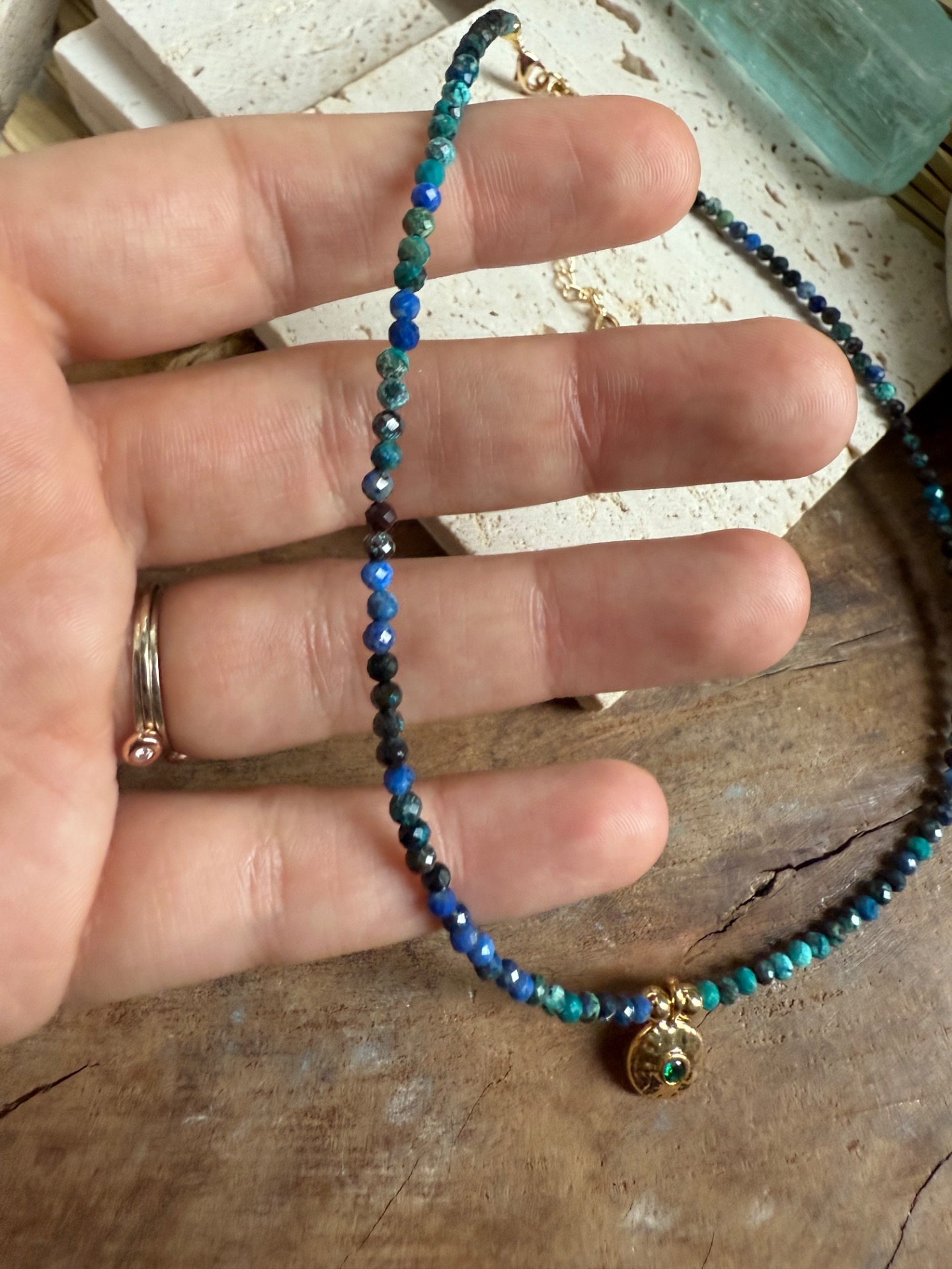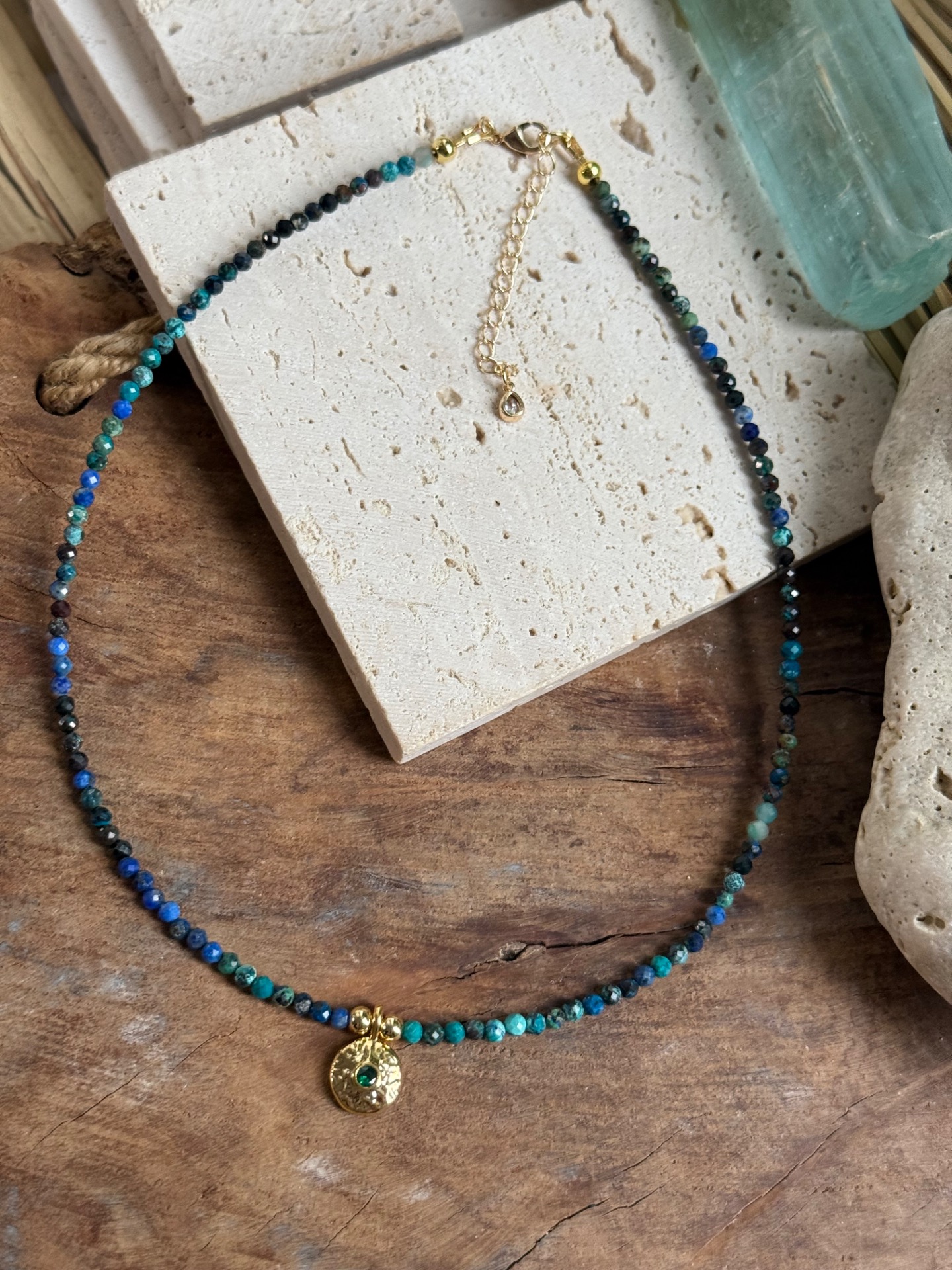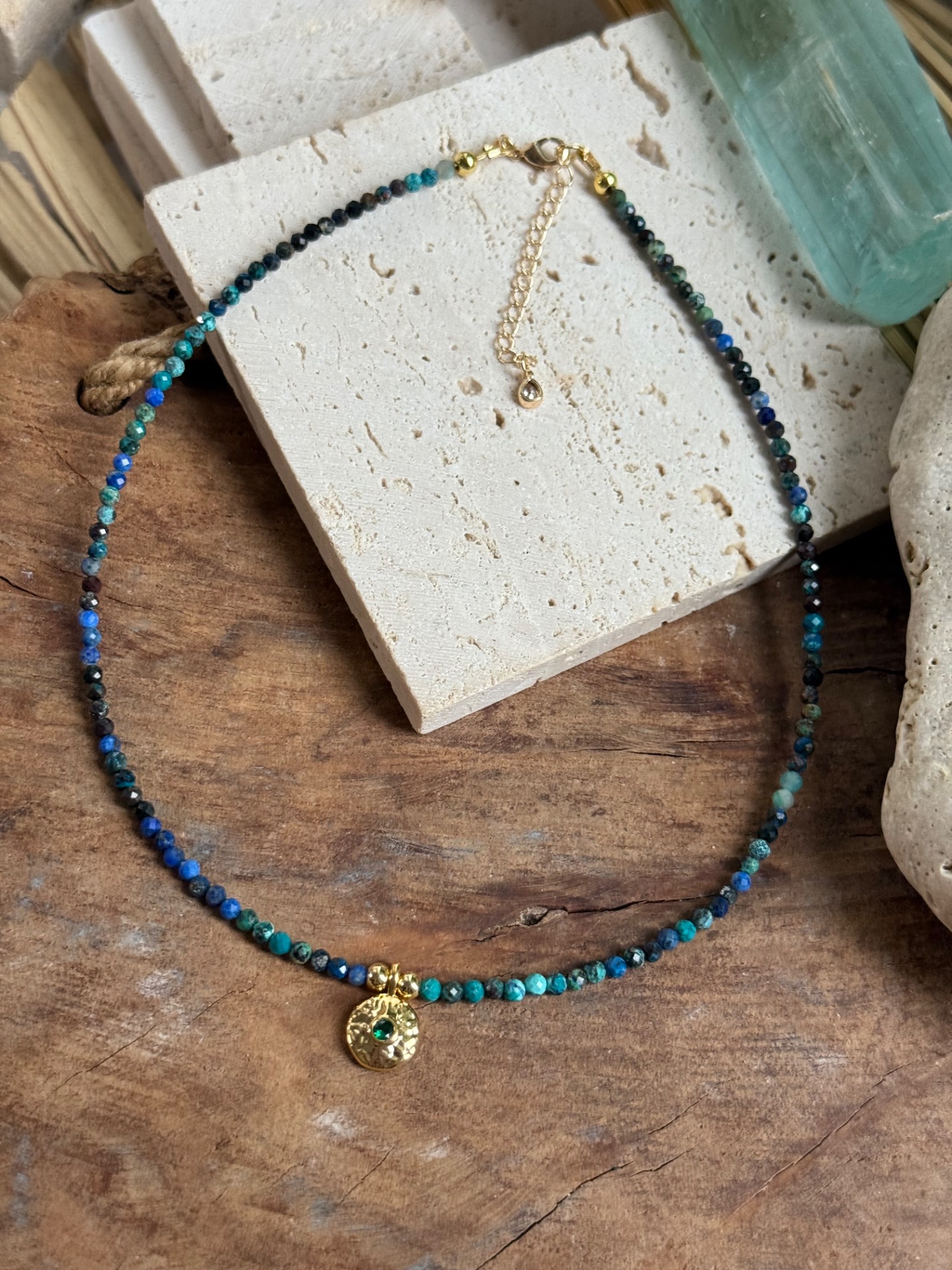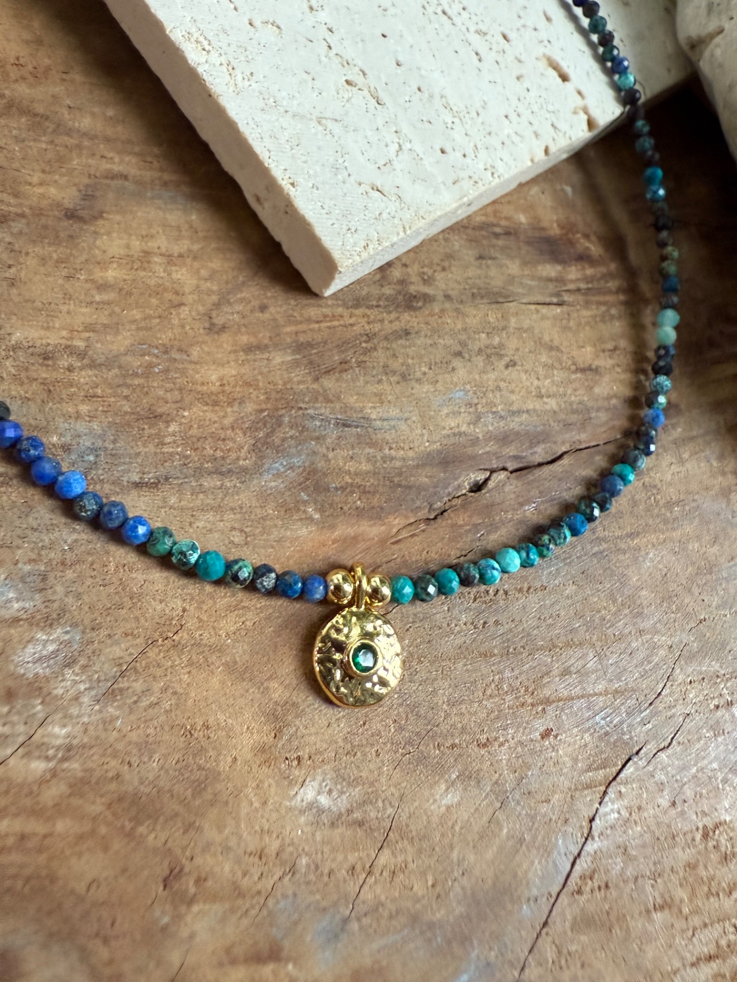 V strede náhrdelníka sa nachádza zlatý medailónik, ktorý pôsobí ako mystický talizman – symbol ochrany, múdrosti a spojenia s vyššími energiami. Zlatý lesk kontrastuje s modro-zelenými odtieňmi chryzokolu, čo vytvára harmonický a vizuálne magický efekt.