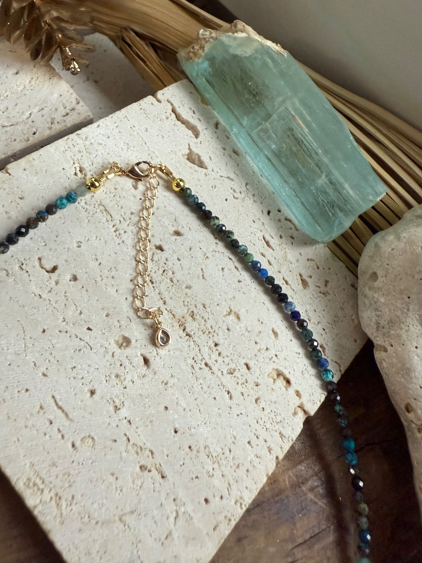 Tento nádherný choker z chryzokolu (2,5 mm fazetový výbrus) je šperkom, ktorý spája jemnú eleganciu s hlbokou duchovnou silou. Každá korálka odráža svetlo a energiu, ktorá upokojuje myseľ, otvára srdce a prehlbuje vnútorné vedenie.