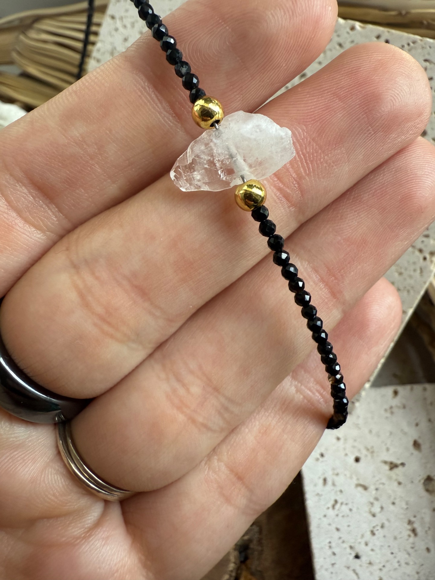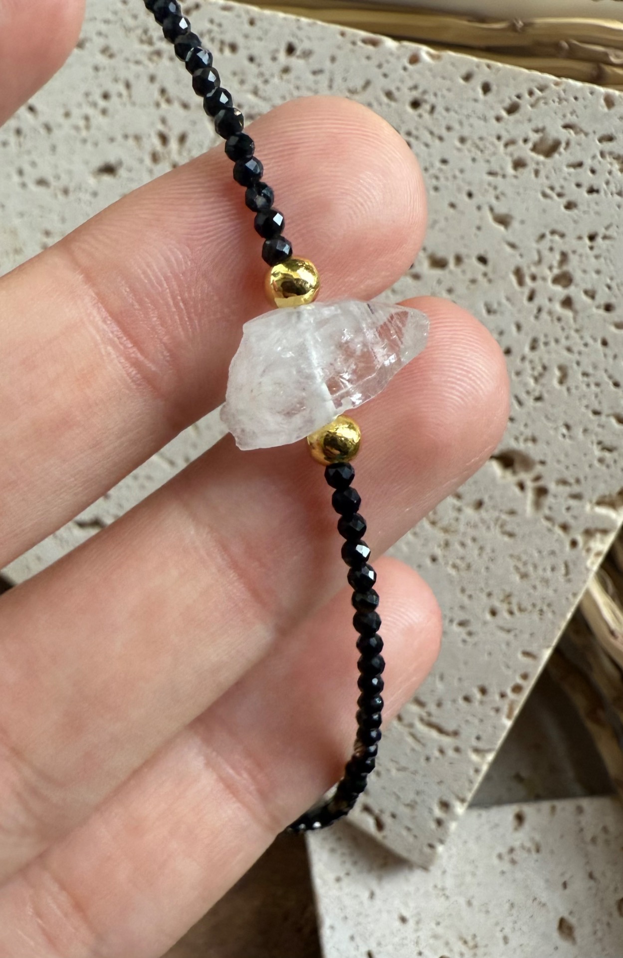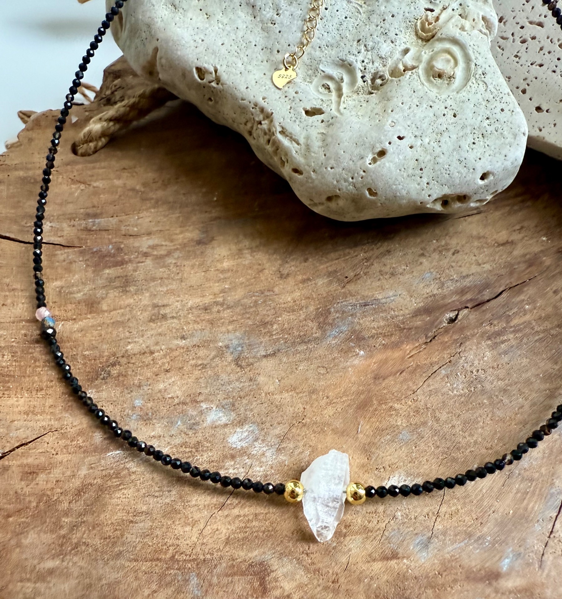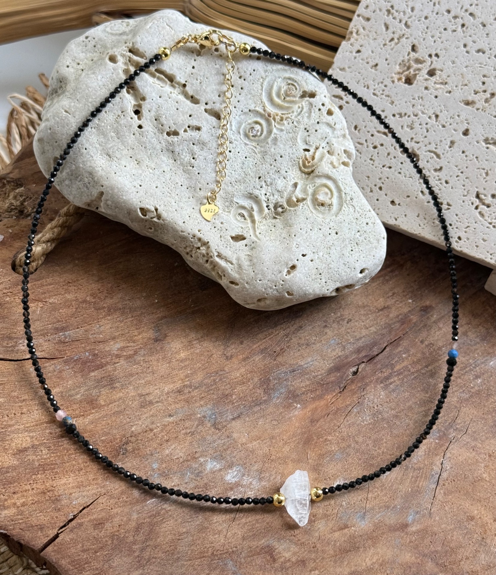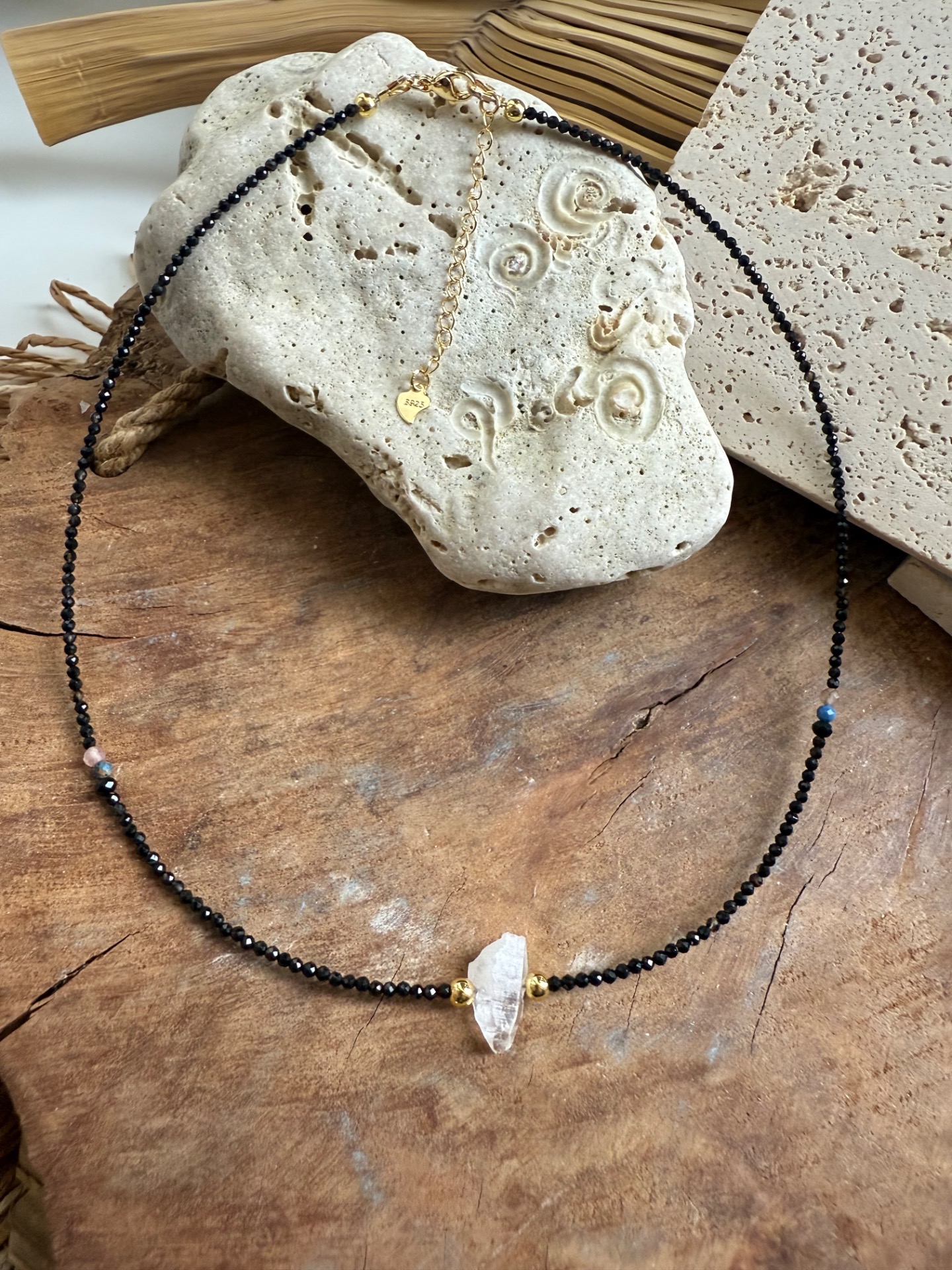 Objavte rovnováhu, jemnosť a energetickú ochranu v tomto exkluzívnom náhrdelníku, ktorý spája eleganciu drobných kameňov s mystickou silou lemurského krištáľu.