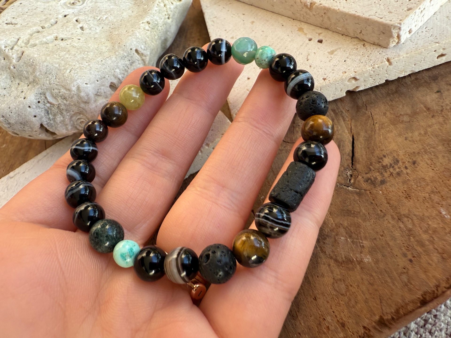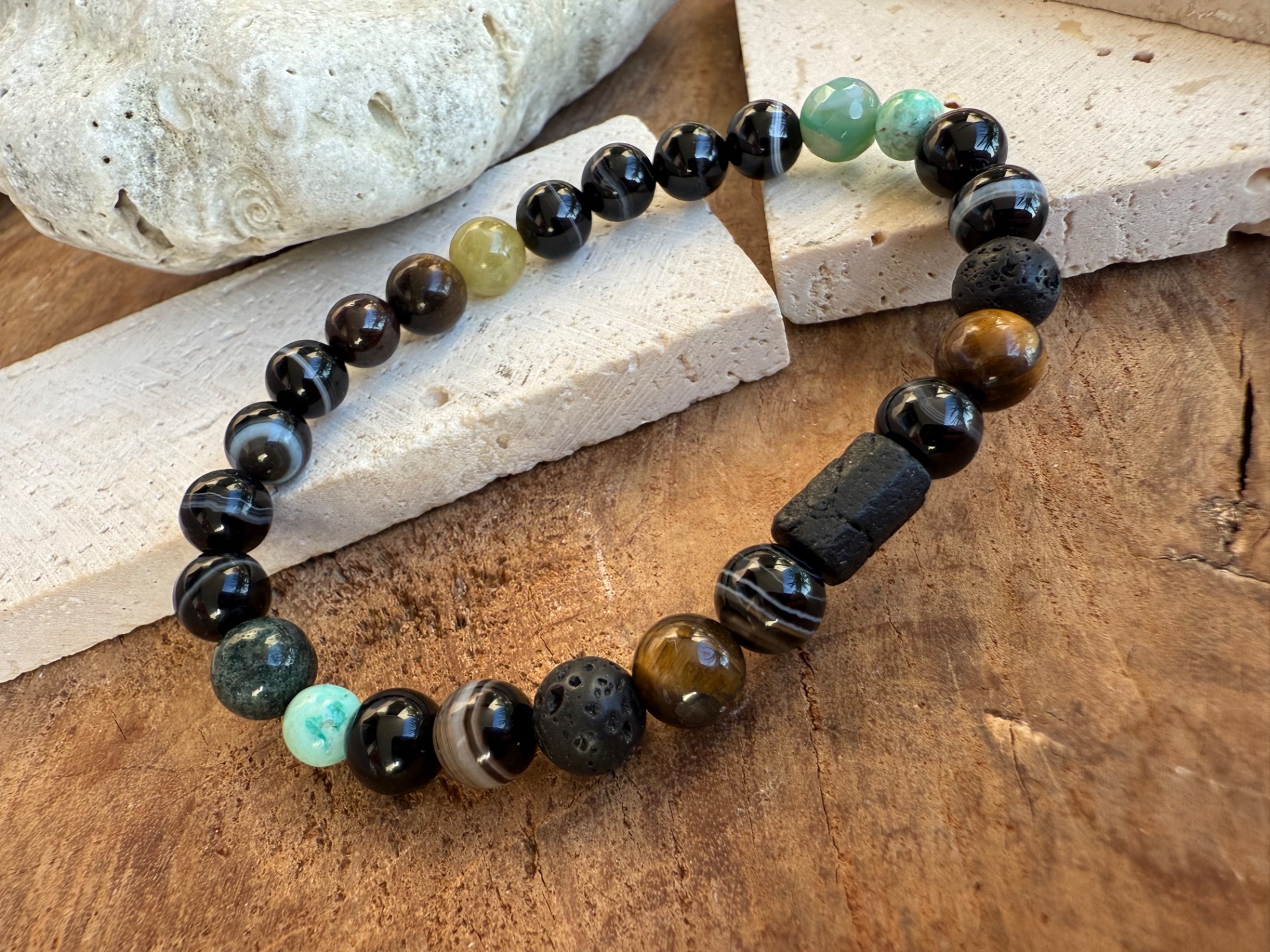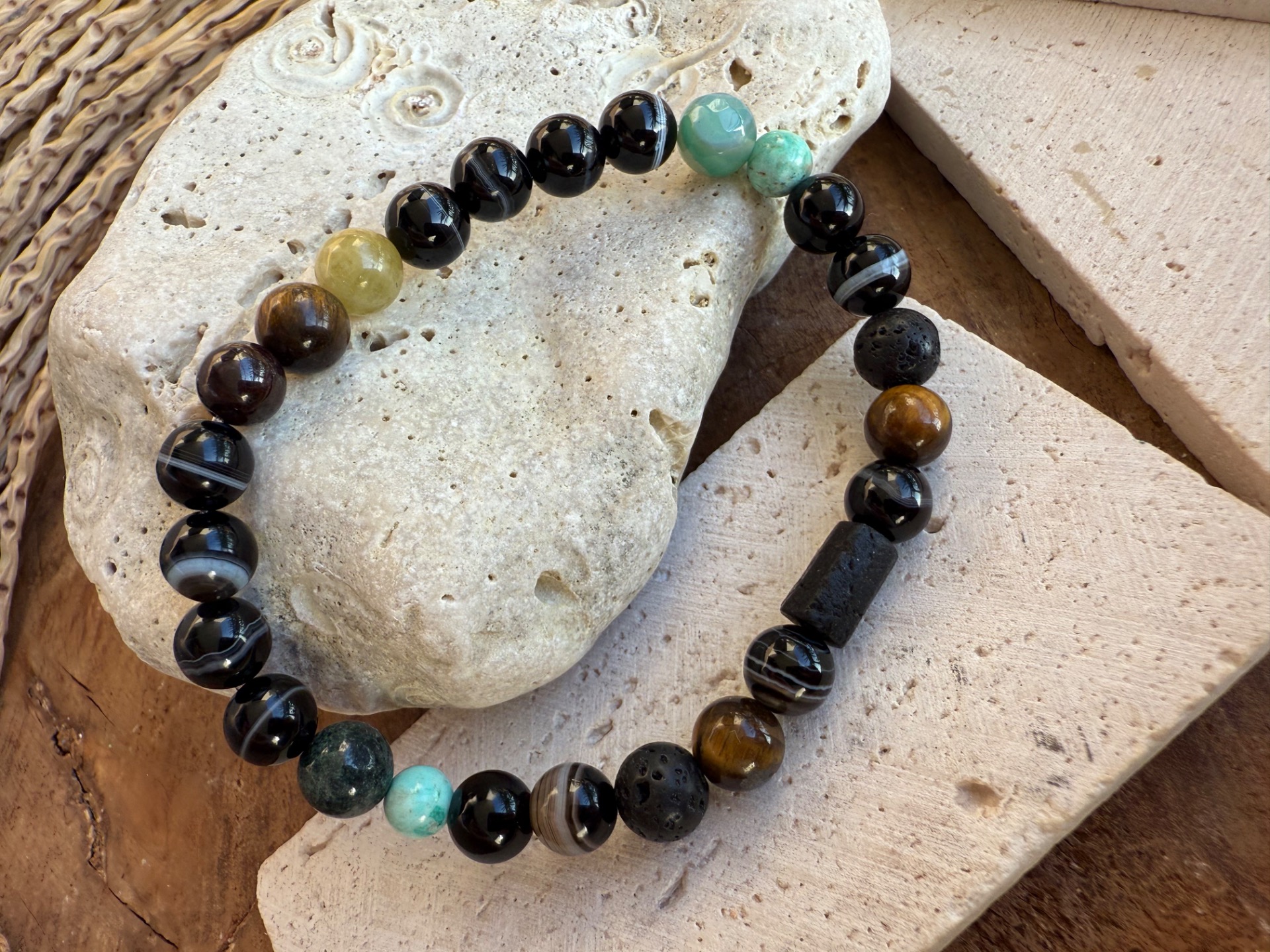Silný pánsky náramok vytvorený z kombinácie ochranných minerálov Onyx, Achát, Jadeit a dominantného Turmalín v surovej podobe. Táto kombinácia je symbolom stability, ochrany a vnútornej sily.