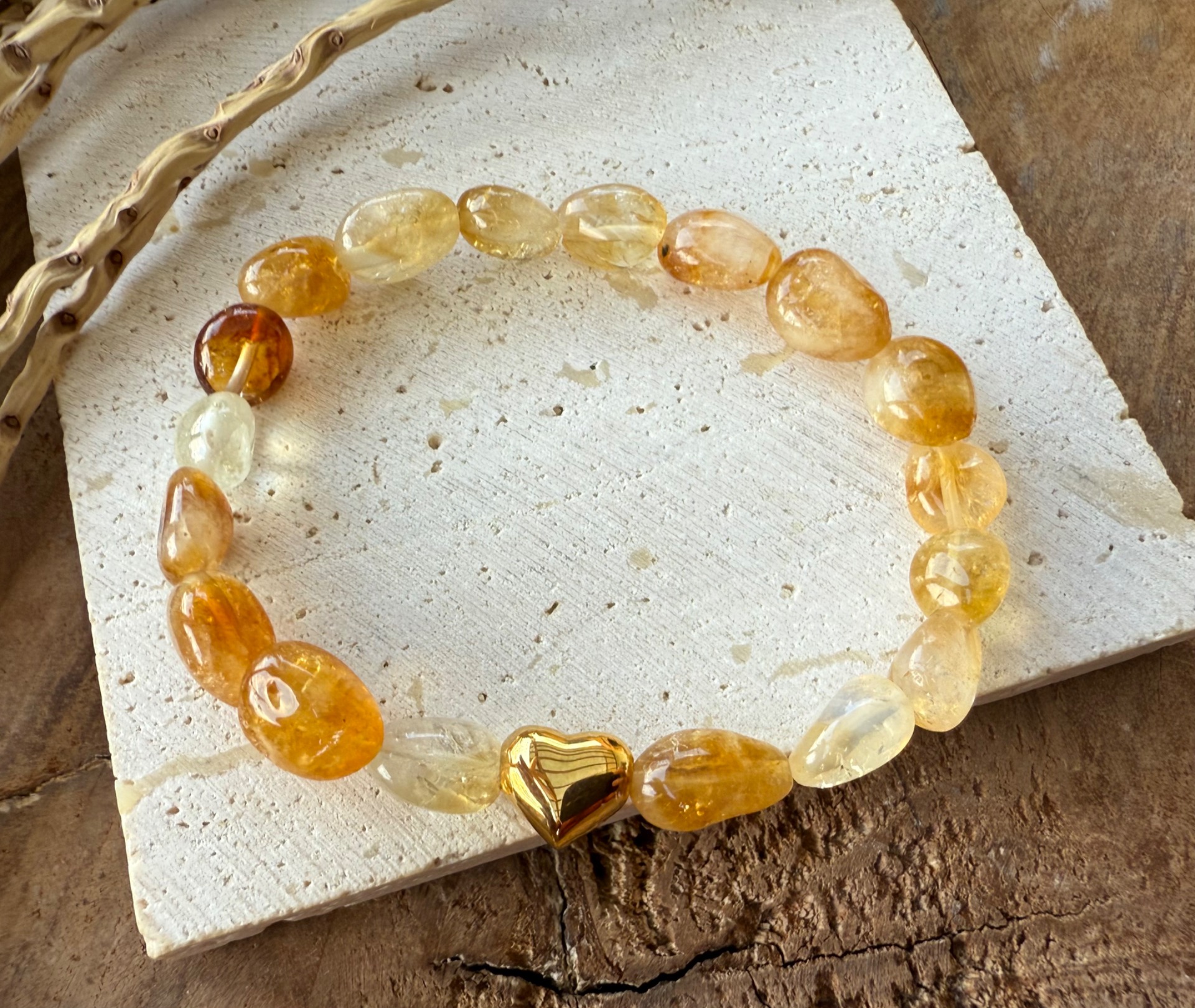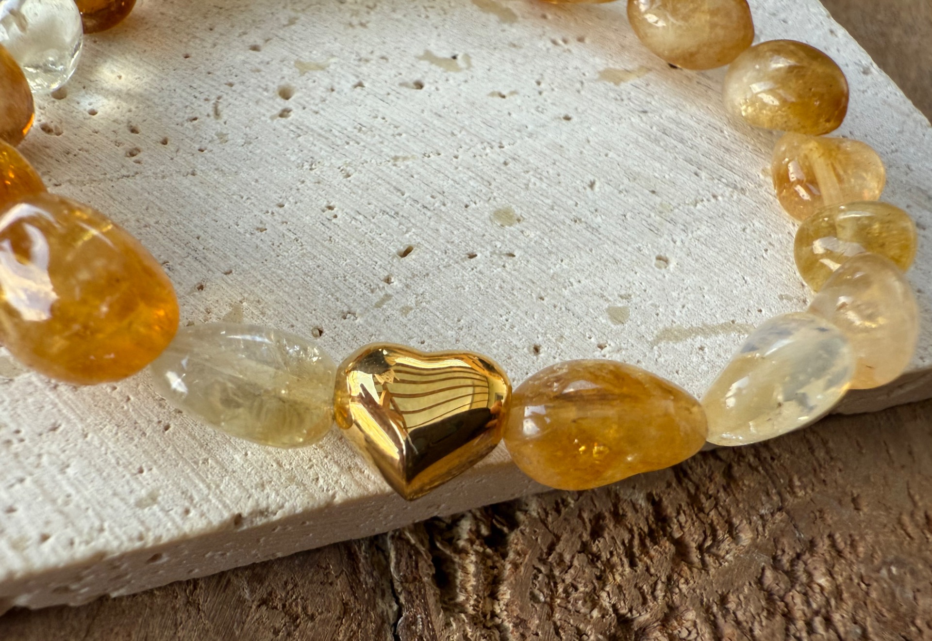 Náramok z minerálu citrín nugety nepravdidelné , doplnený nerezovým srdiečkom gold.