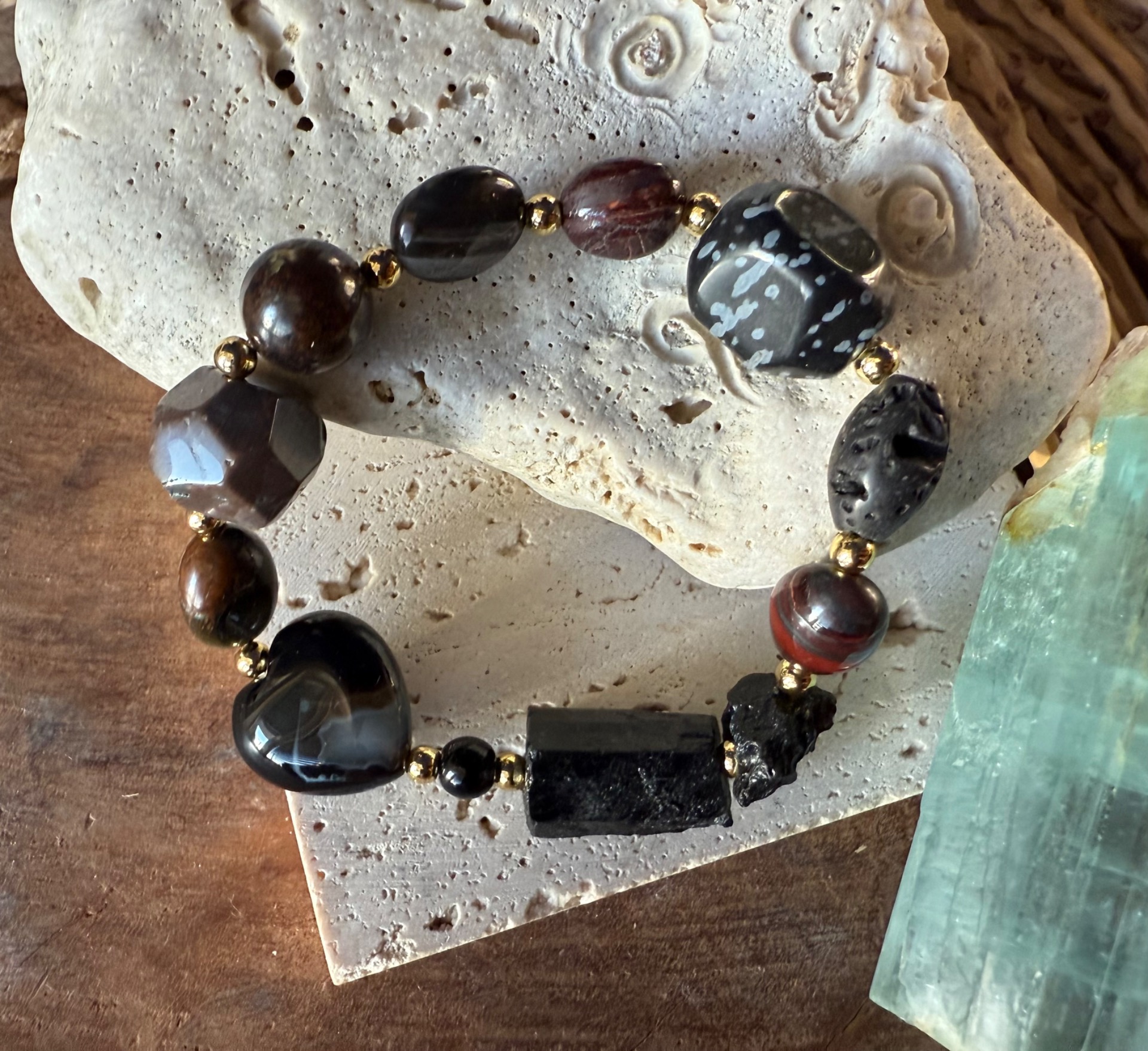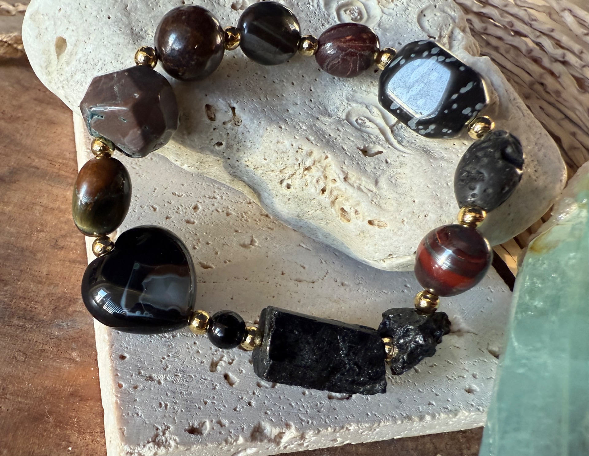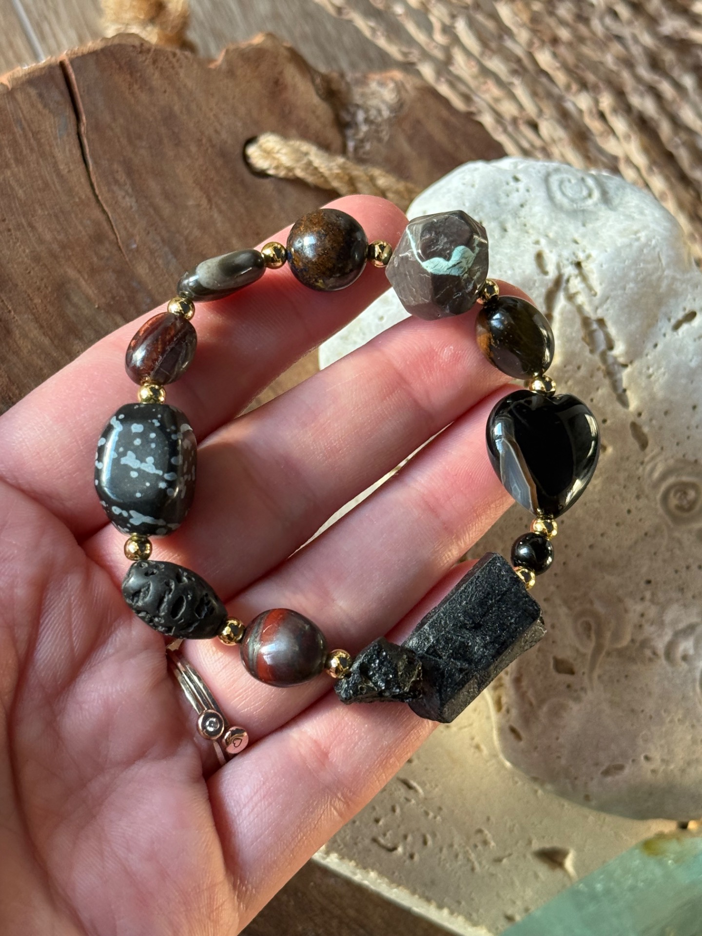 Silný a energeticky výrazný boho náramok v cik-cak štýle kombinuje ochranné minerály, ktoré vytvárajú osobný štít proti negatívnym energiám a posilňujú vnútornú silu. Každý kameň je oddelený nerezovou zlatou guličkou 4 mm, čím vzniká harmonický rytmus a elegantný vzhľad.