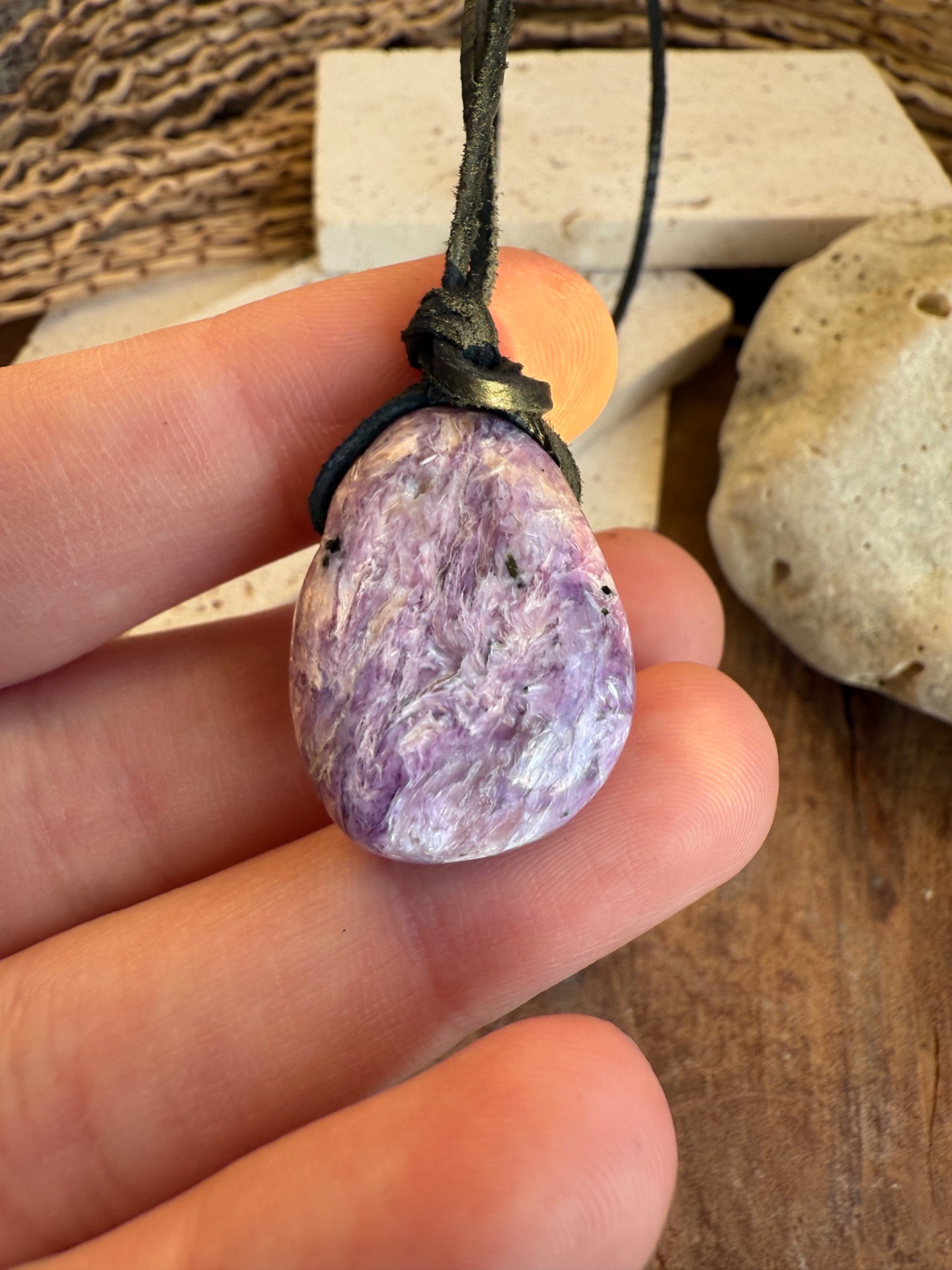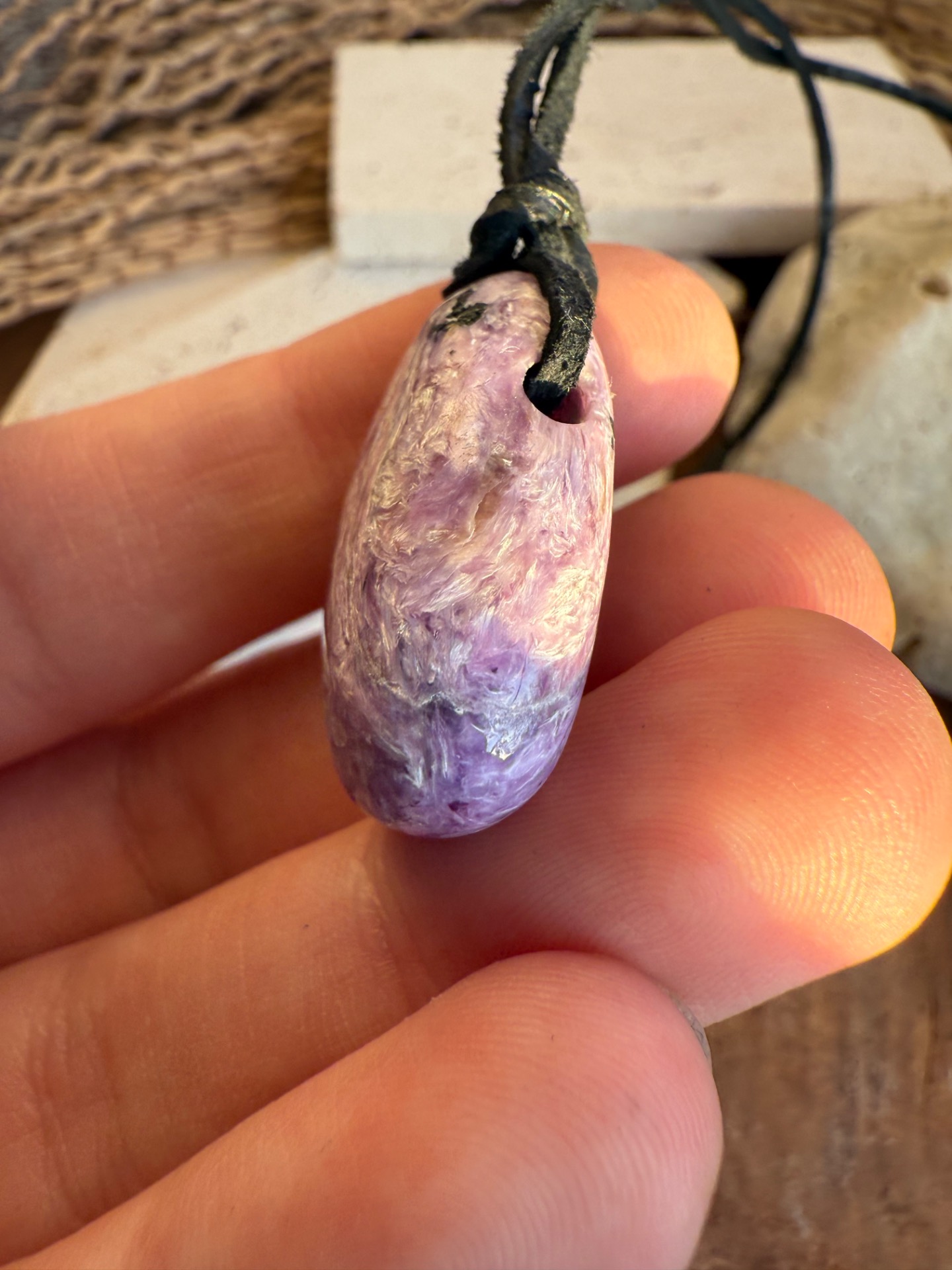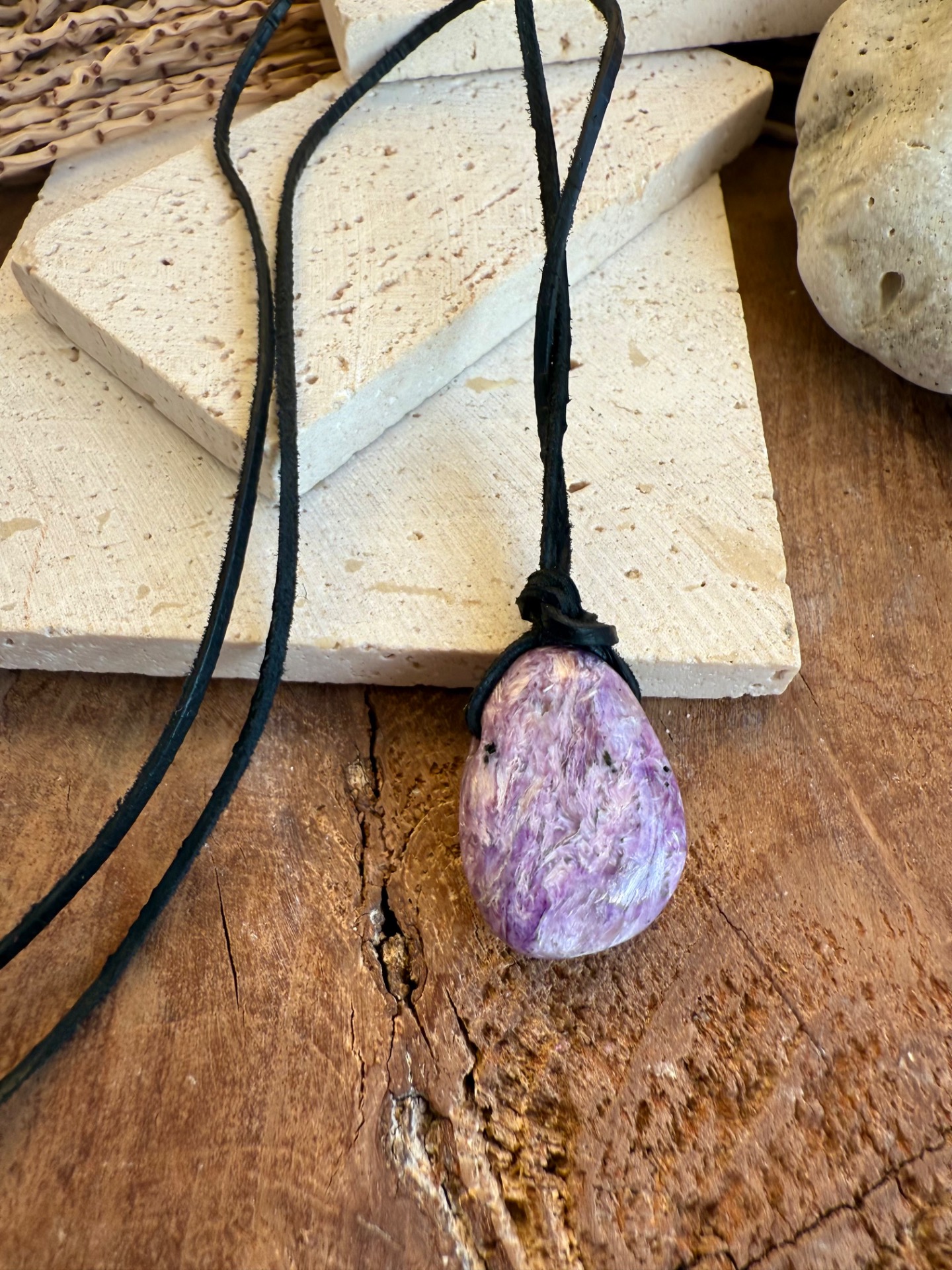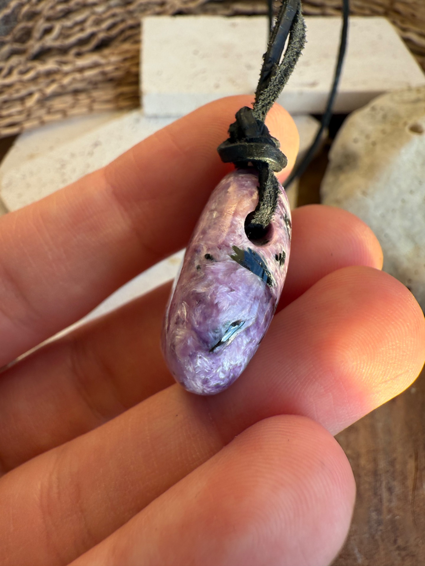 Prívesok vŕtaný z minerálu čaroit na kožennej šnúrke