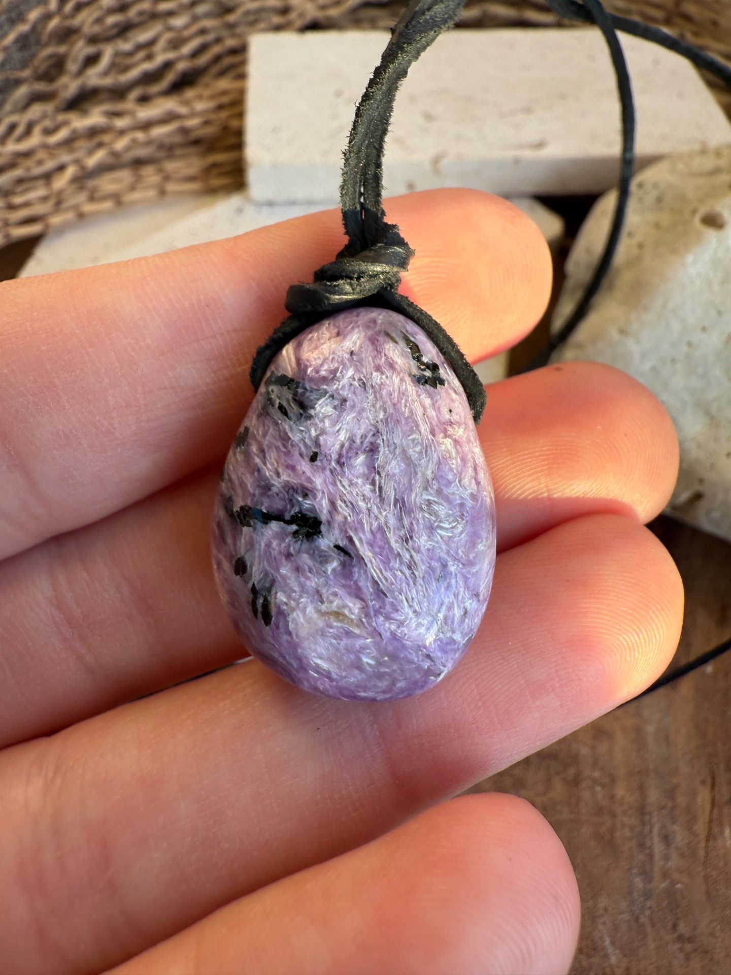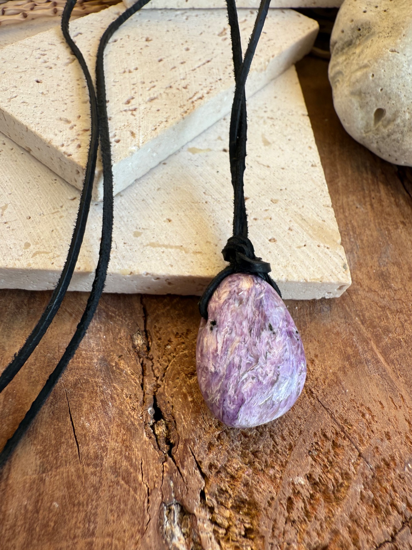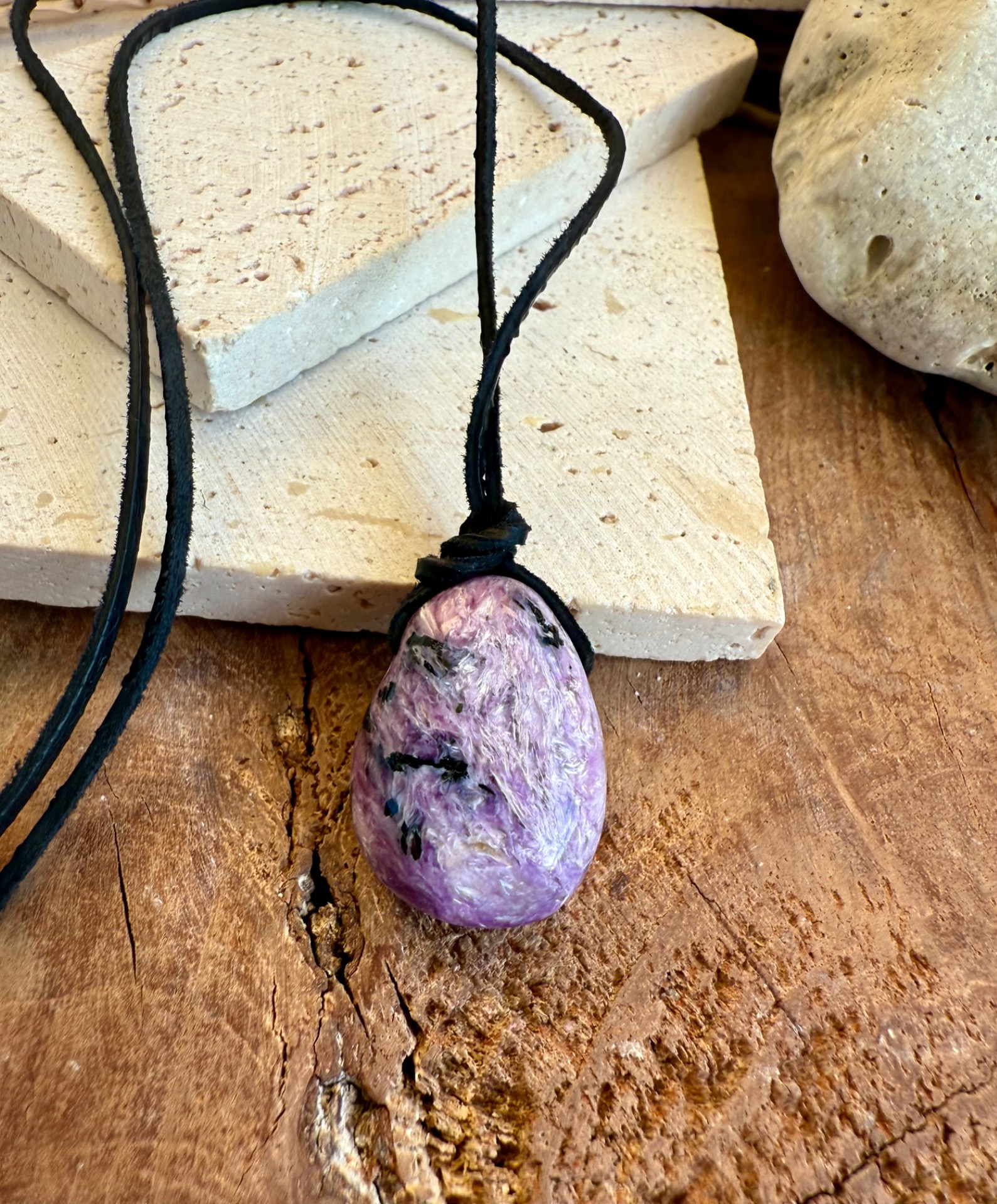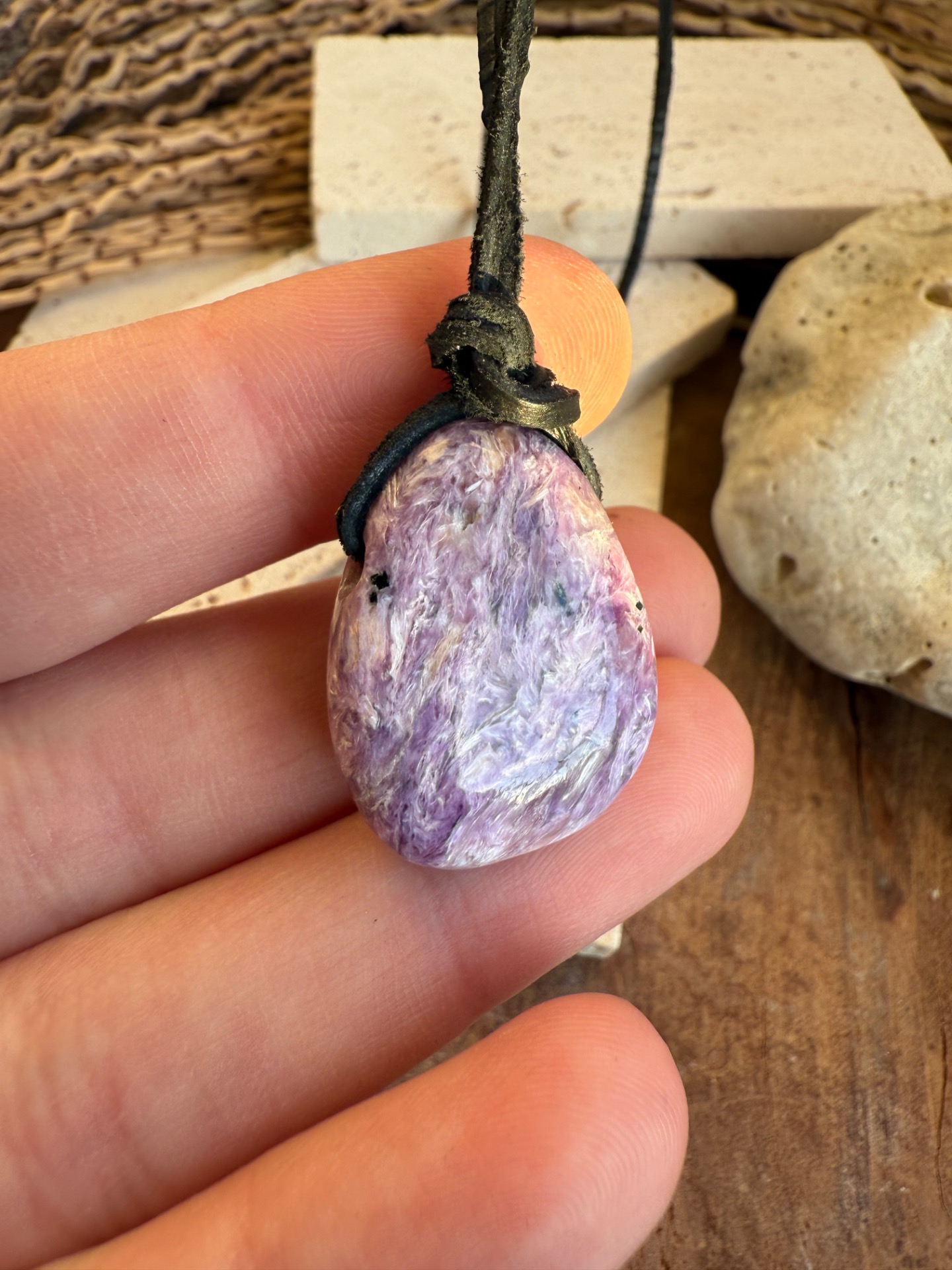 Prívesok vŕtaný z minerálu čaroit na kožennej šnúrke